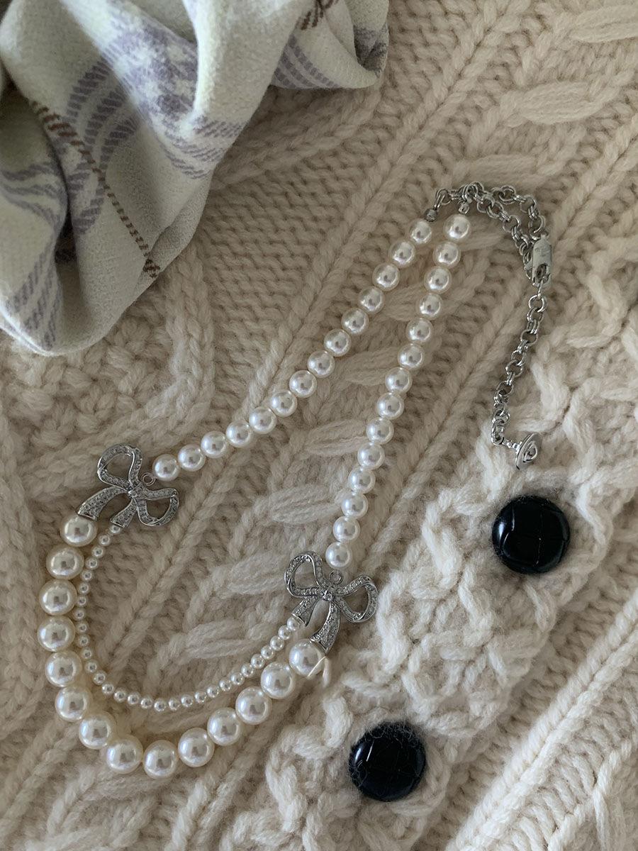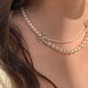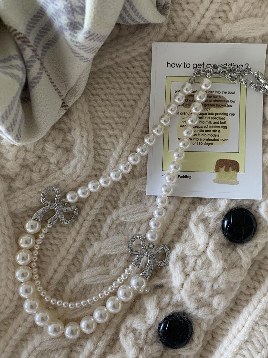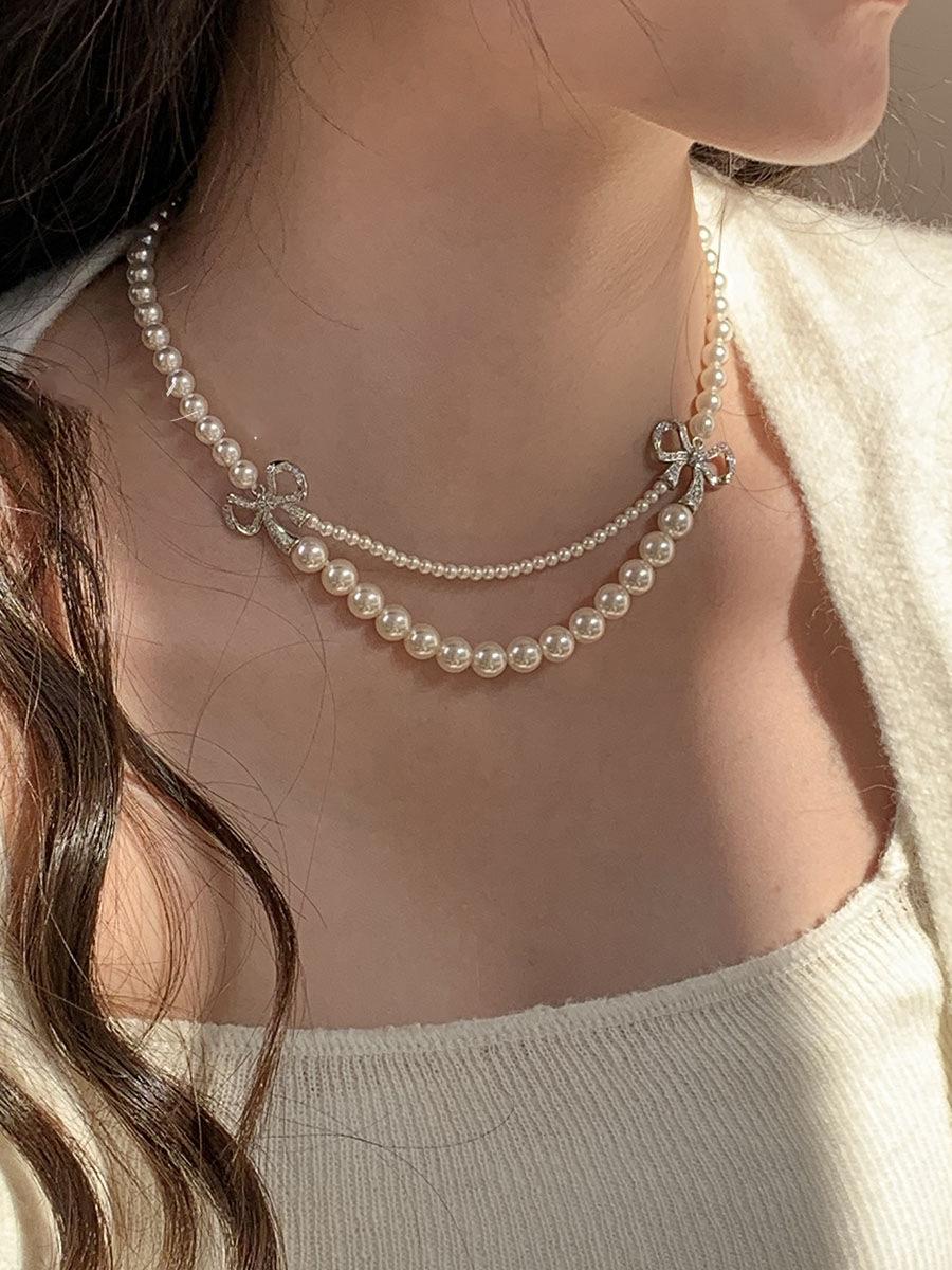 Plata diamante Lazo Doble capa Perla Cadena clavícula Moda Collar Exquisito Entrada Lujo Accesorios Collar de Alta Gama Mujeres