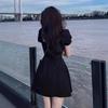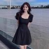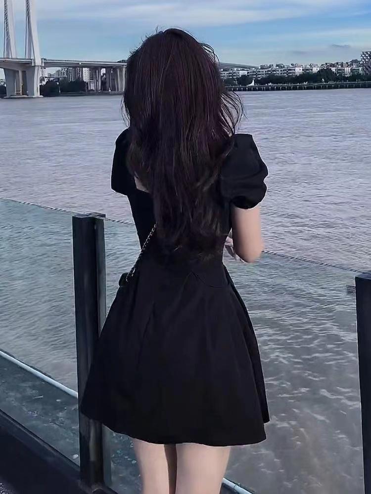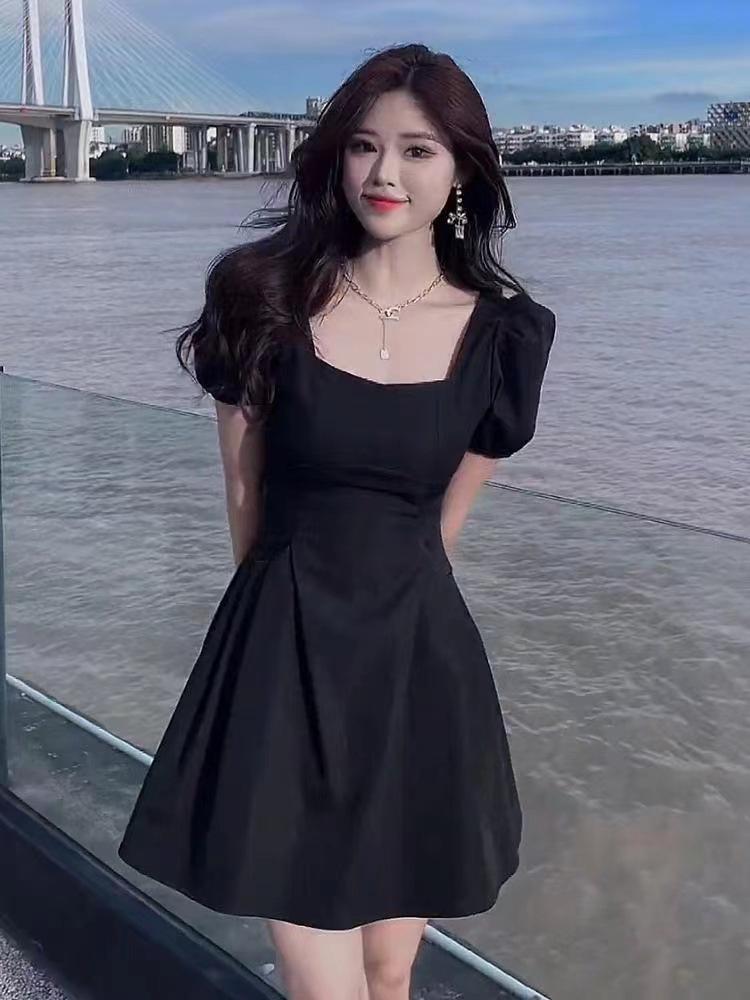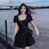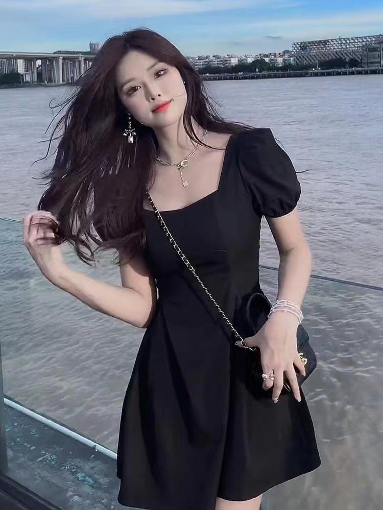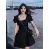 Vestido negro estilo Hepburn de alta gama de verano 2024, nuevo estilo francés, cuello cuadrado retro, mangas abullonadas, cintura dulce y picante.