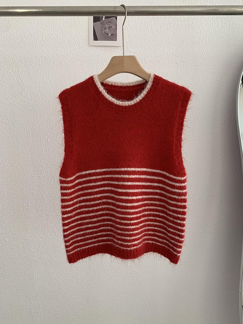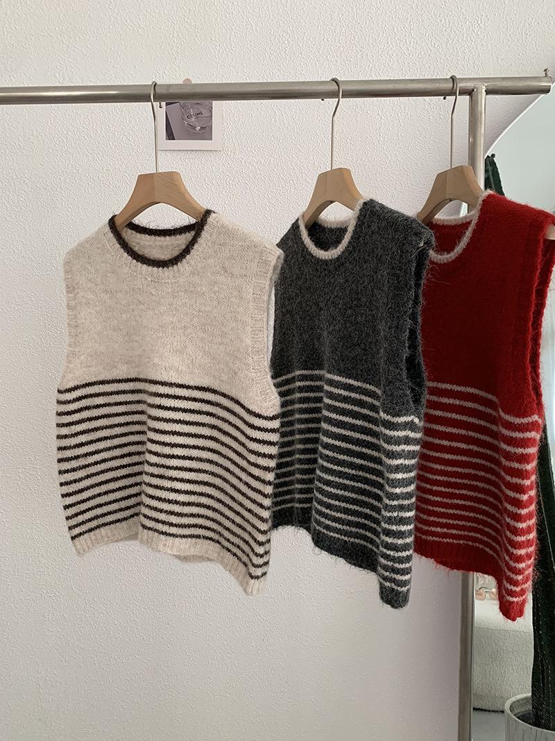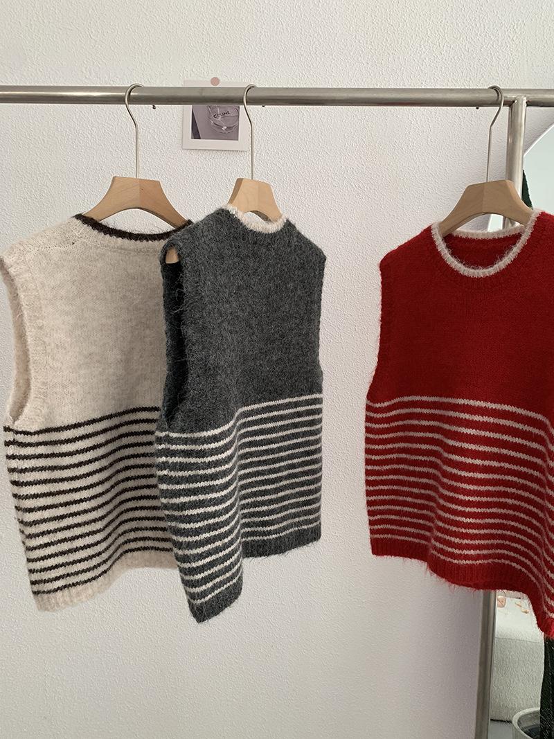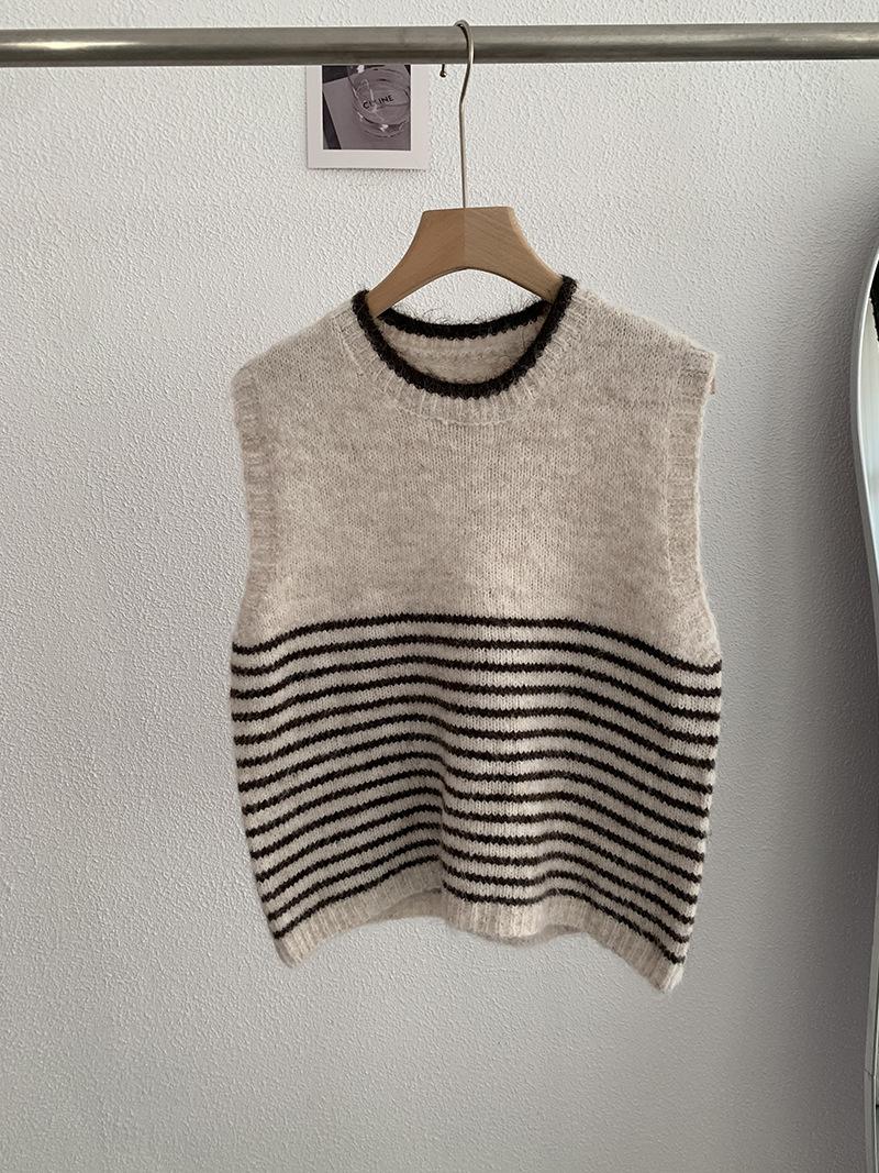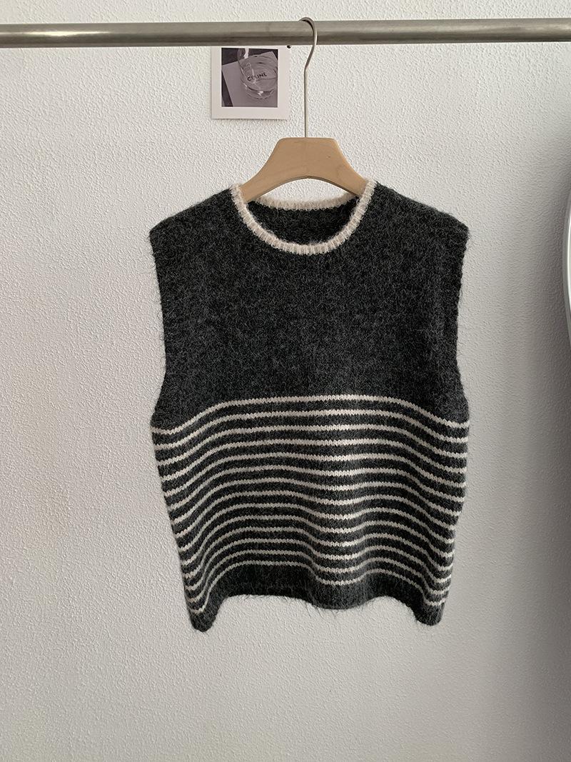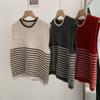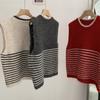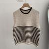 Omalai Chaleco de Punto sin Mangas con Cuello Redondo y Rayas en Contraste Principios de Otoño Capa Superior Versátil Coreana Foto Real 4037
