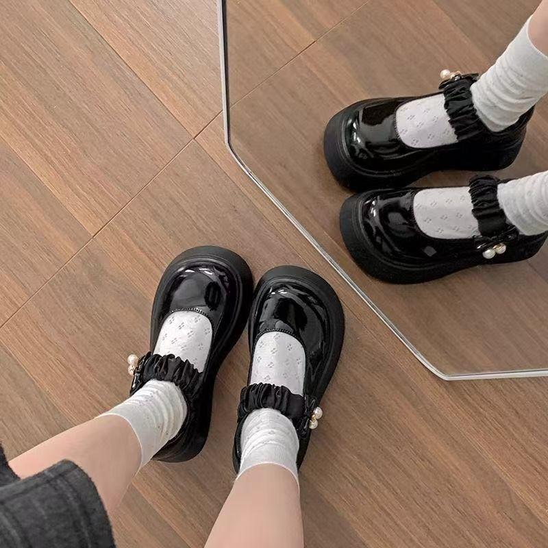 Zapatos Mary Jane Negros Franceses de Suela Gruesa de Cuero Pequeño para Mujer 2025 Nuevo Estilo de Primavera con Falda Punta Redonda Zapatos de Tacón Grueso con Perlas