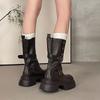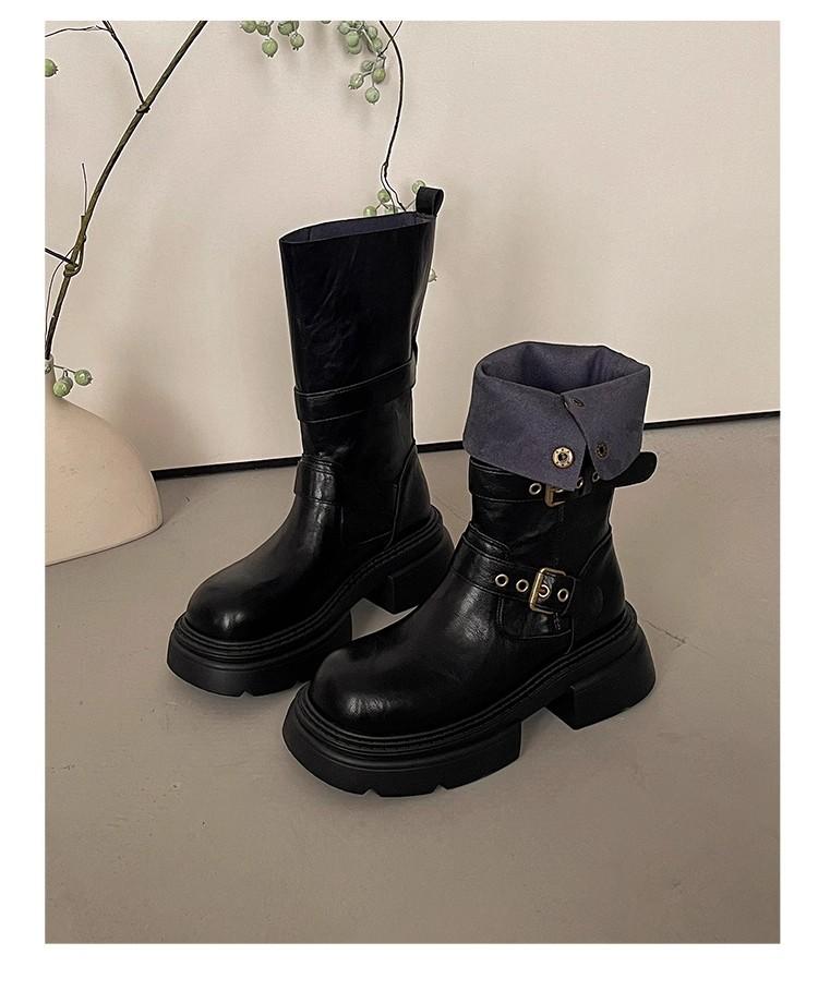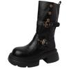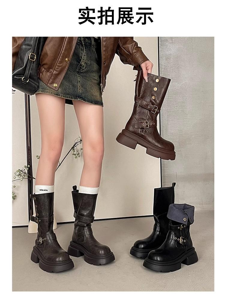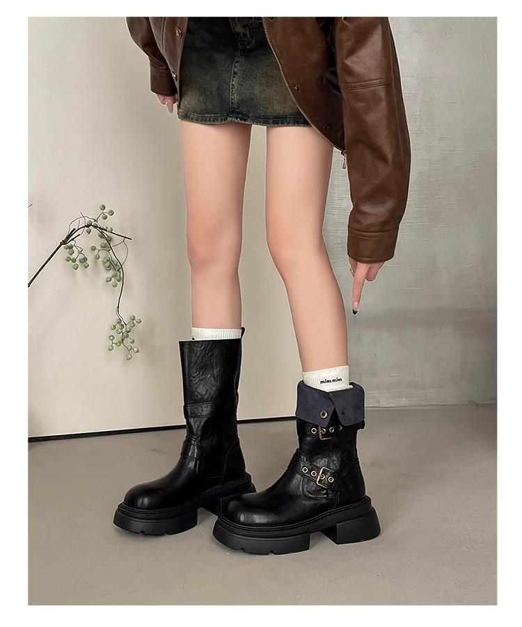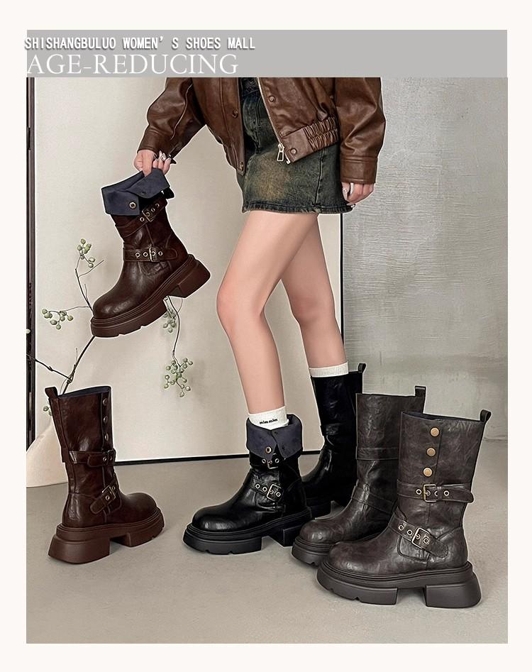 Botas de Suela Gruesa para Mujer 2024 Otoño e Invierno Nuevas Botas Retro de Ante de Media Caña Hebilla de Cinturón Dos Formas de Uso Botas Vaqueras del Oeste