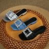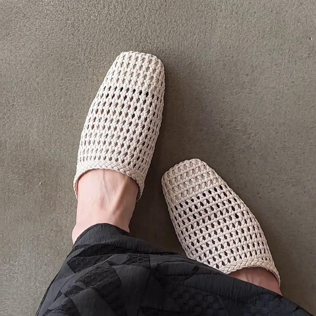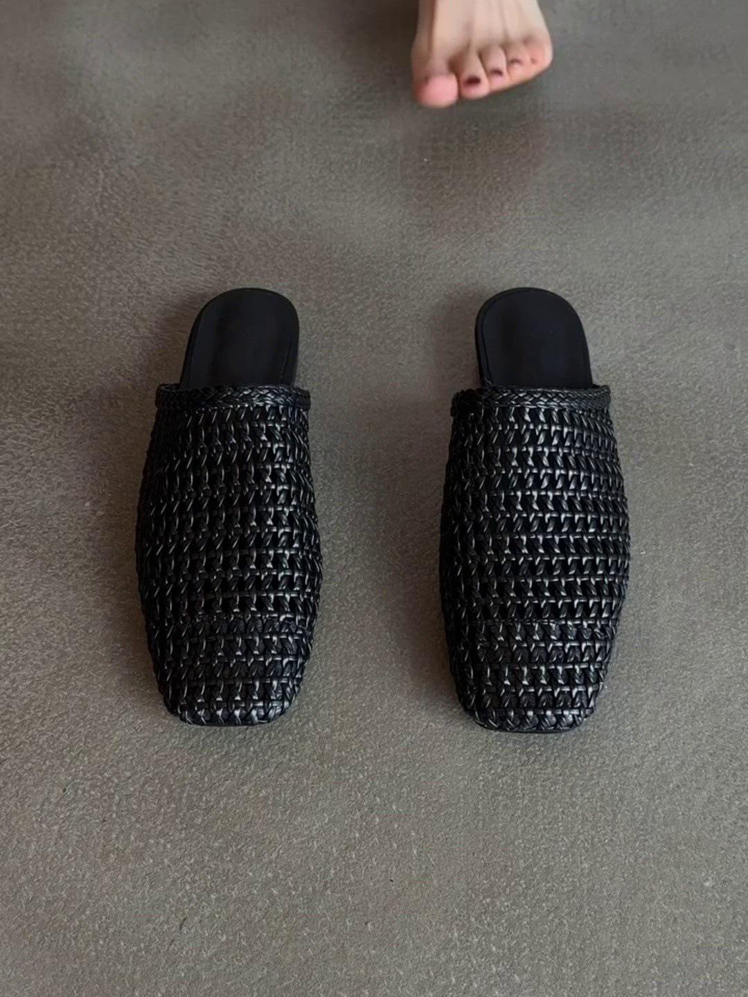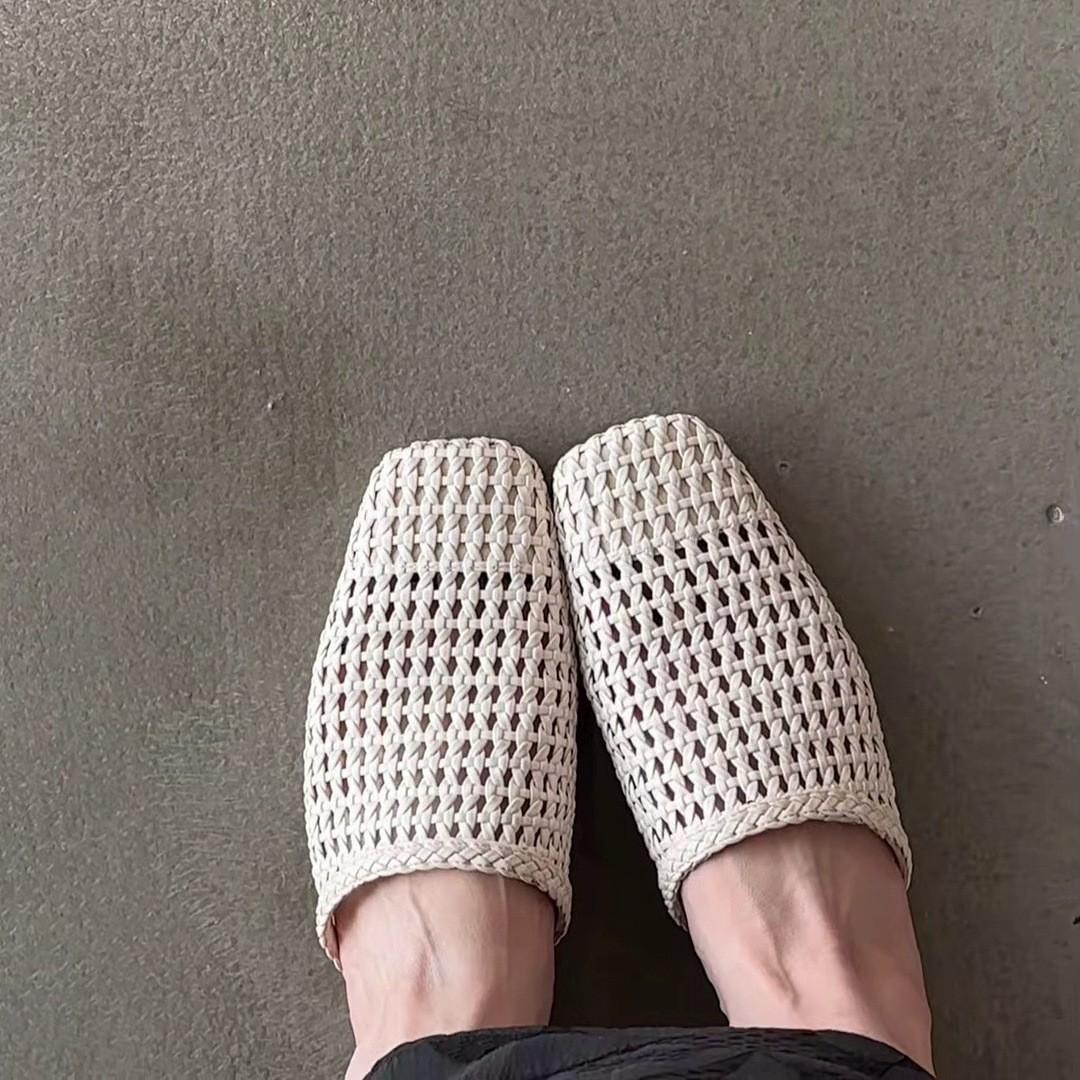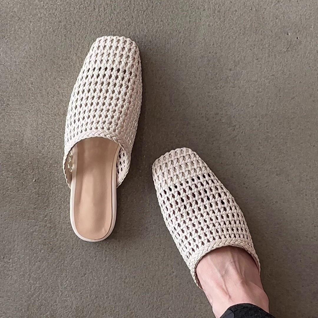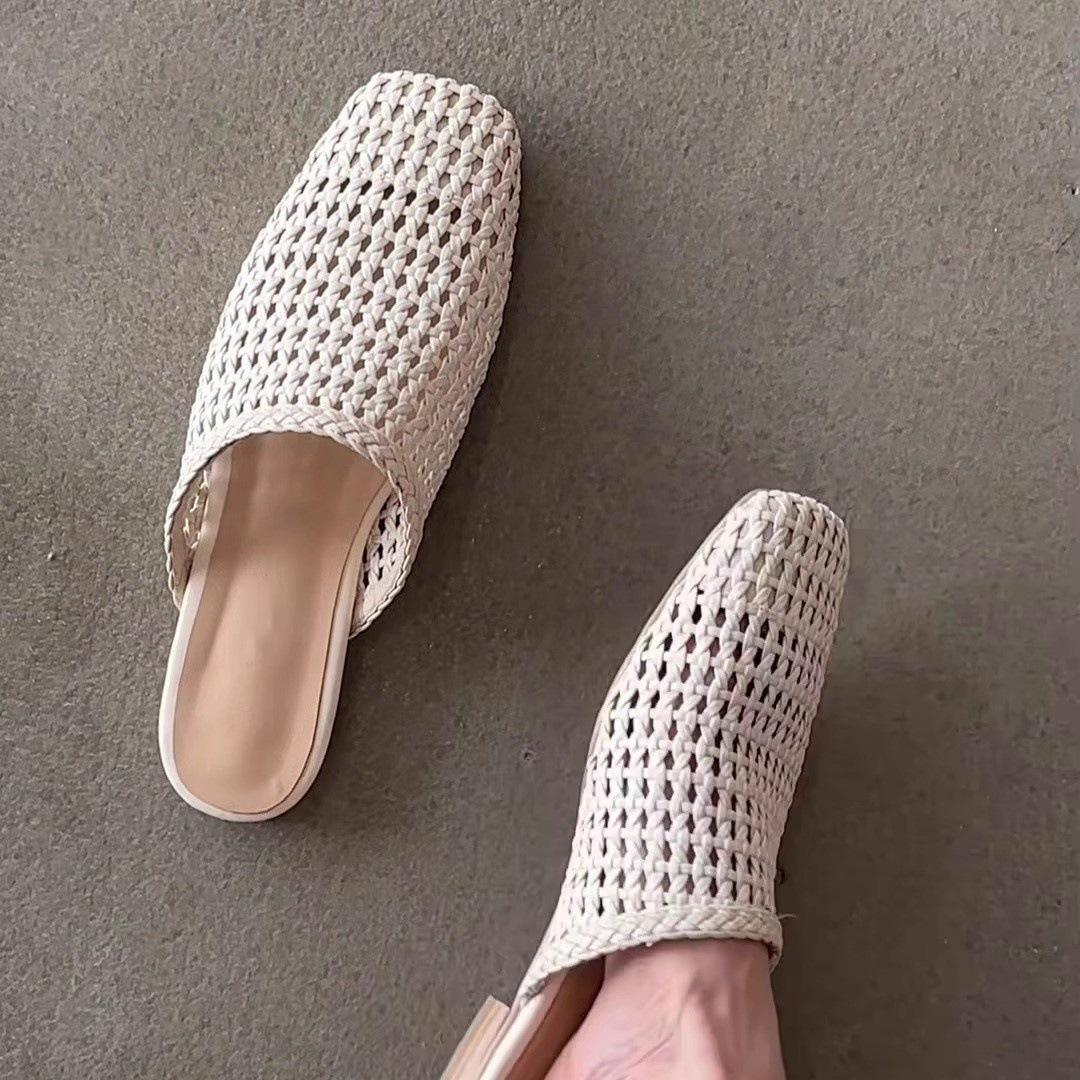 Zapatillas de verano planas de punta cuadrada hueca tejidas de estilo nuevo 2025 para mujer, sandalias de moda para personas perezosas