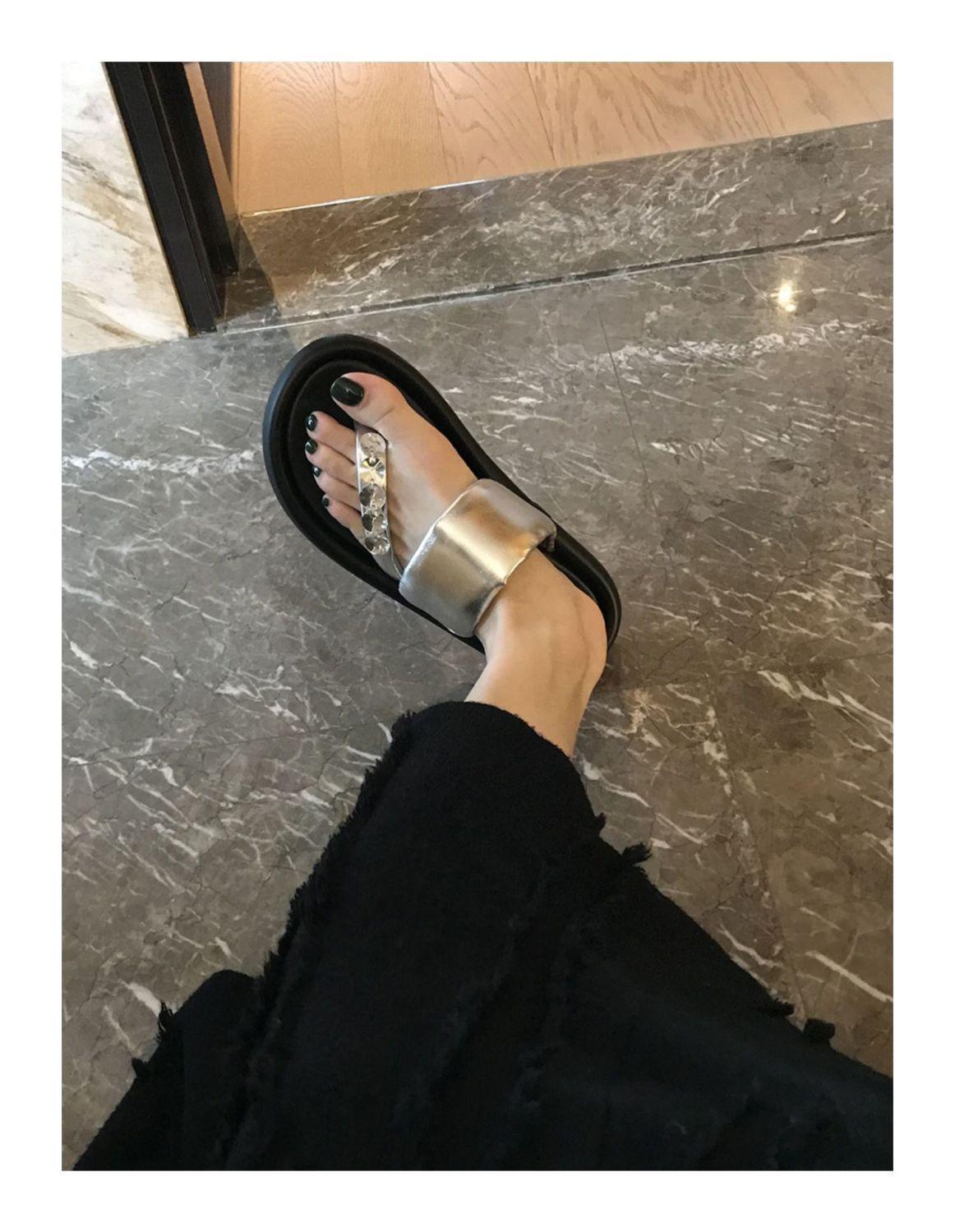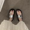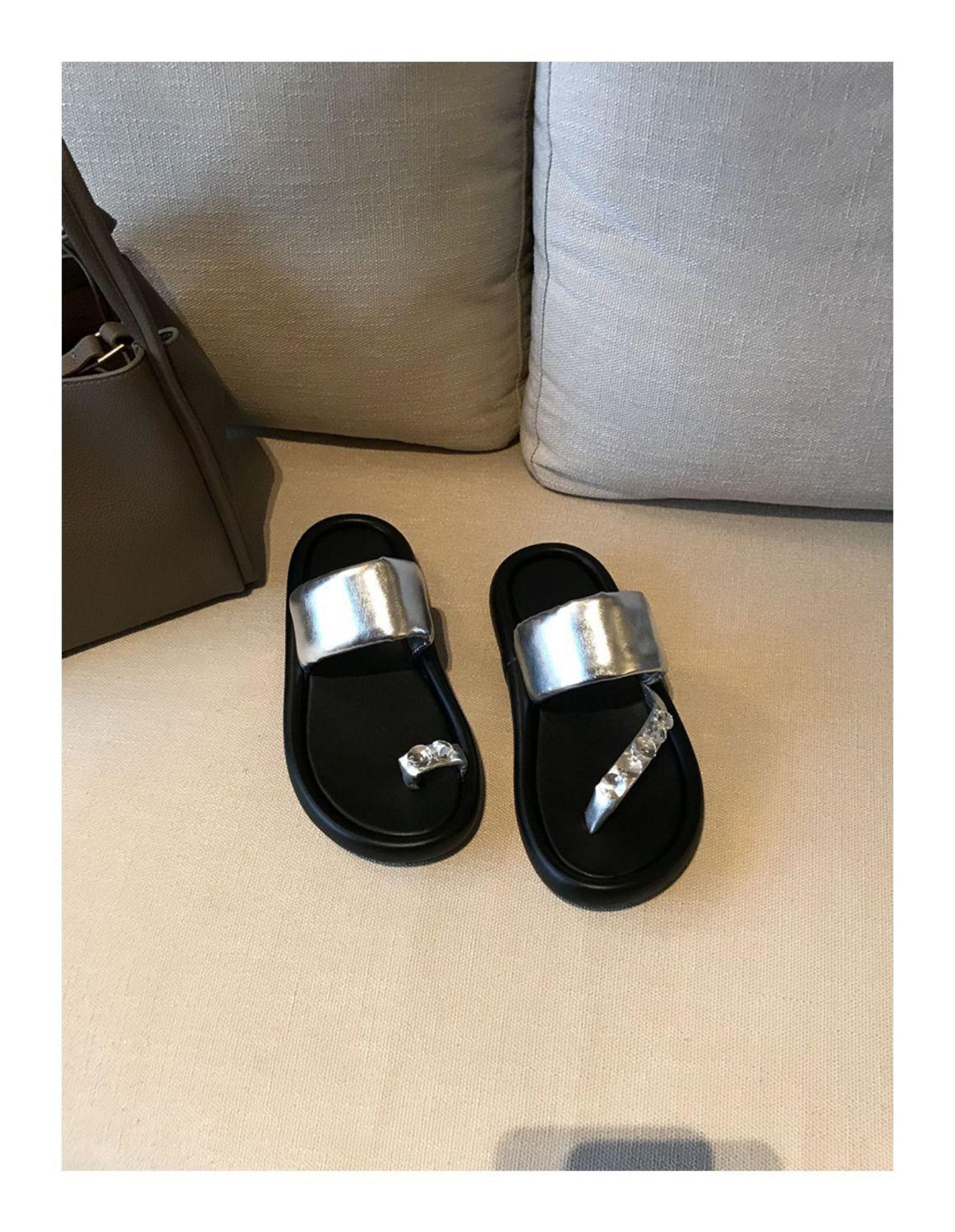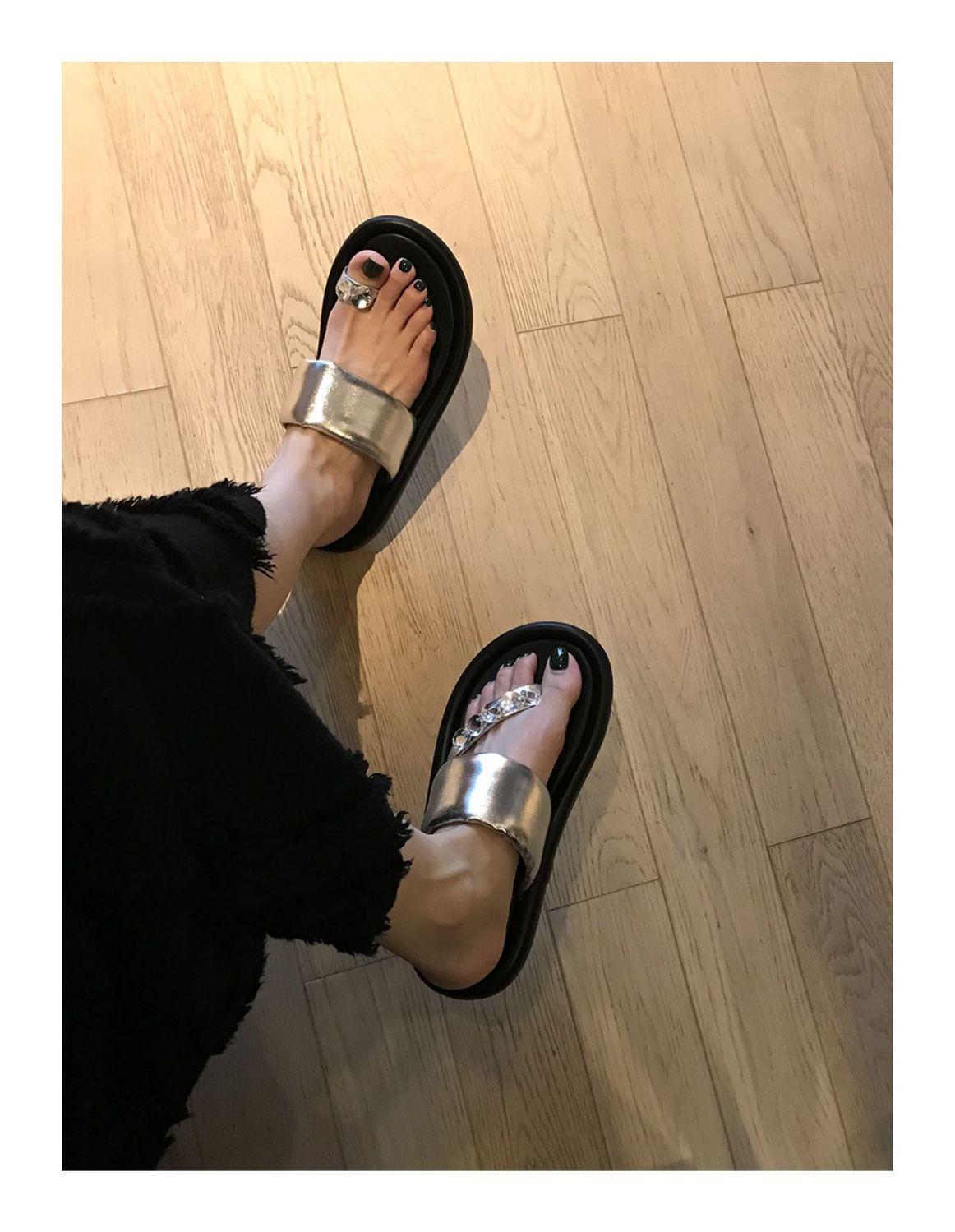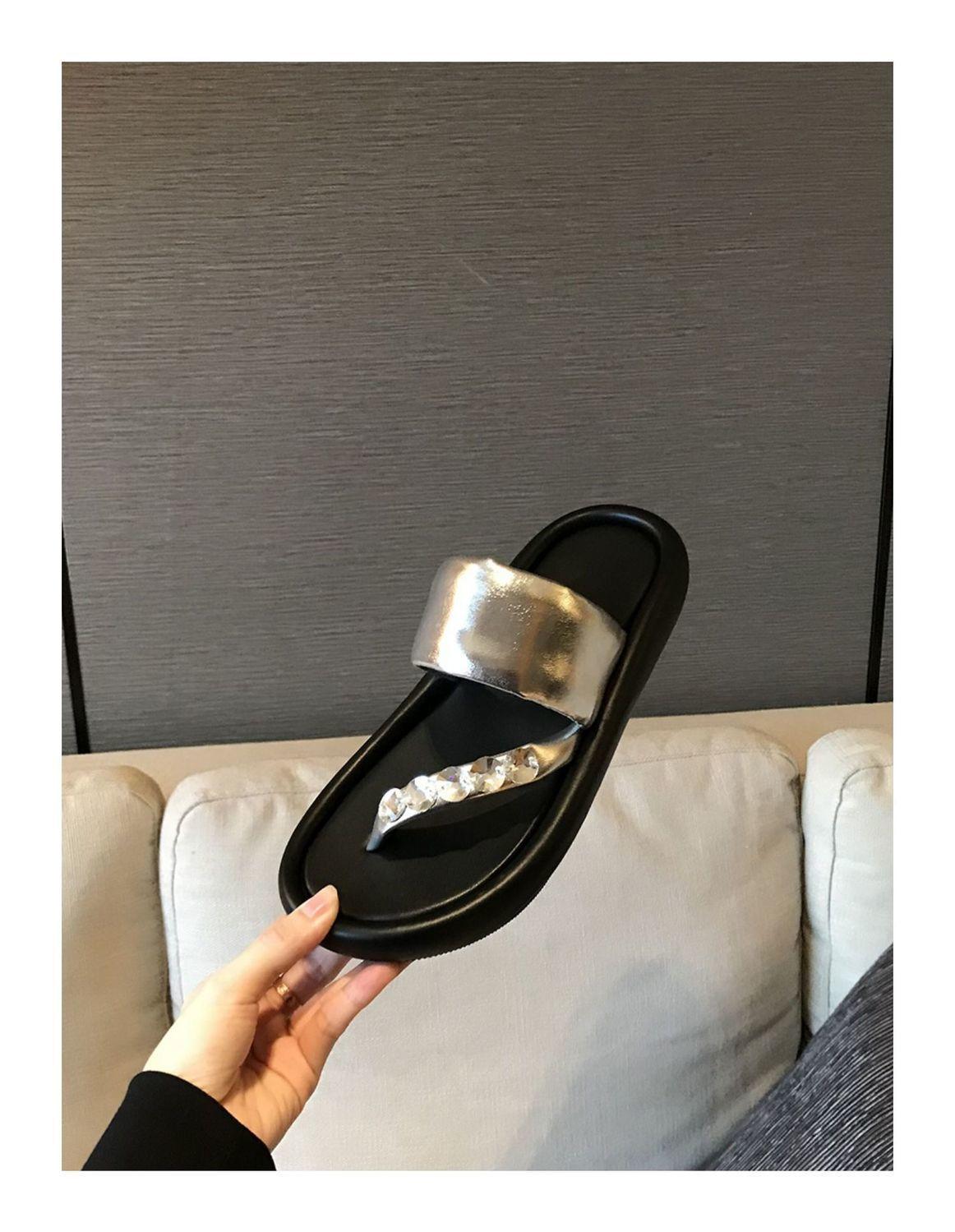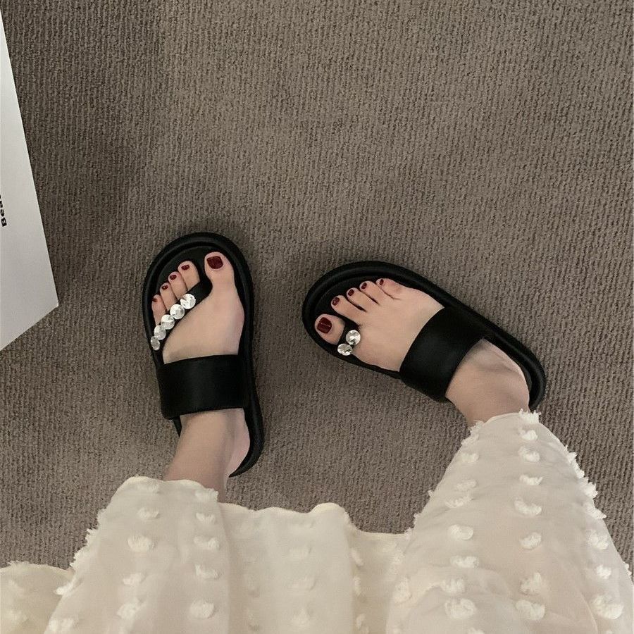 Pantuflas de tanga de una línea de estilo hada con suela gruesa antideslizante y pedrería para uso exterior 2025 Verano Nuevo estilo Pantuflas para mujer