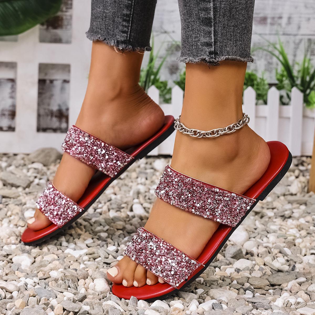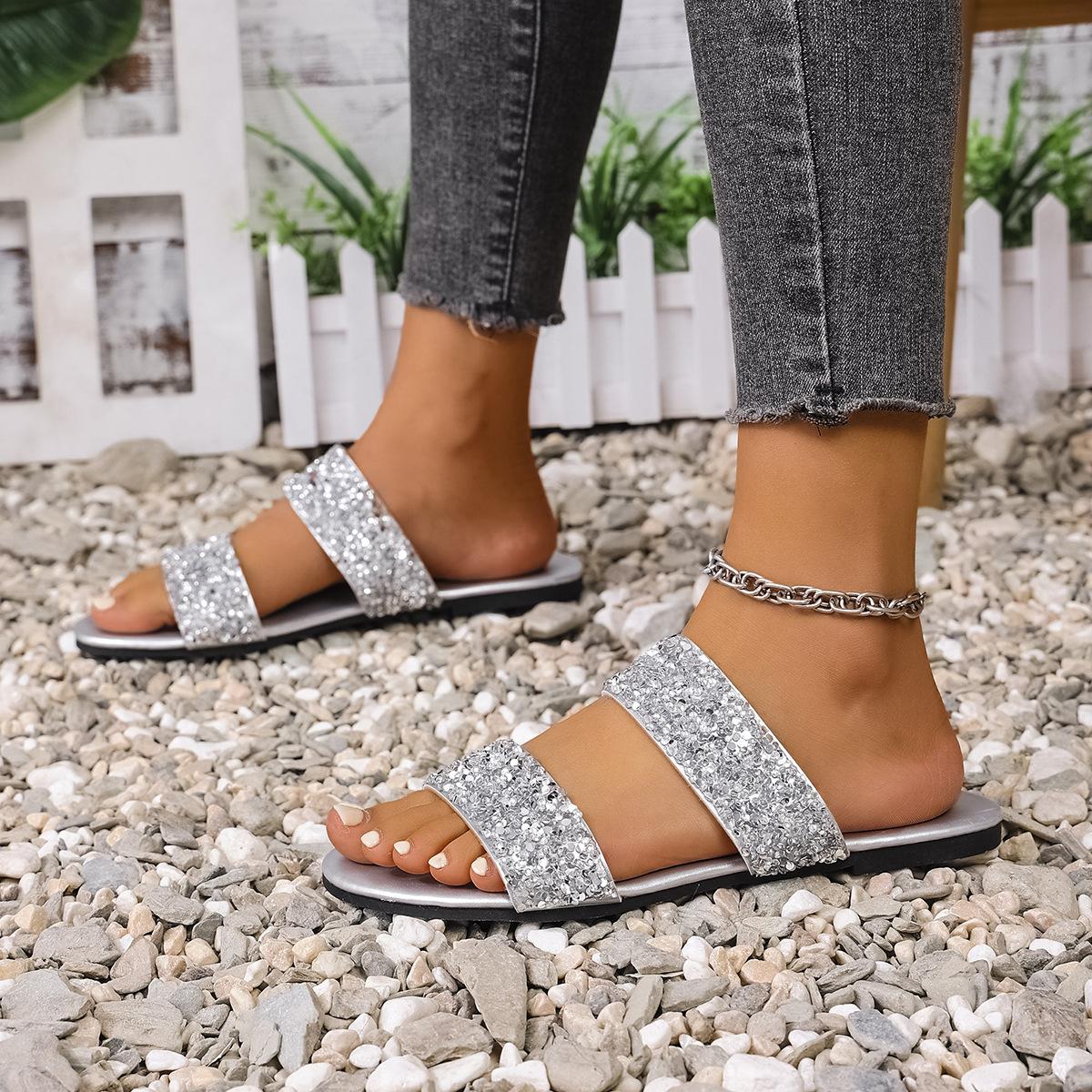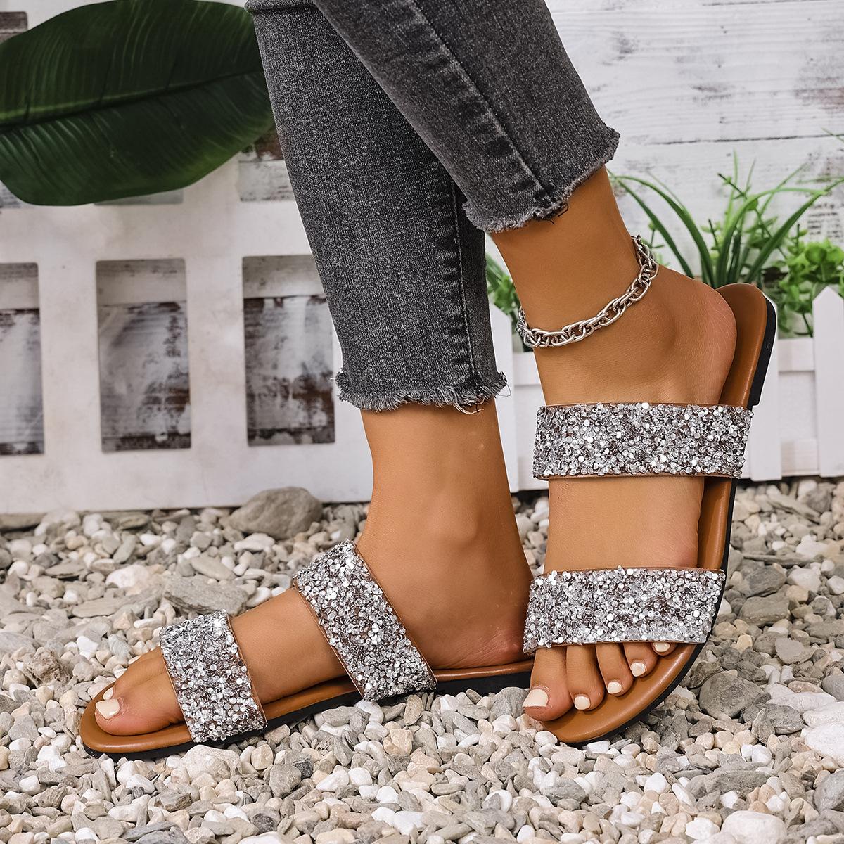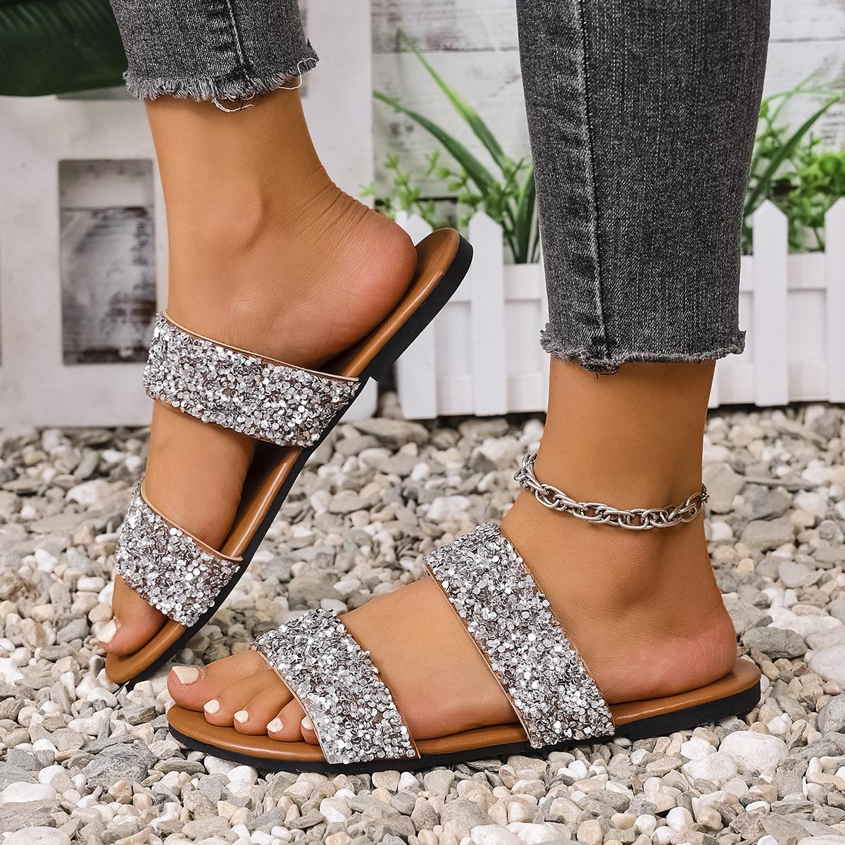 Sandalias de Lentejuelas de Talla Grande Europeas y Americanas para Mujer 2025 Verano Nuevo Color Puro Punta Cuadrada Moda Casual Playa Planas Pantuflas