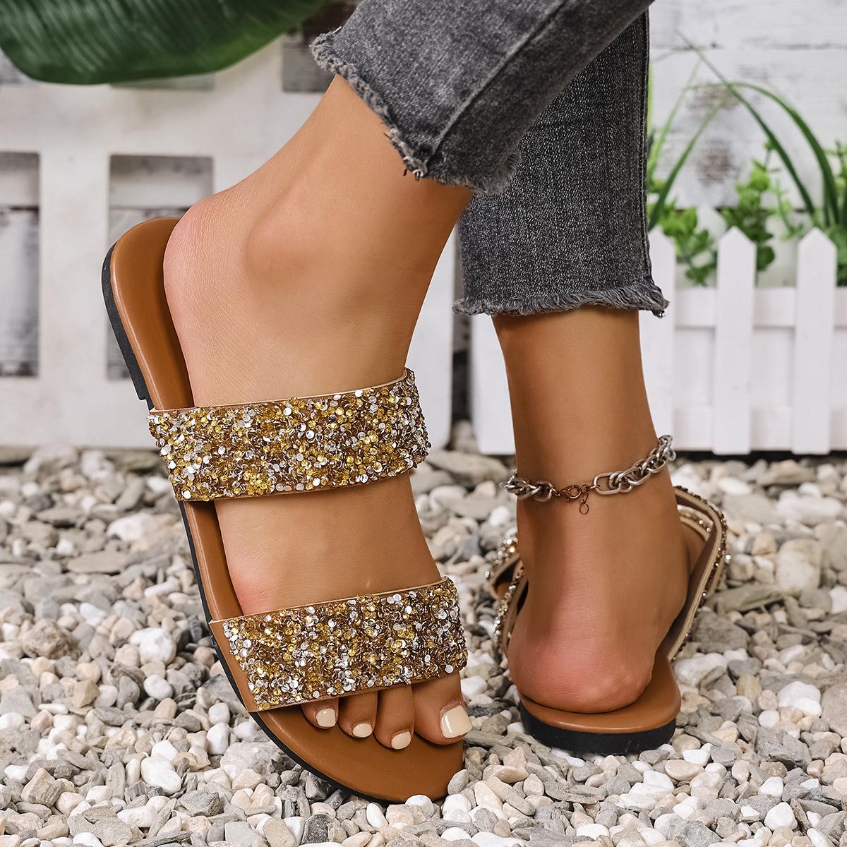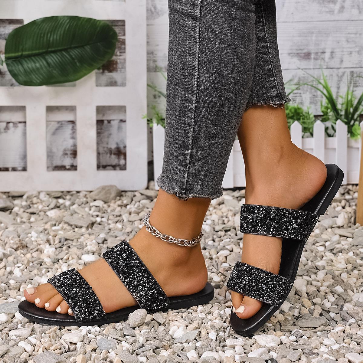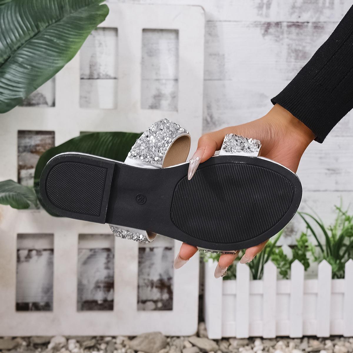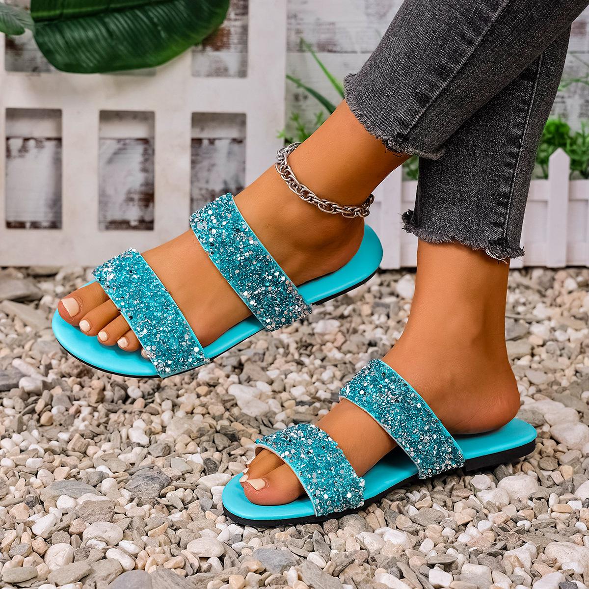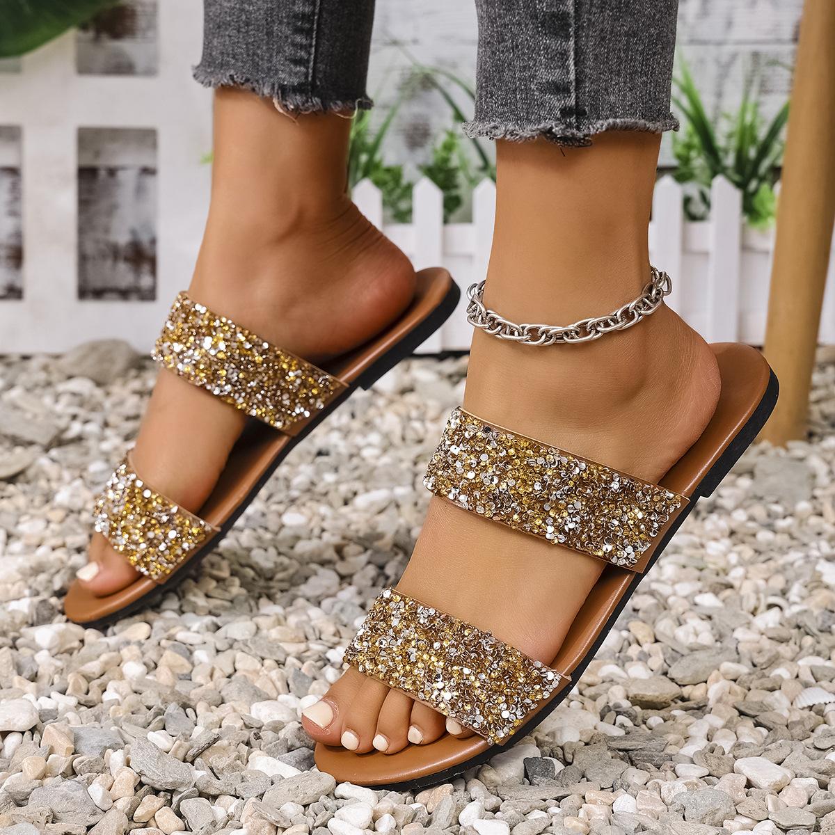 Sandalias de Lentejuelas de Talla Grande Europeas y Americanas para Mujer 2025 Verano Nuevo Color Puro Punta Cuadrada Moda Casual Playa Planas Pantuflas