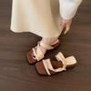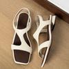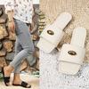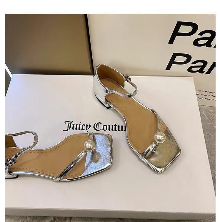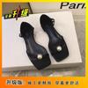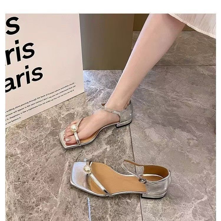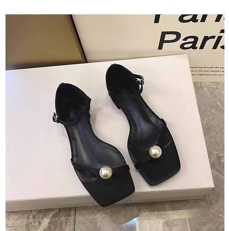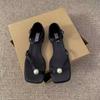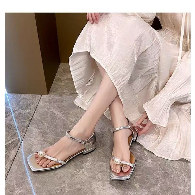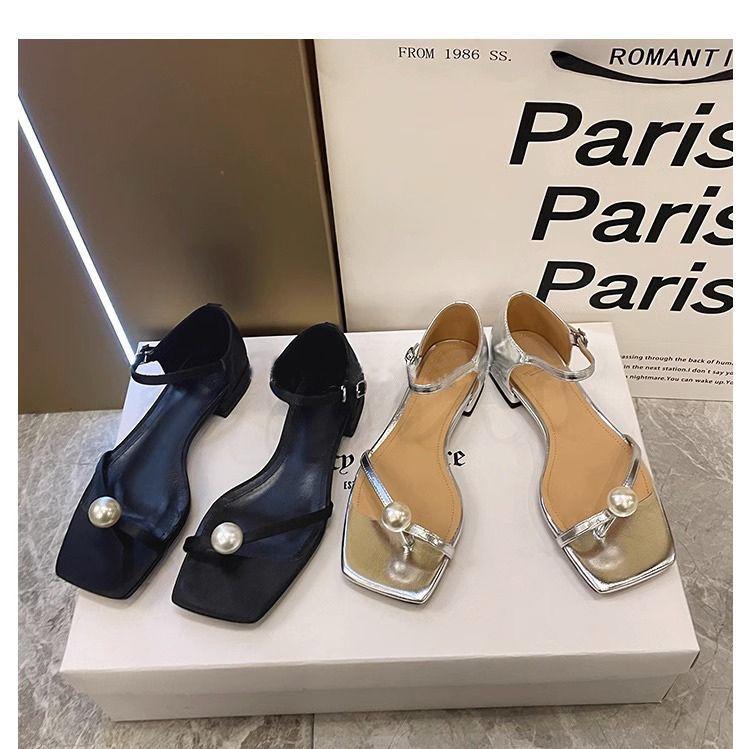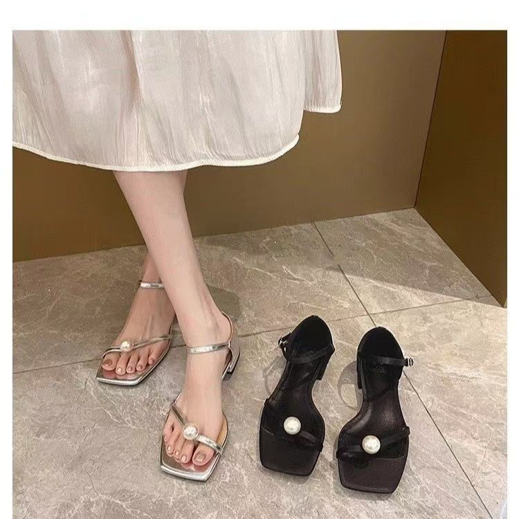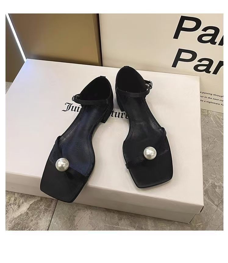 Sandalias de Tanga de Perla Francesa de Tacón Grueso 2025 Verano Nuevo Estilo Mujer Flats Simples Punta Cuadrada Una Línea Sandalias Elegantes para Mujer