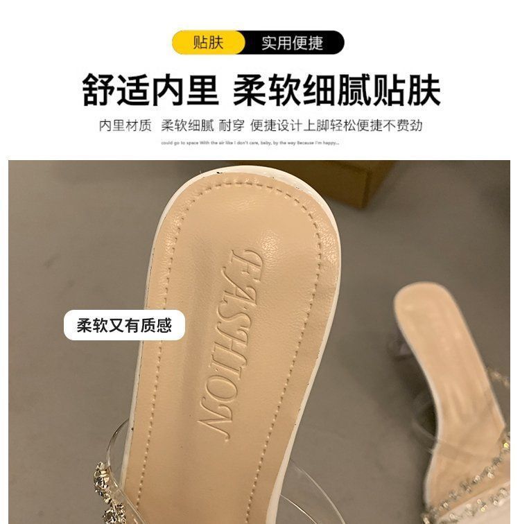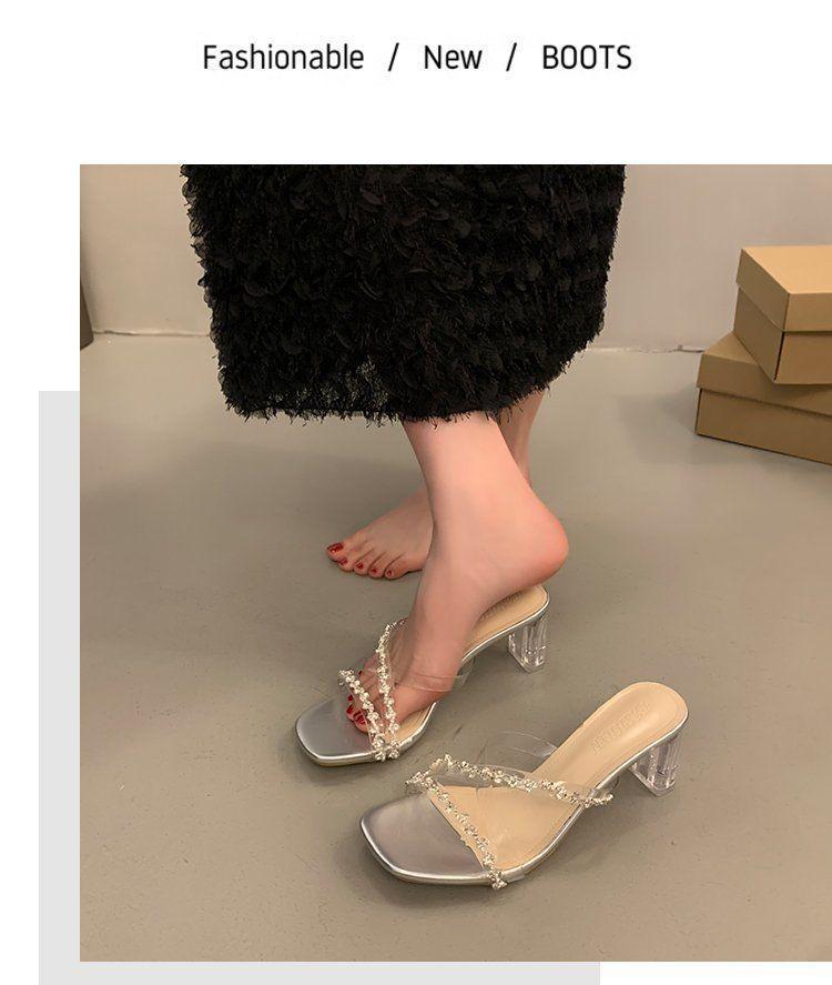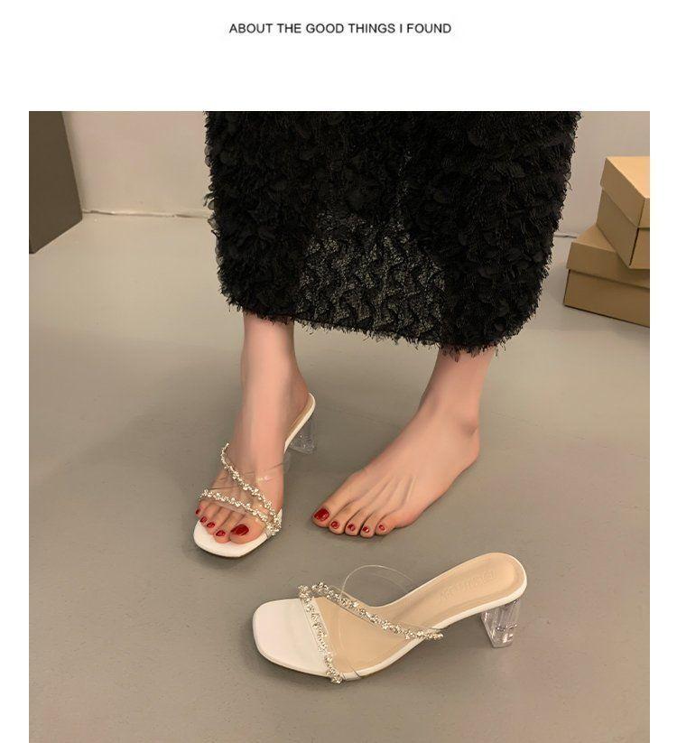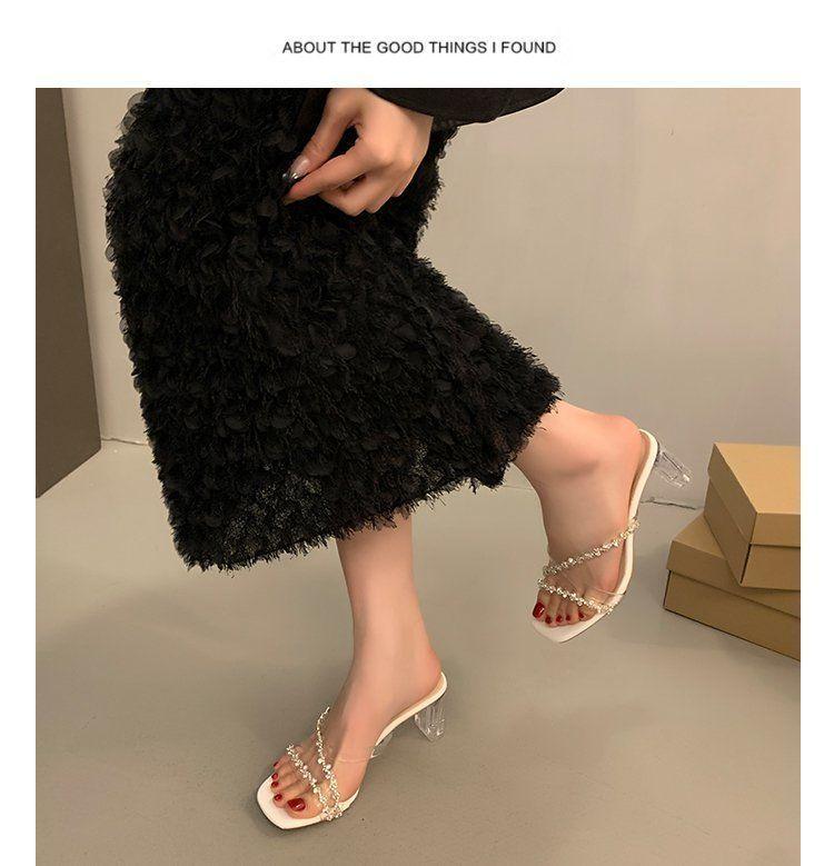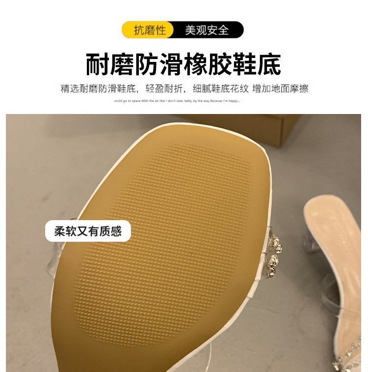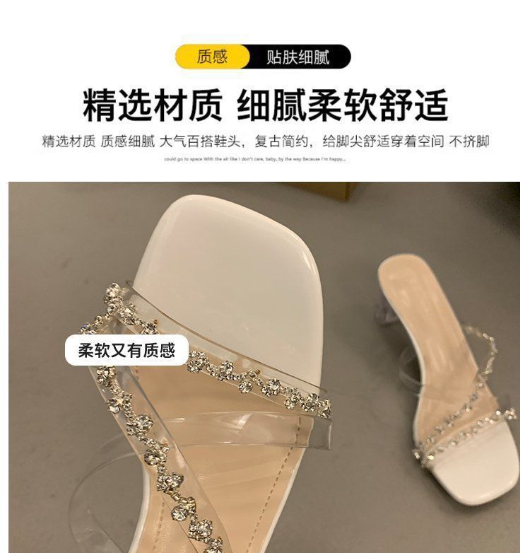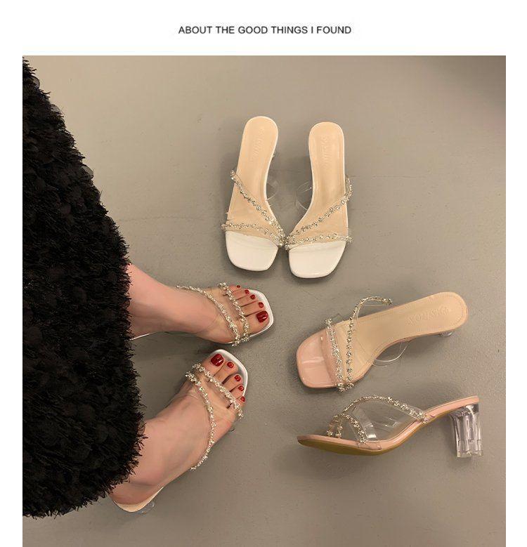 Zapatillas de tacón grueso con diamantes de imitación estilo hada para mujer, ropa exterior de verano 2024, nuevas zapatillas de tacón alto elegantes de estilo francés.