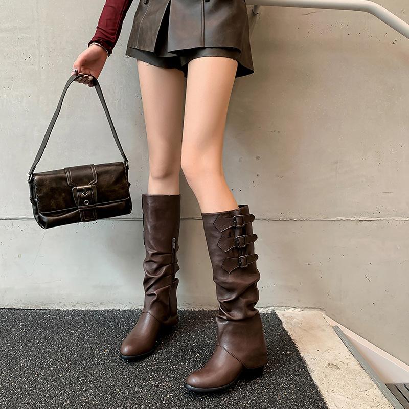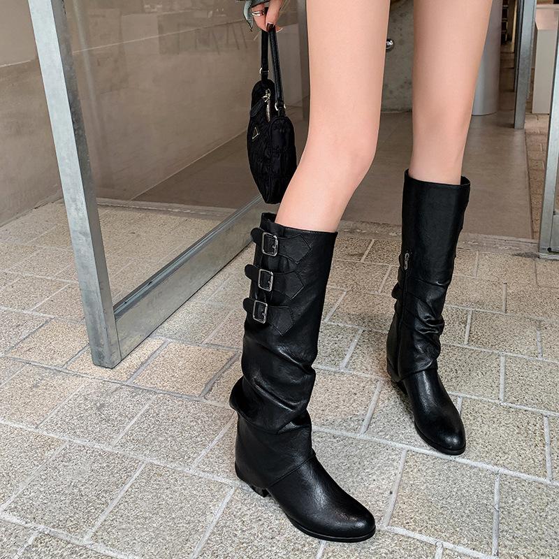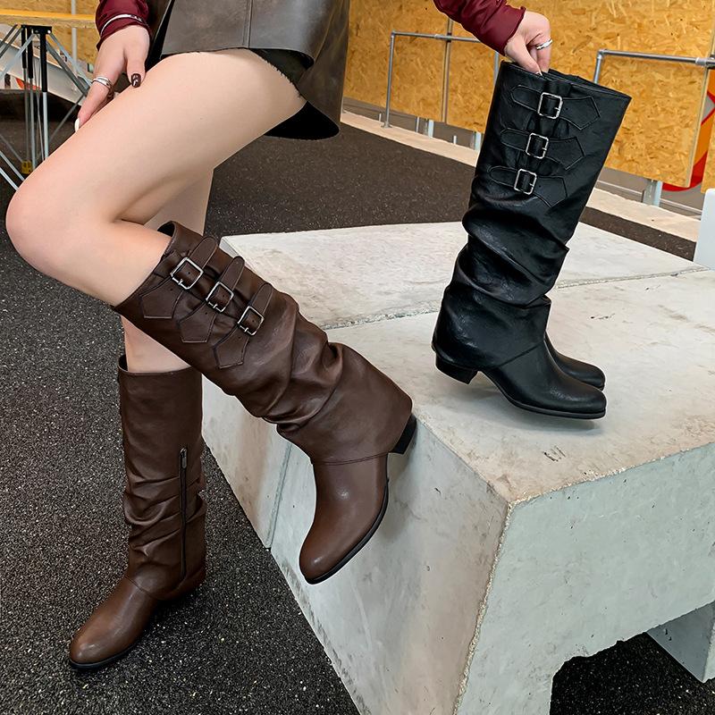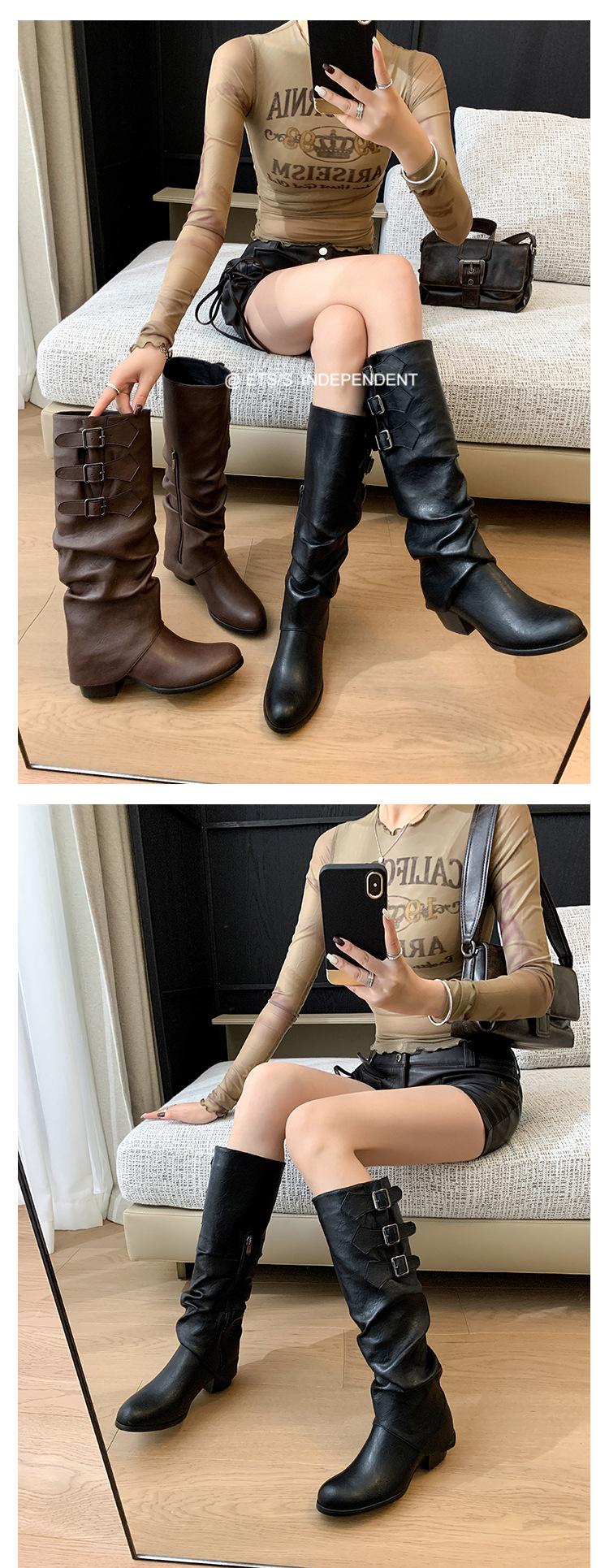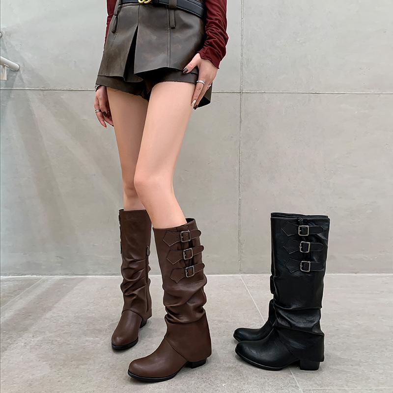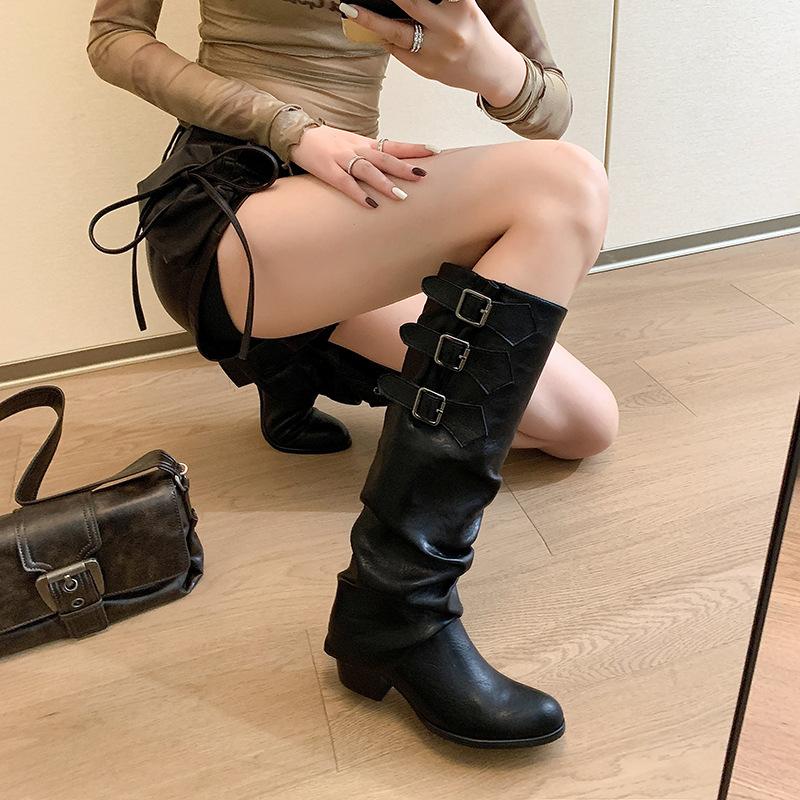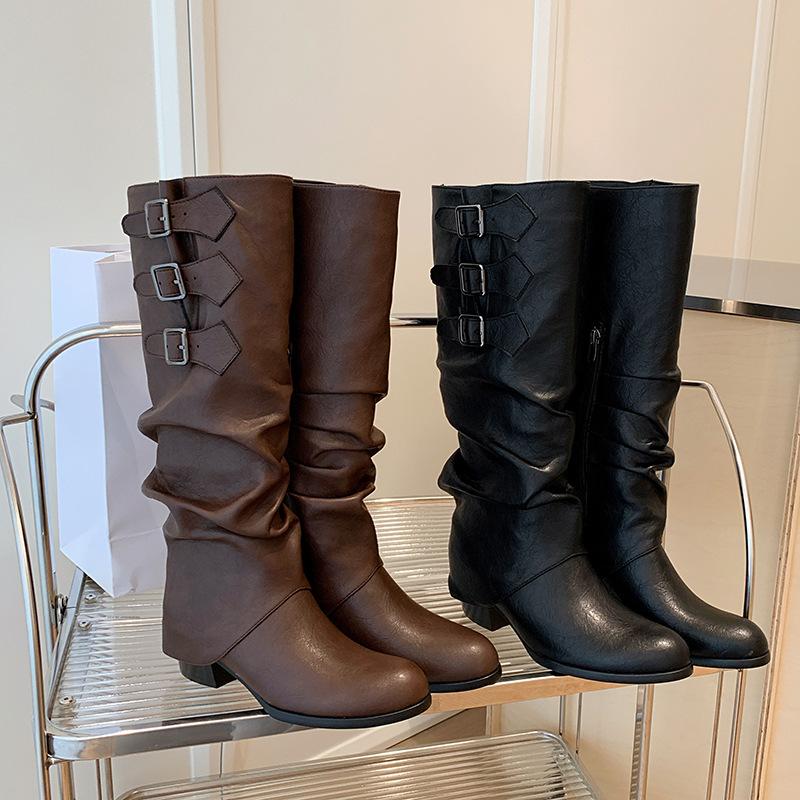 2025 Otoño e Invierno Nuevas Botas Altas de Tacón Grueso Plisadas Botas de Caballero de Tacón Medio con Hebilla de Cinturón Británico Botas de Moda Botas de Mujer