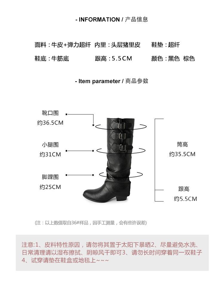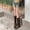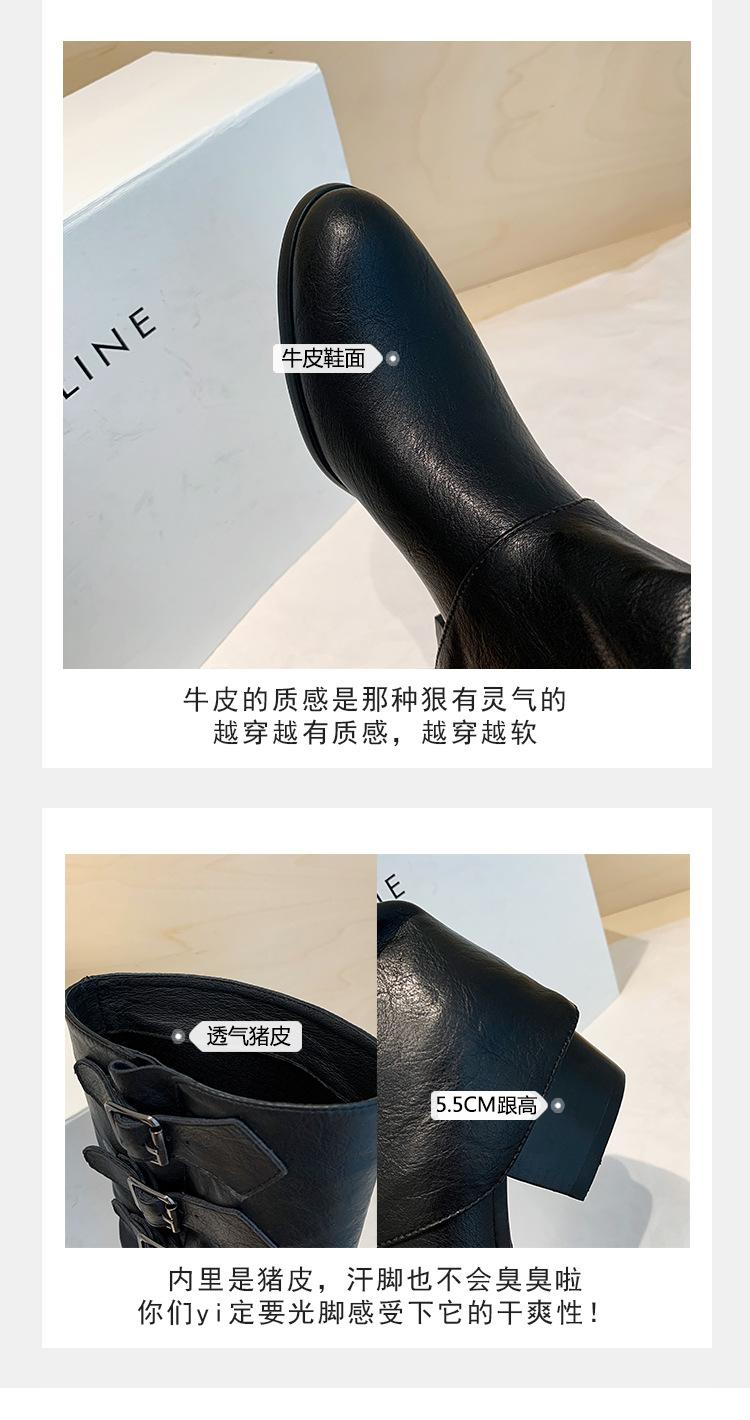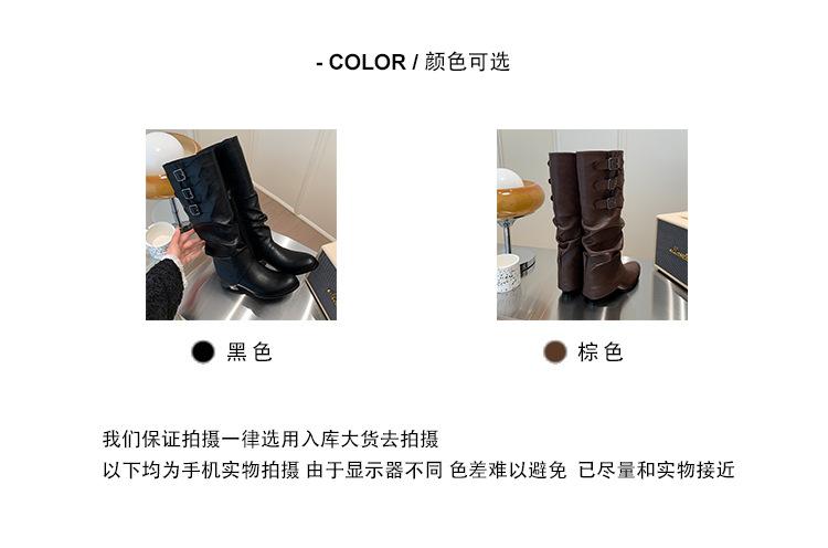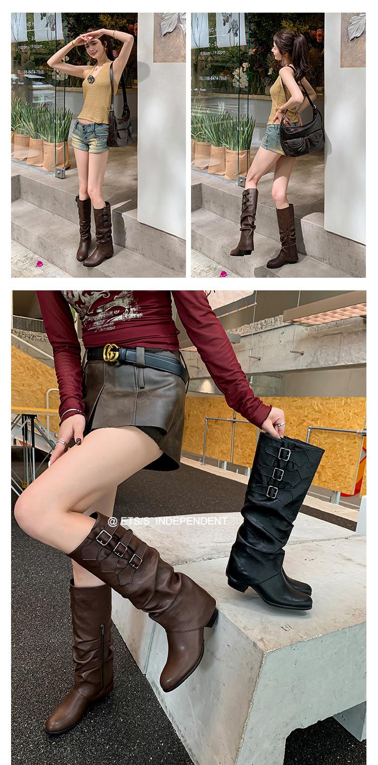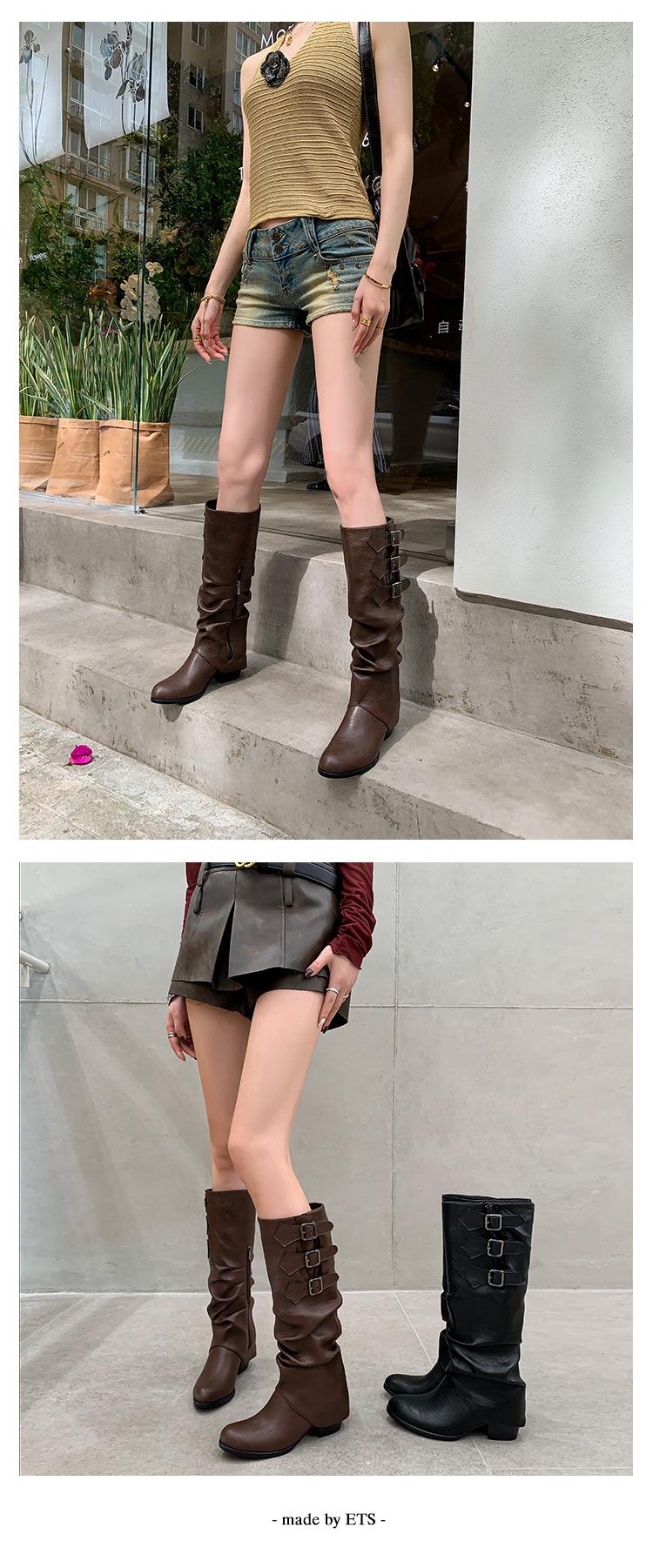 2025 Otoño e Invierno Nuevas Botas Altas de Tacón Grueso Plisadas Botas de Caballero de Tacón Medio con Hebilla de Cinturón Británico Botas de Moda Botas de Mujer
