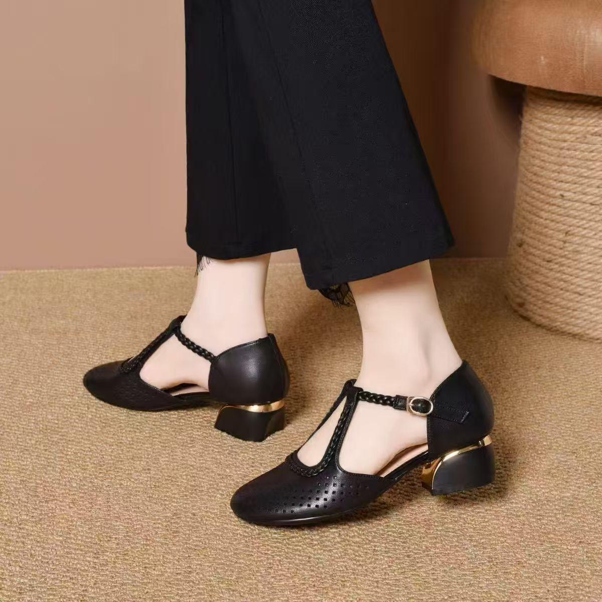 Sandalias para Mujer Verano 2025 Versión Coreana Nueva Moda Versátil Casual Ahuecadas Tacón Grueso Sexy Adelgazantes Zapatos para Ir al Trabajo Modernos