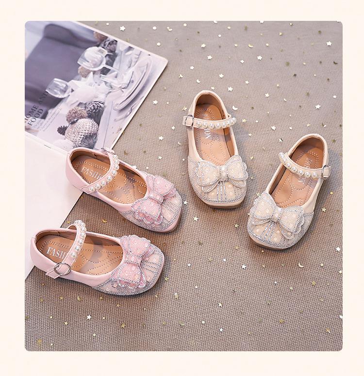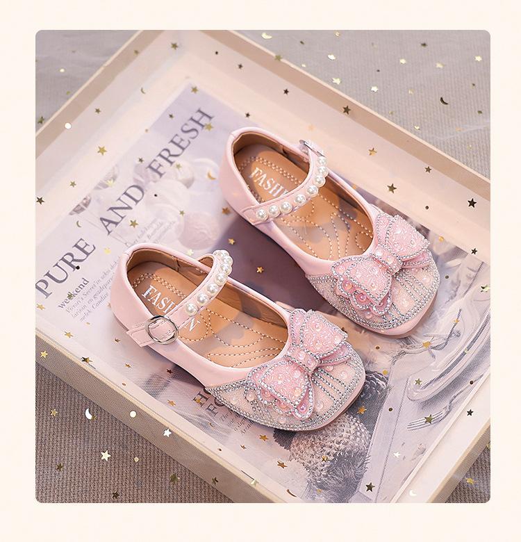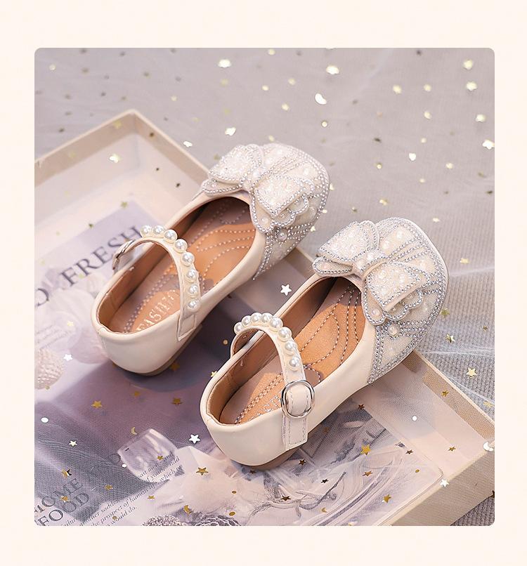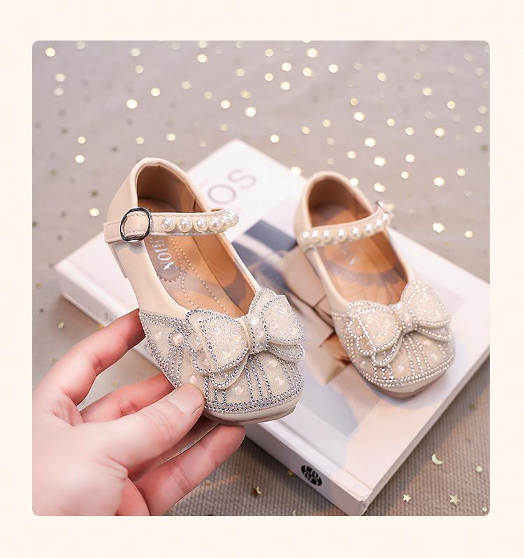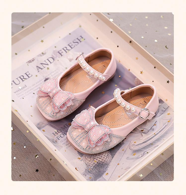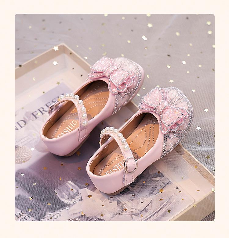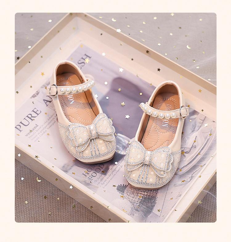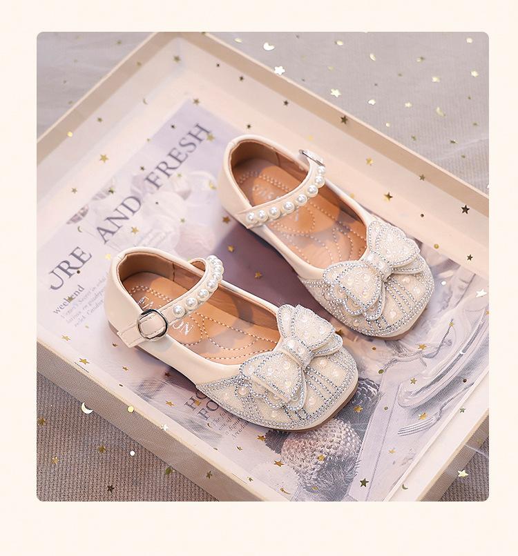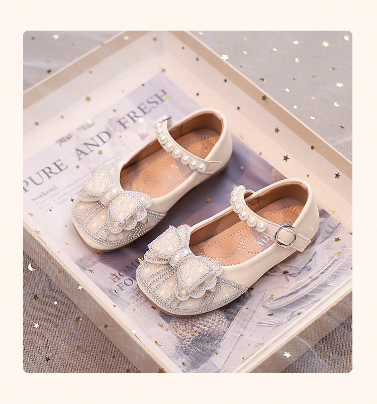 Zapatos de Cuero Pequeños para Niñas Primavera y Verano 2025 Zapatos de Princesa con Lazo de Perlas de Cristal con Pedrería para Niños Zapatos de Presentación para Niñita