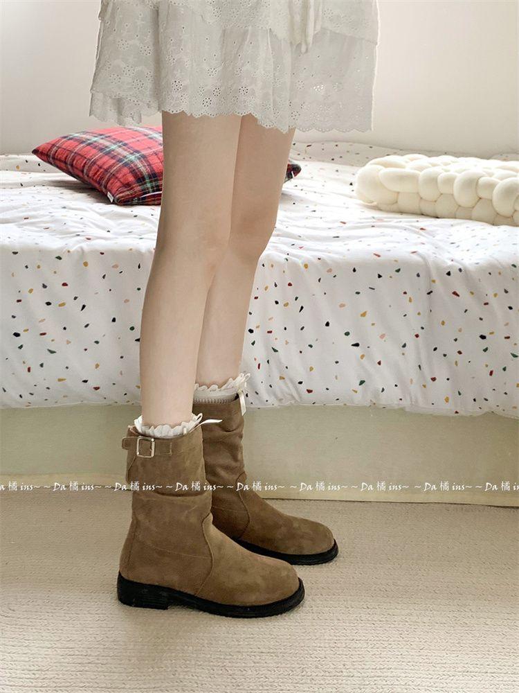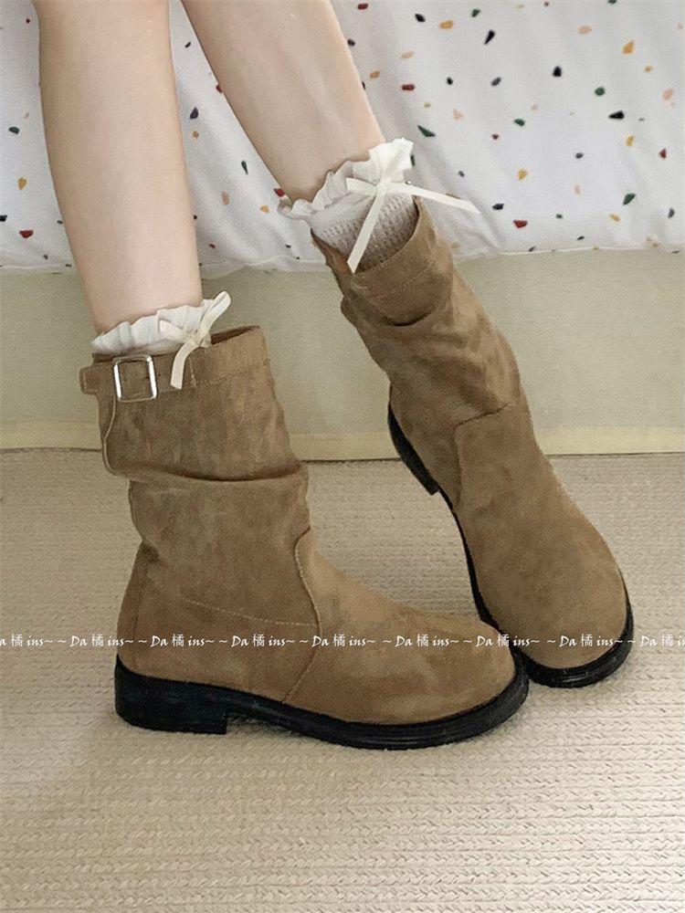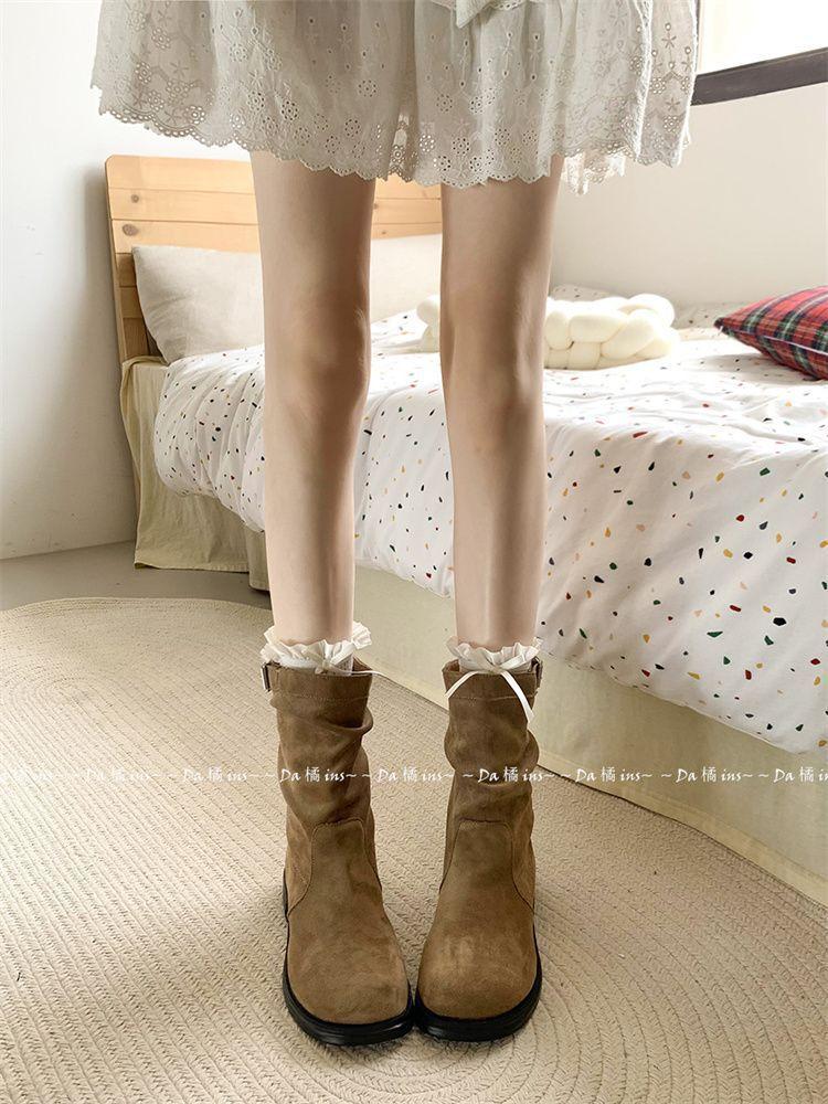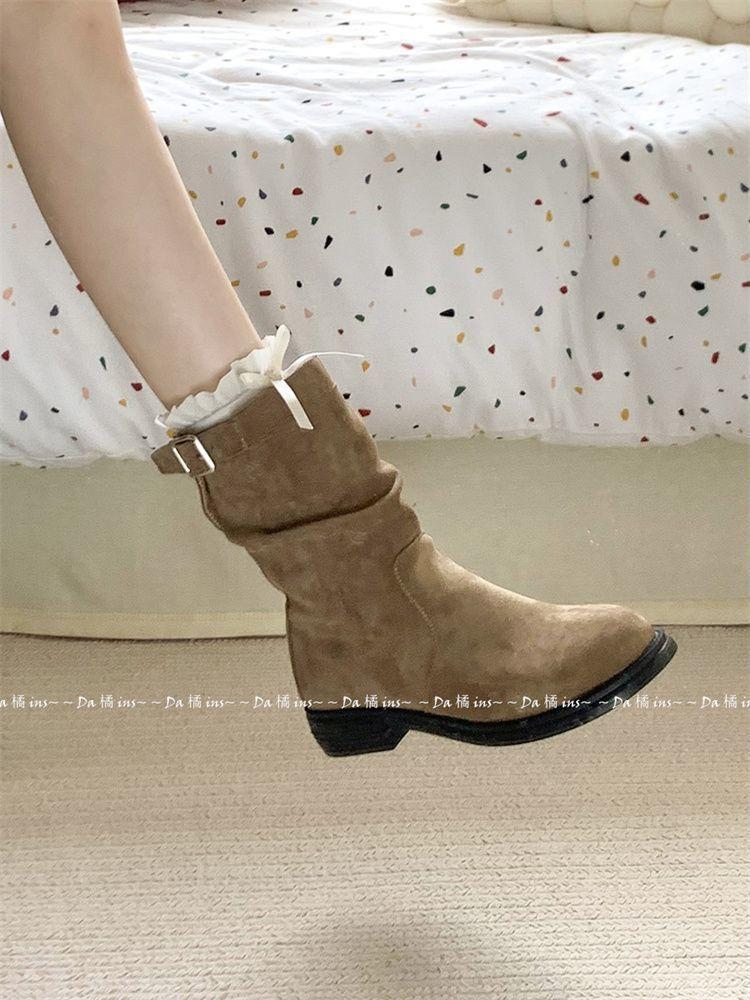 Botas Slimming de Media Caña Slip-On Botines 2024 Otoño/Invierno Nuevo Estilo Británico Vintage Tacón Grueso Botas Martin para Mujer