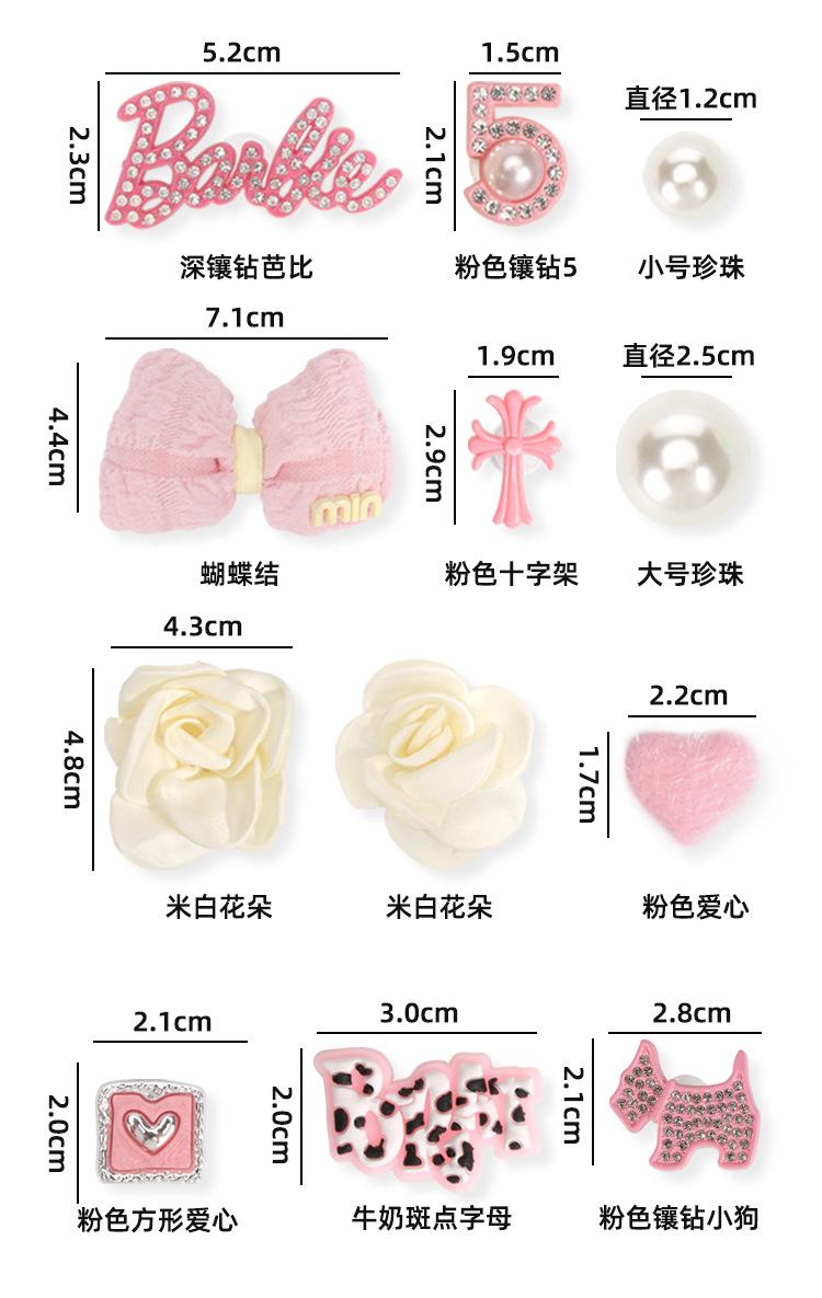 Suit, Alphabet barbie, Little pearl, Bow, Off-white flowers, Square heart, Cross, Pink heart, Letter spots, Nu...