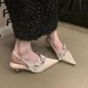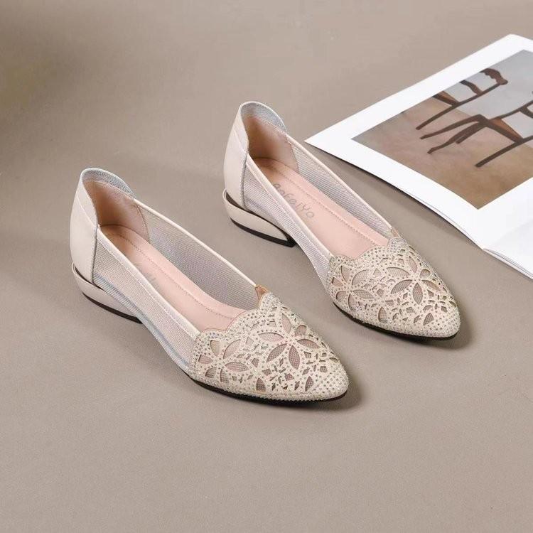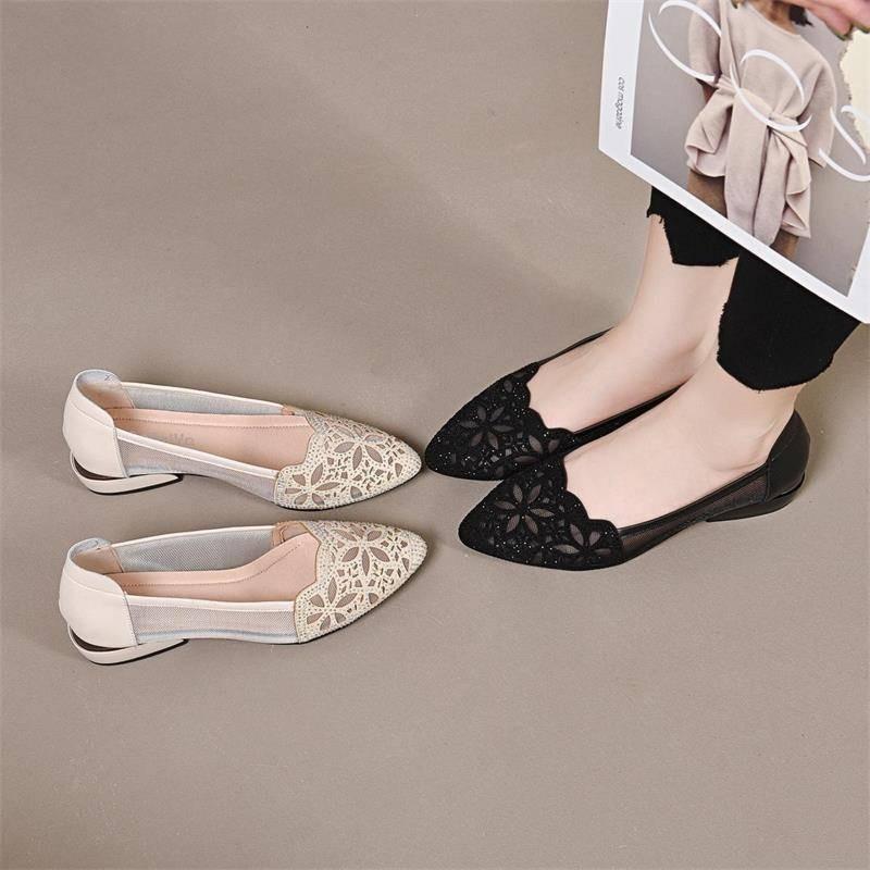Zapatos de mujer huecos de tacón grueso verano zapatos de mujer de pedrería zapatos de cuero de punta 2025 nuevos zapatos de malla de primavera y verano mujer