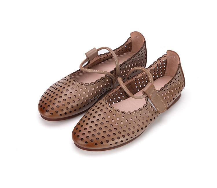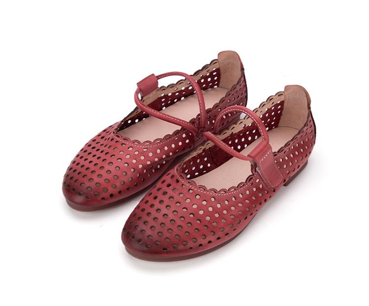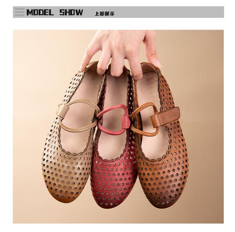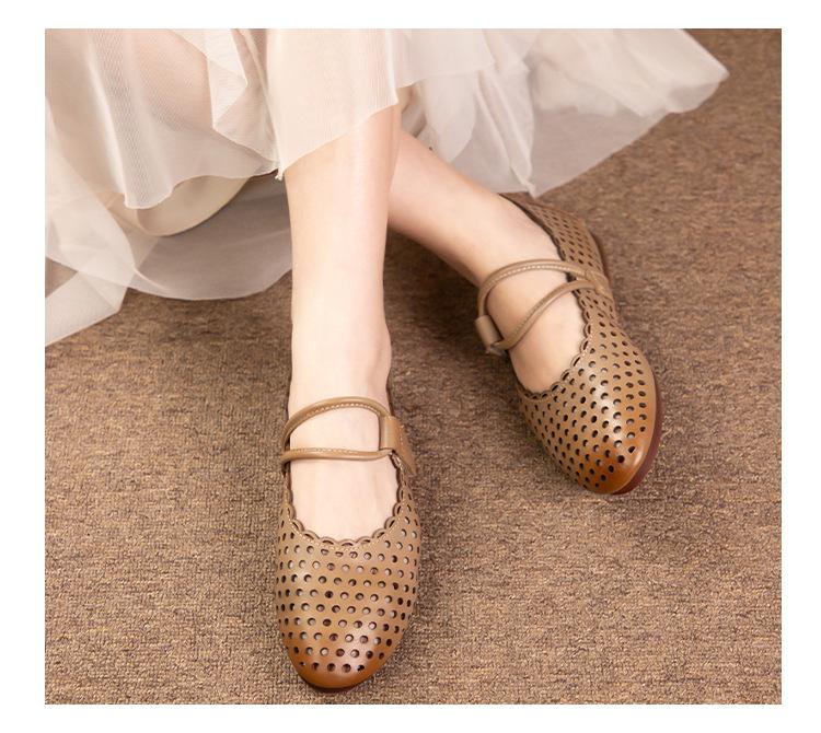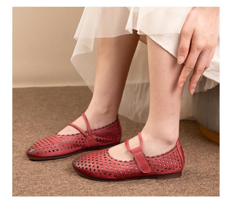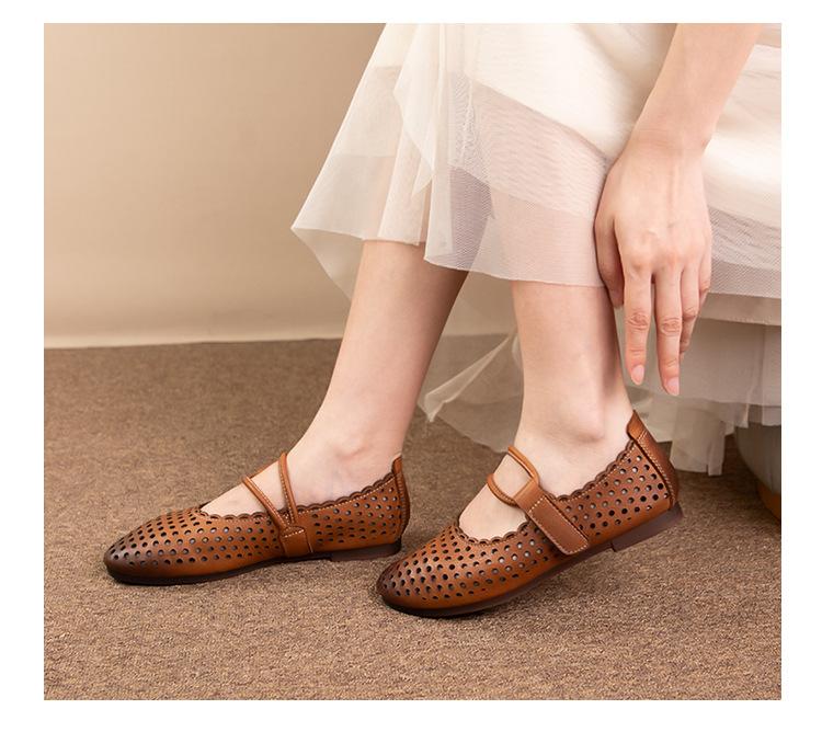 Zapatos de Cuero Genuino de Piel de Vaca de Primera Capa para Mujer, Zapatos de Verano con Agujeros Huecos, Sandalias Artesanales Retro Cómodas de Suela Plana Transpirables