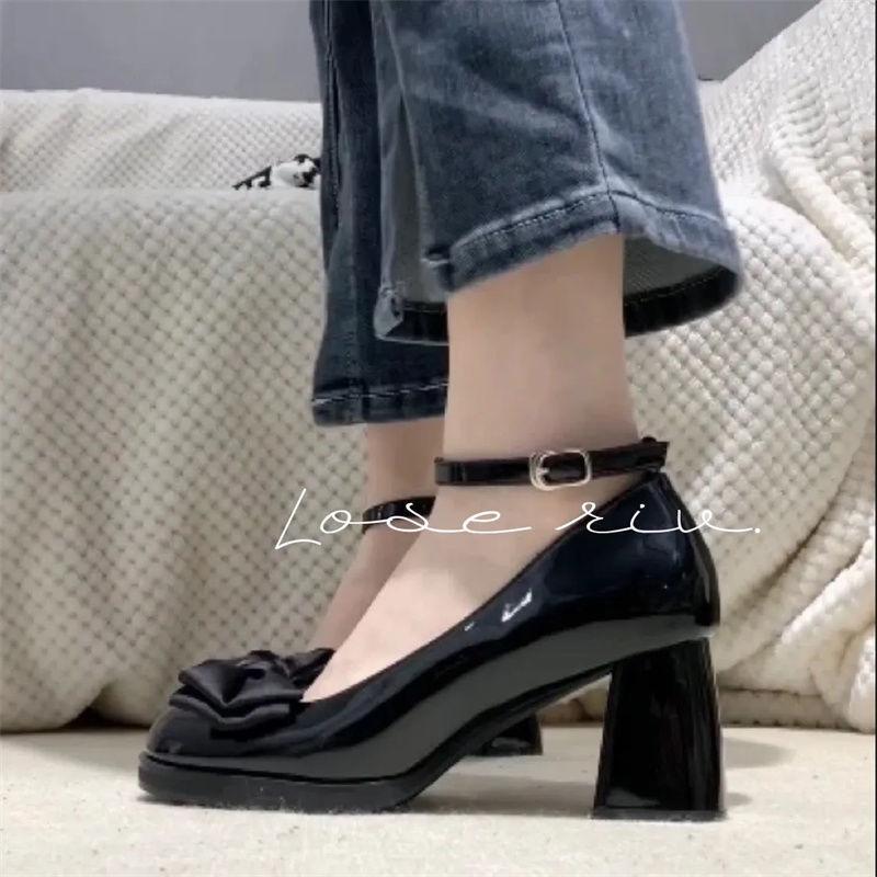 Zapatos Mary Jane Tacón Grueso para Mujer 2025 Verano Nuevo Estilo Hada Lazo Tacones Altos Charol Zapatos Franceses Ins