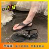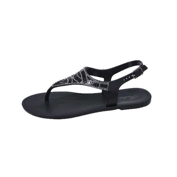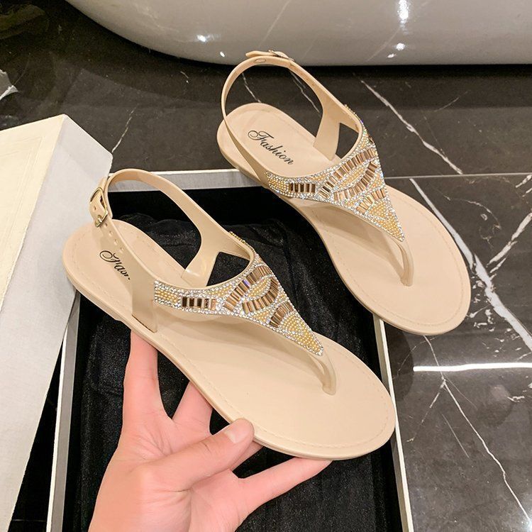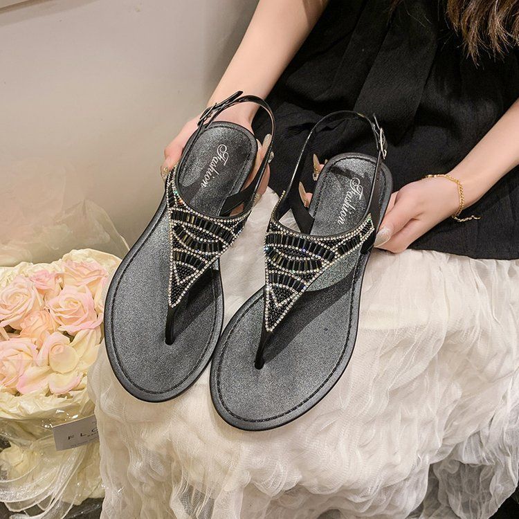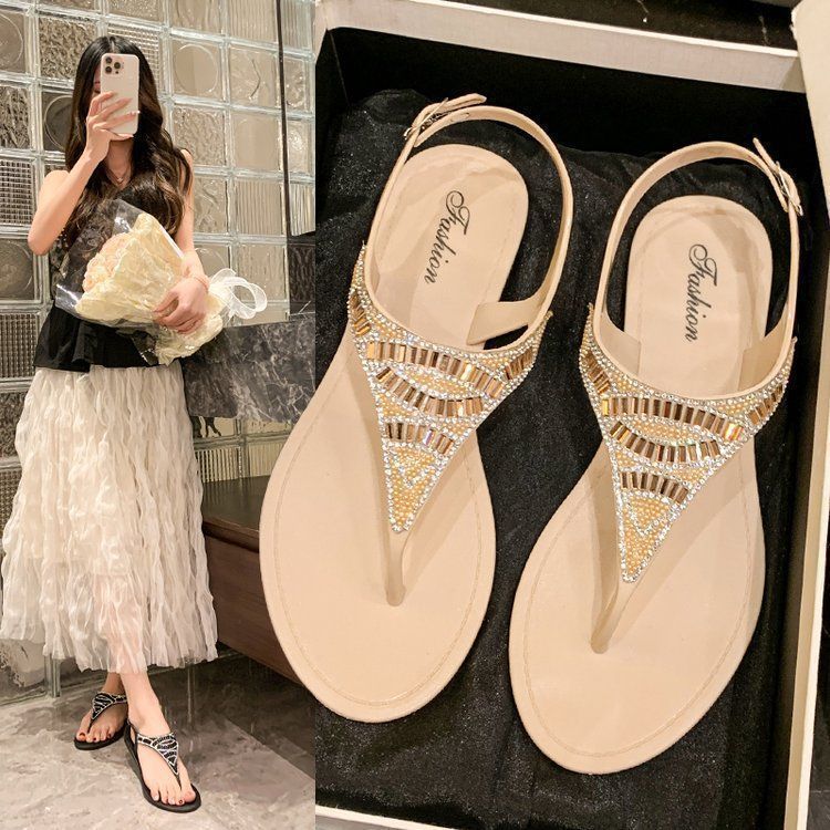 Hermosa Hebilla de Una Línea con Falda y Sandalias Planas de Tanga para Ropa Exterior Verano 2025 Nuevas Sandalias de Moda con Pedrería Estilo Hada