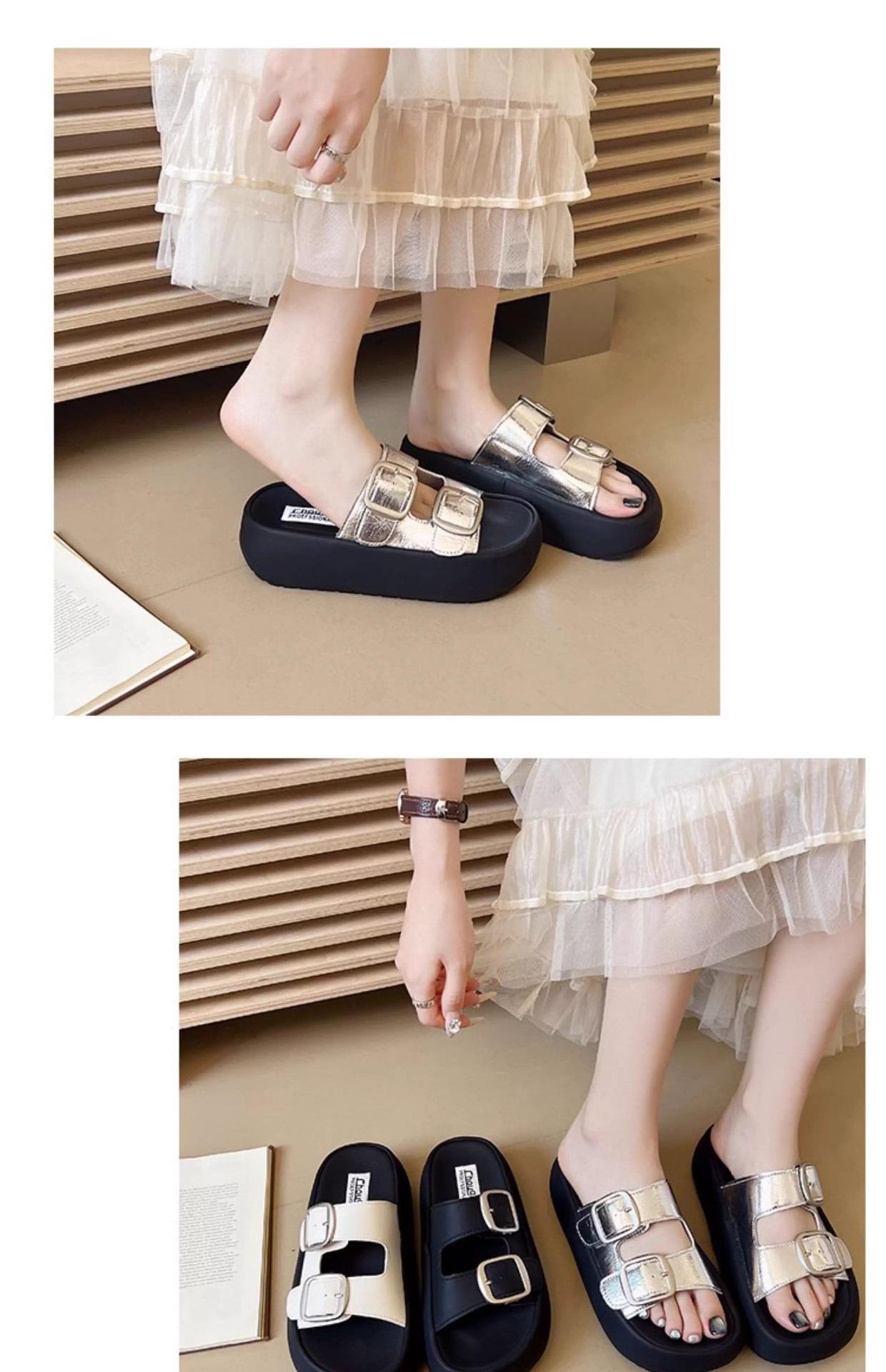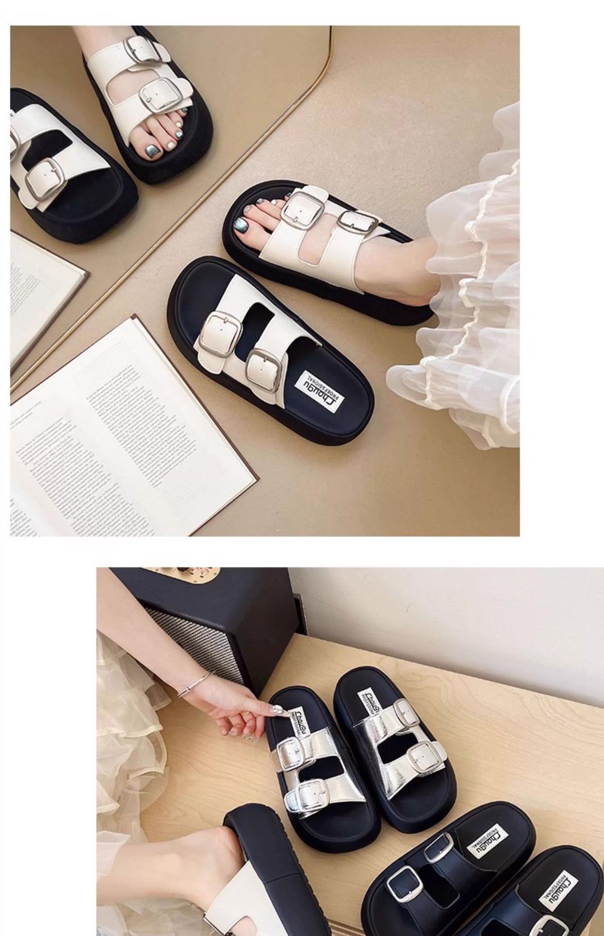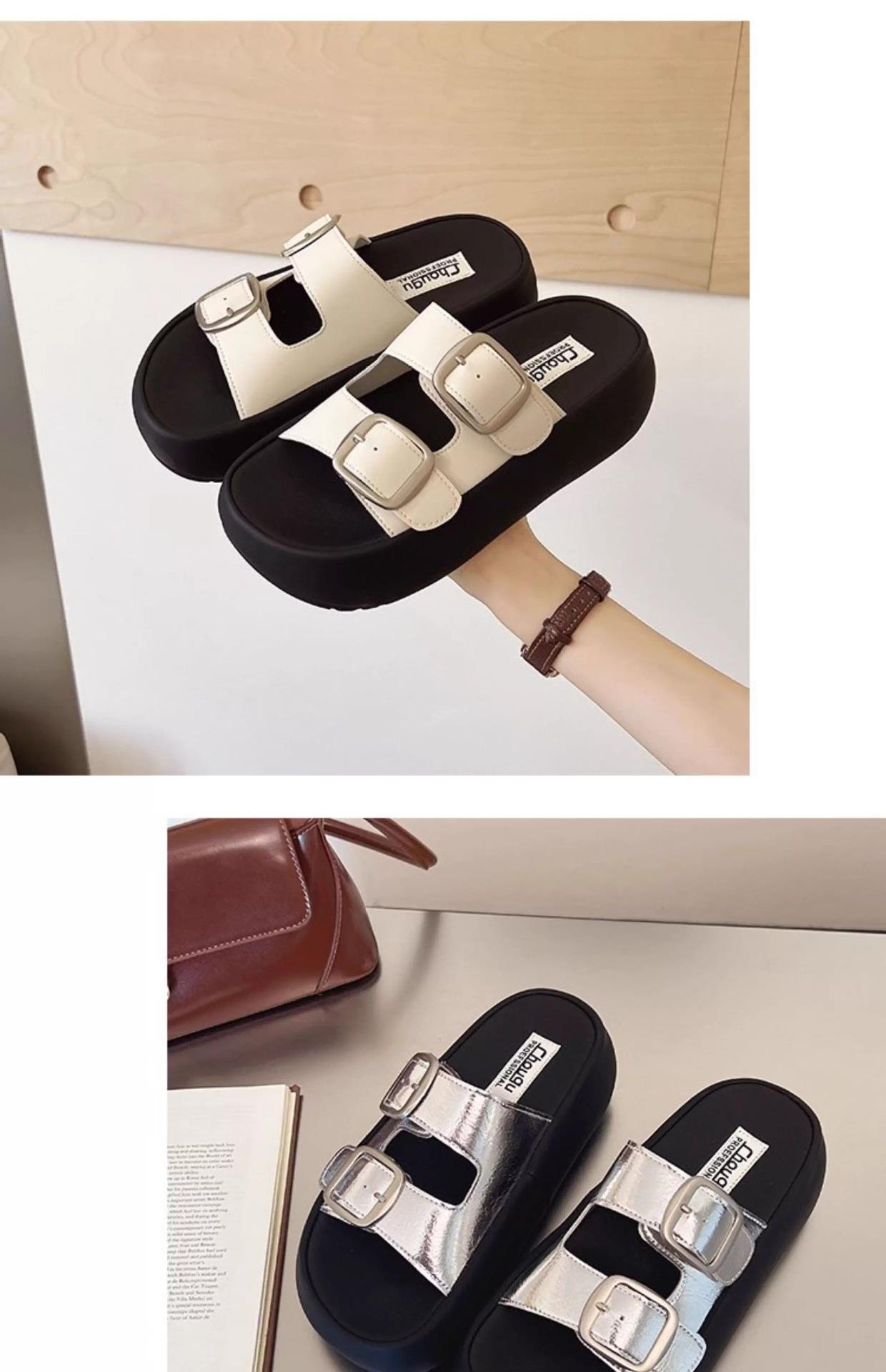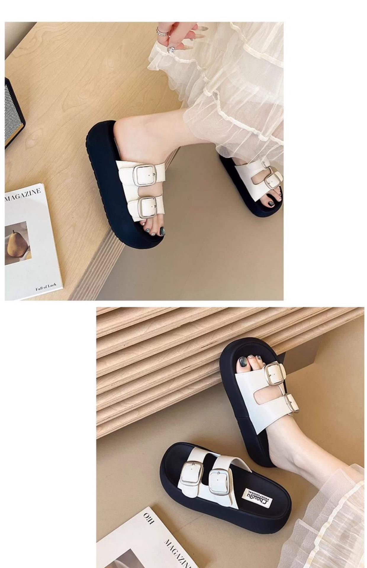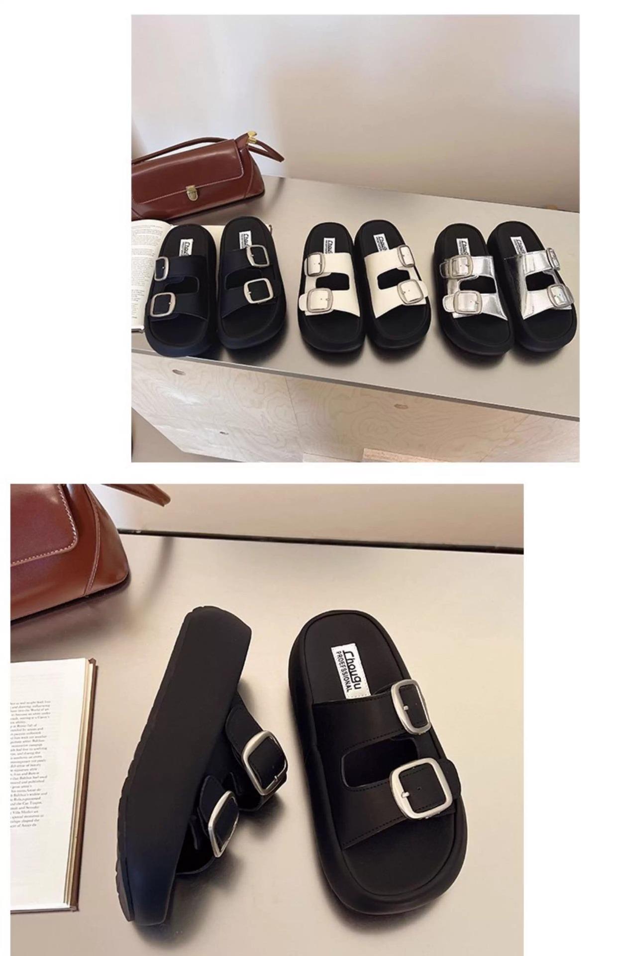Pantuflas planas con hebilla para mujer para usar en exteriores 2025 Primavera y Verano Nuevo Color puro Doble tira Zapatos de playa Pantuflas casuales y versátiles