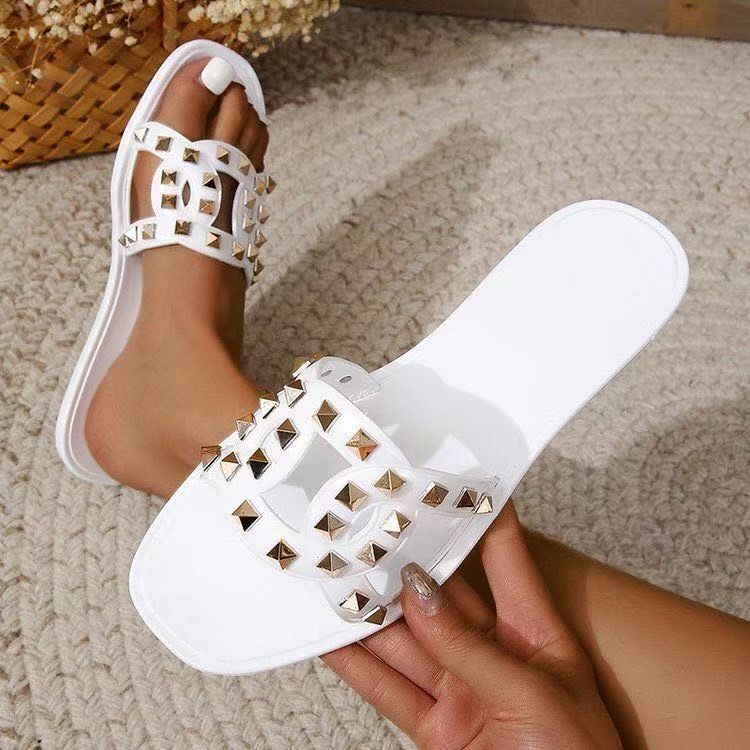 Pantuflas de Exterior para Mujer 2025 Verano Nuevo Versátil Tachonado Plano Moderno Estilo Hada Sandalias de Moda para Mujer
