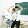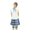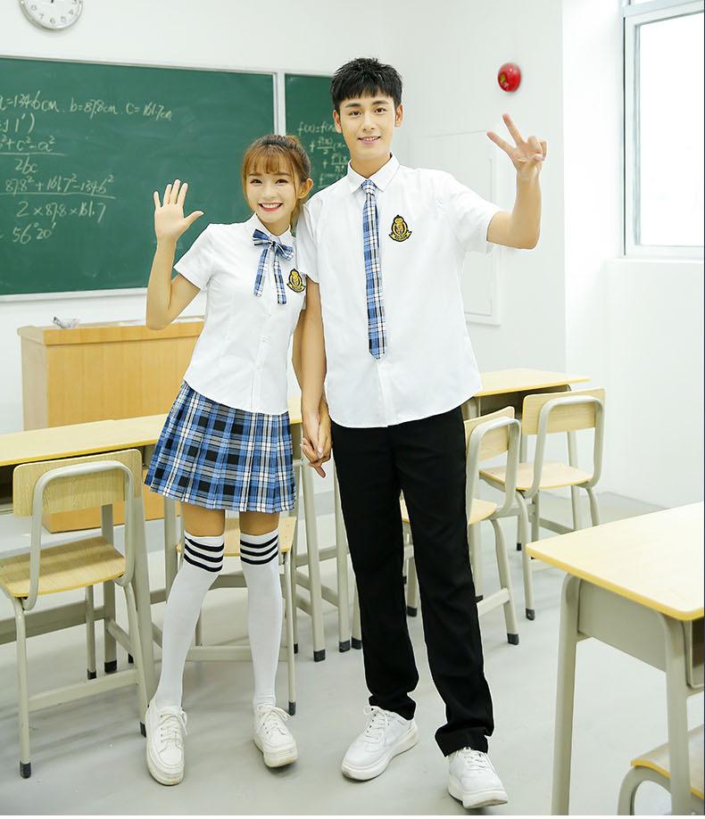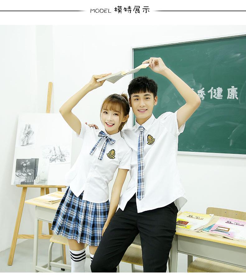 Women's pure white short sleeve + blue lattice skirt + blue lattice bow, Male pure white short sleeve + black trousers + blue tie