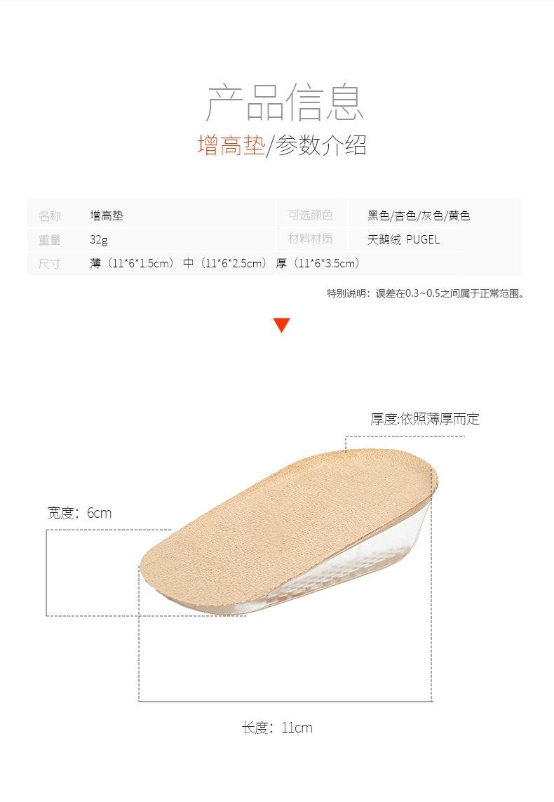 La versión para hombre aumenta la altura en 3.5 cm, longitud: 120 mm, ancho: 65 mm, altura: 35 mm, peso: 195 g/par