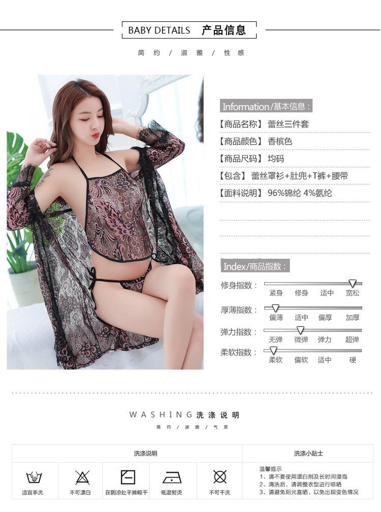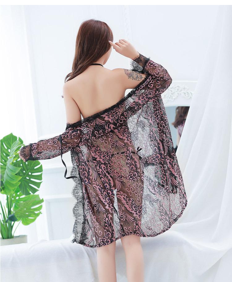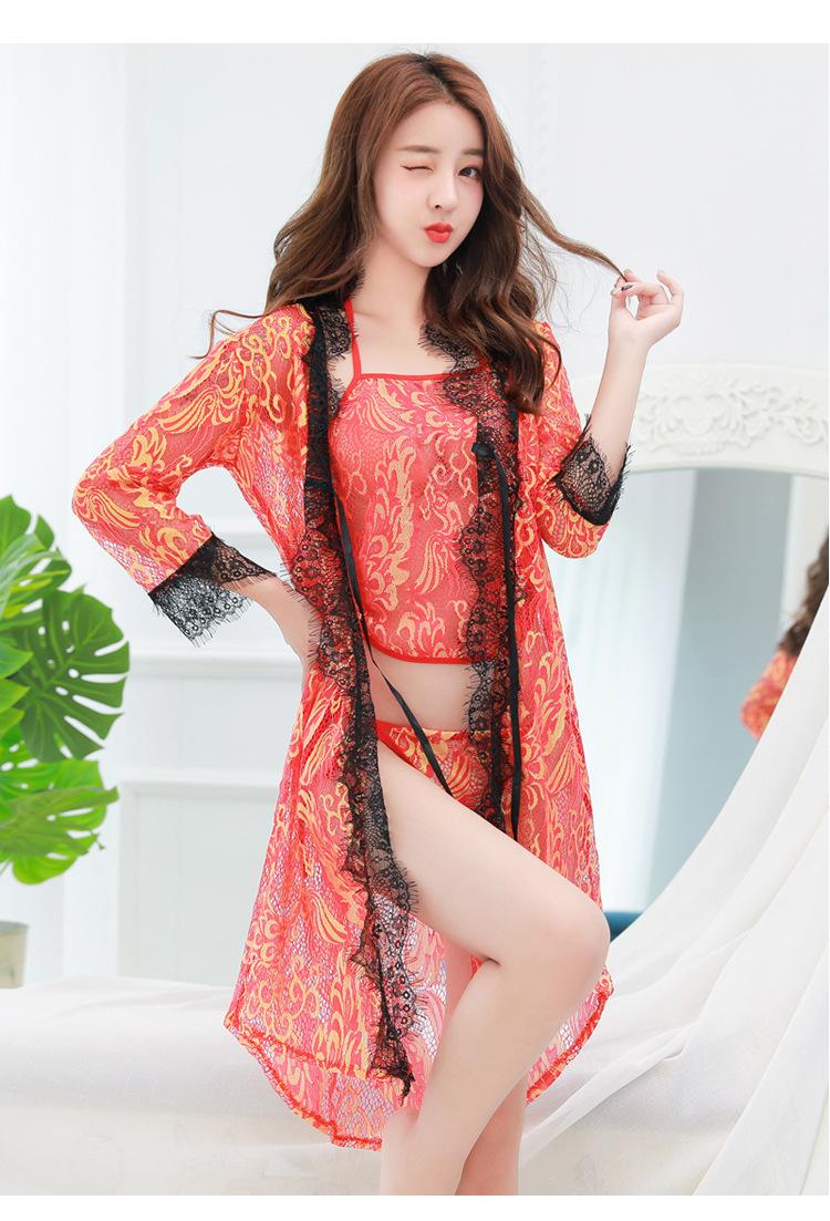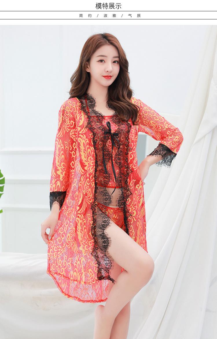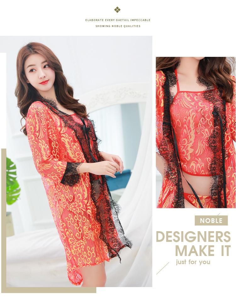 Pijama Sexy de Tres Piezas Tentación para Mujer Camisón Transparente con Tirantes Encaje en el Vientre Ropa Interior Vestido Largo Chaqueta