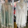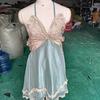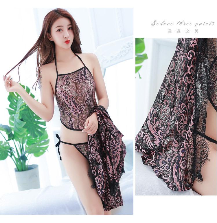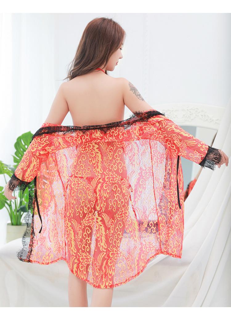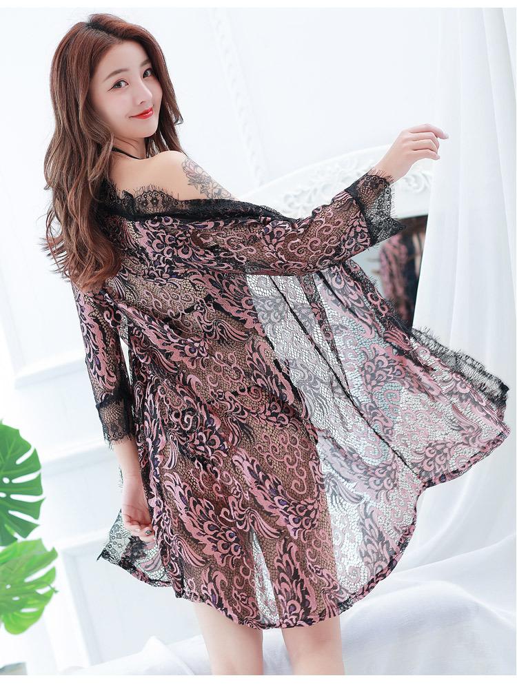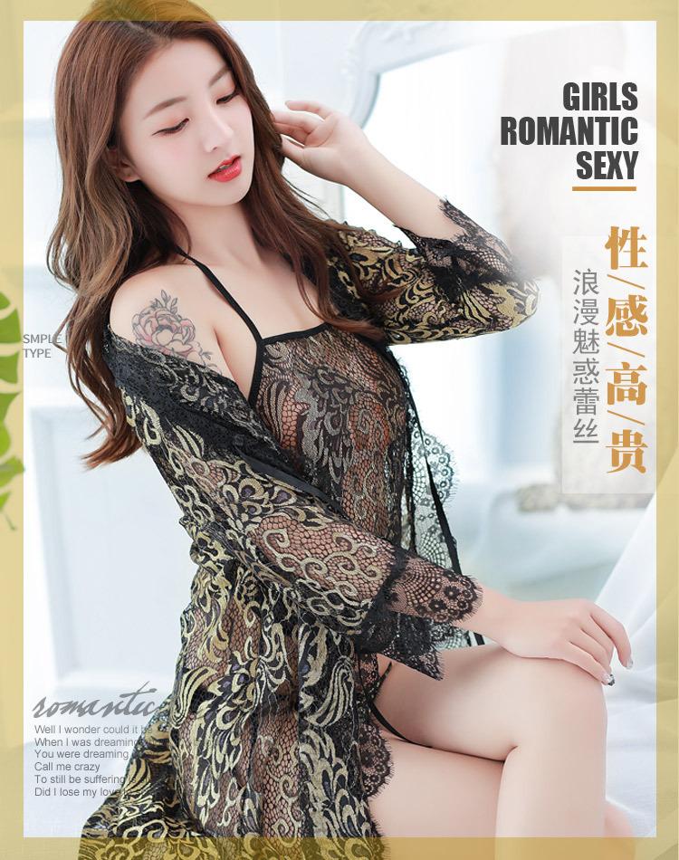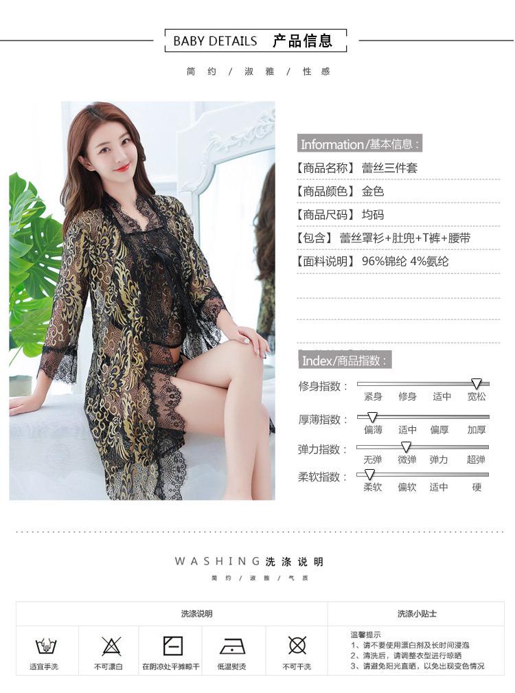 Pijama Sexy de Tres Piezas Tentación para Mujer Camisón Transparente con Tirantes Encaje en el Vientre Ropa Interior Vestido Largo Chaqueta