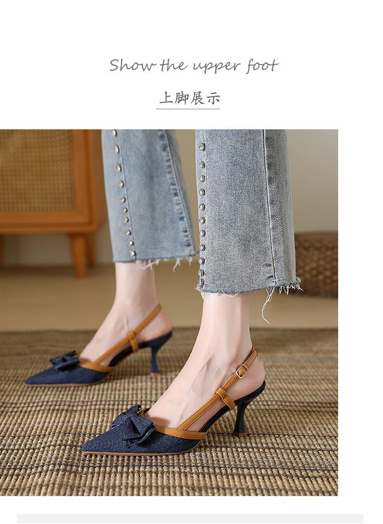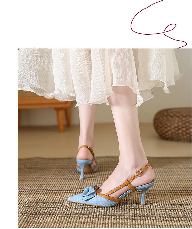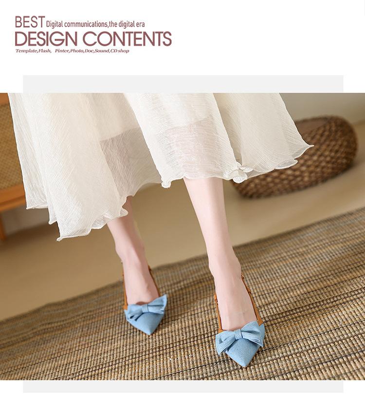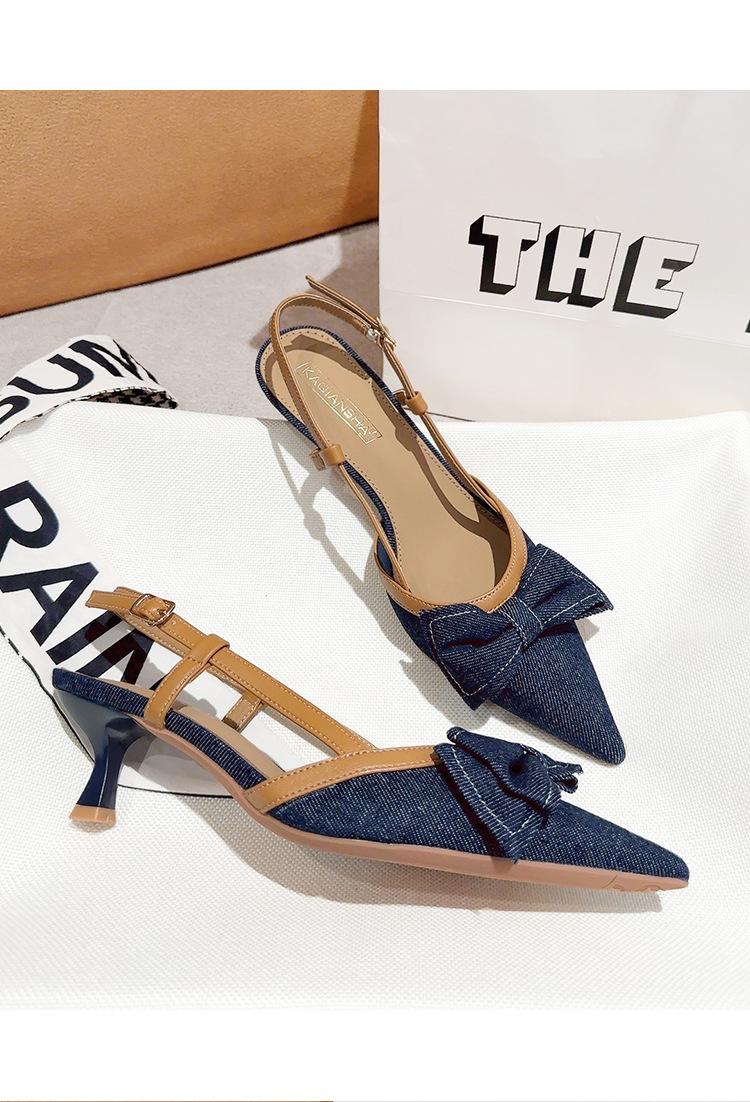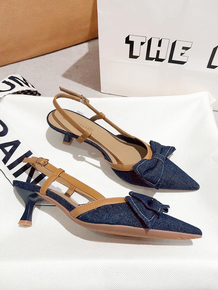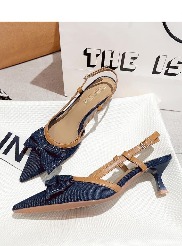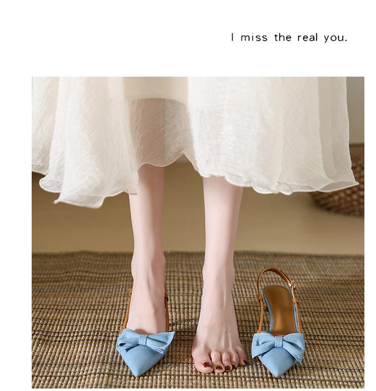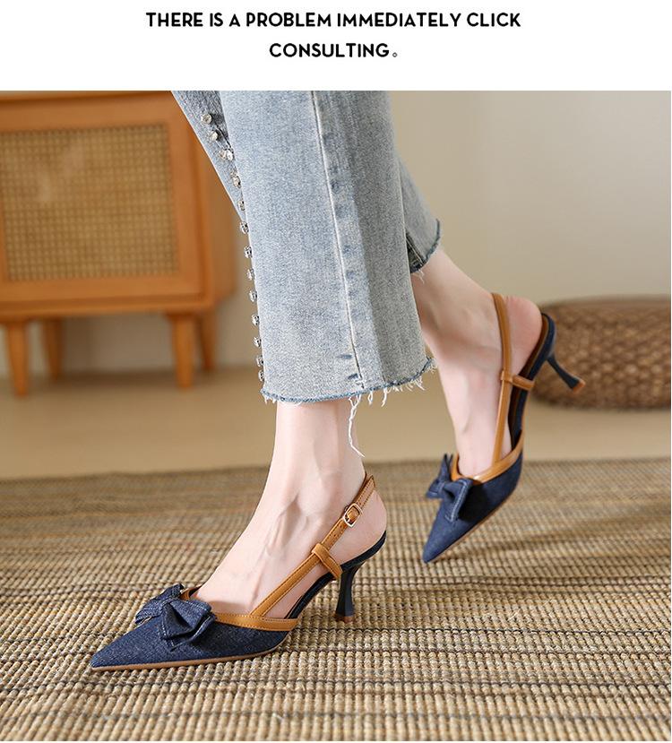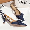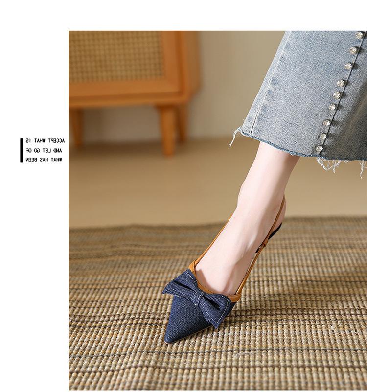 Sandalias de Punta Azul Oscuro Estilo Francés para Mujer Verano 2025 Nuevo Estilo Baotou Tacón de Aguja Lazo de Mezclilla Tacones Altos