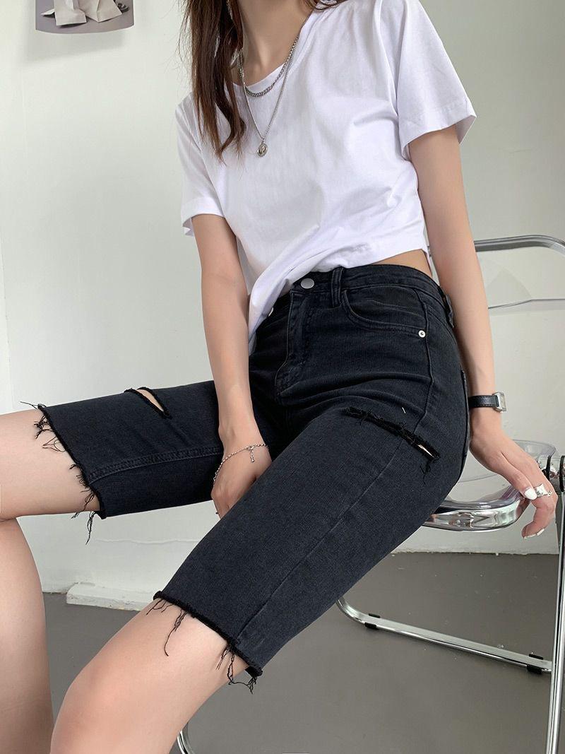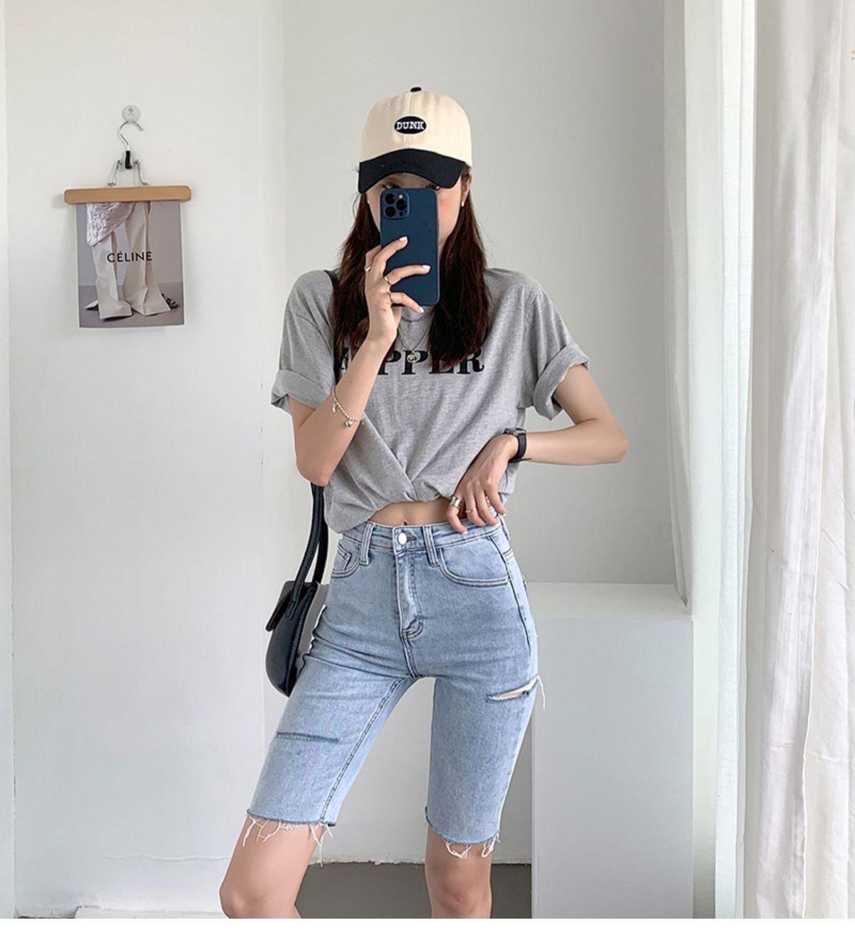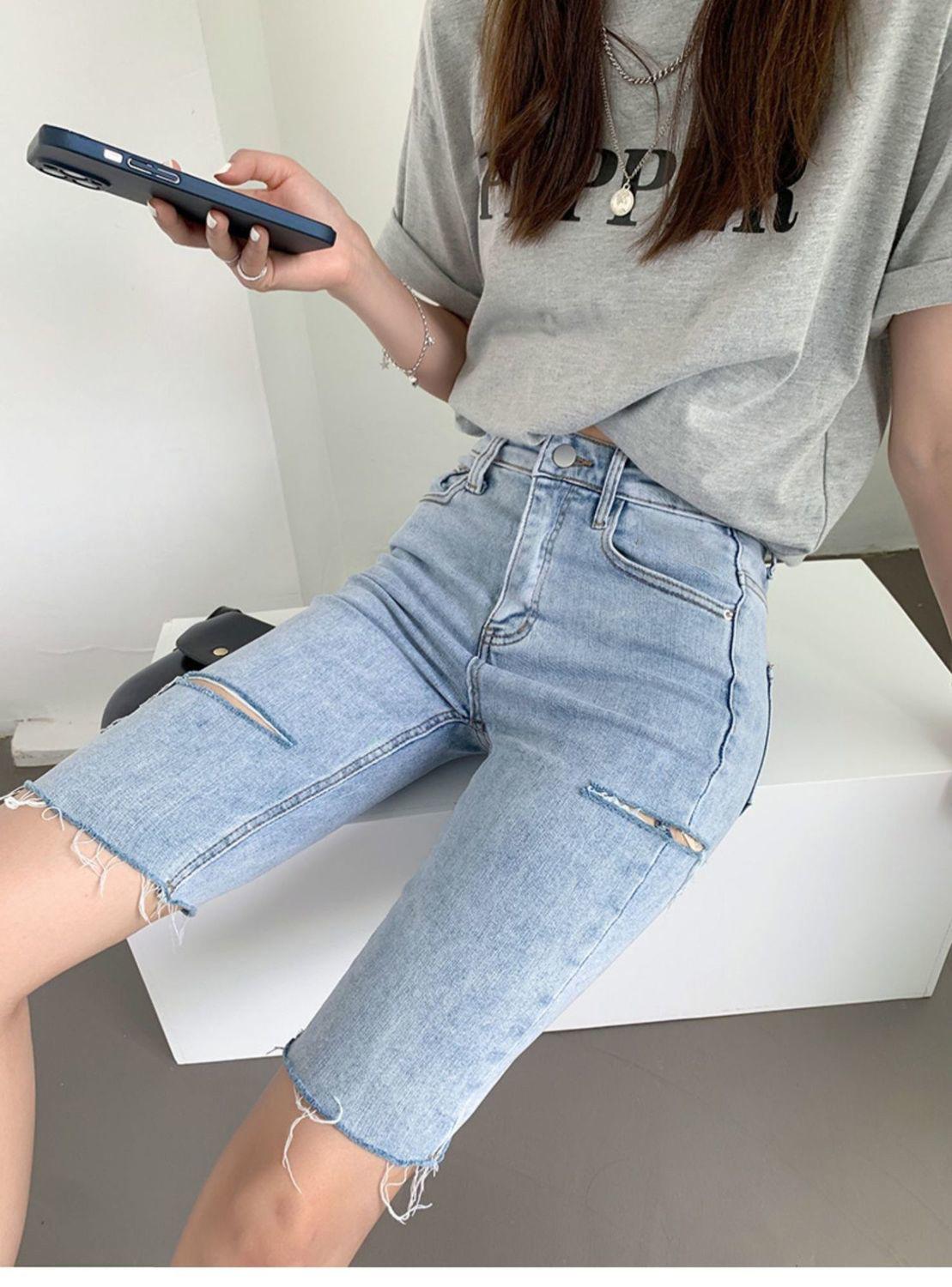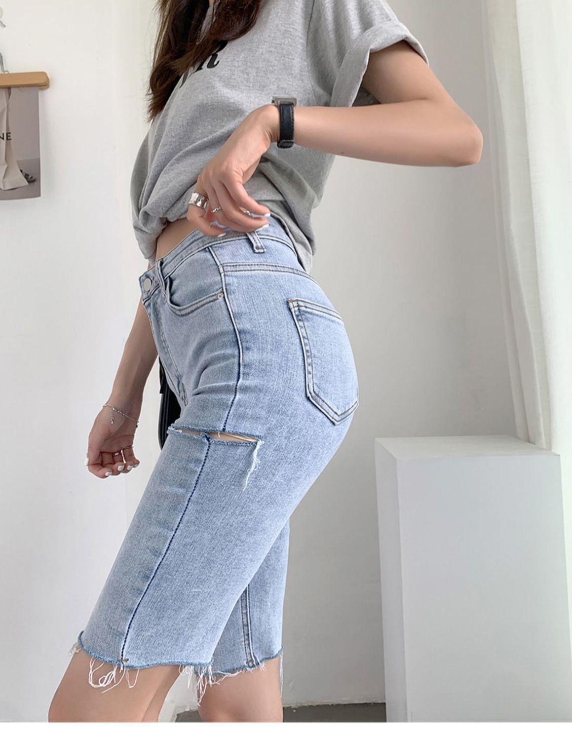 Azul claro Jeans Rotos Verano para Mujer Delgados 2021 Nuevo Elásticos Ajustados Cintura Alta Aspecto Delgado Pantalones Cinco Puntos