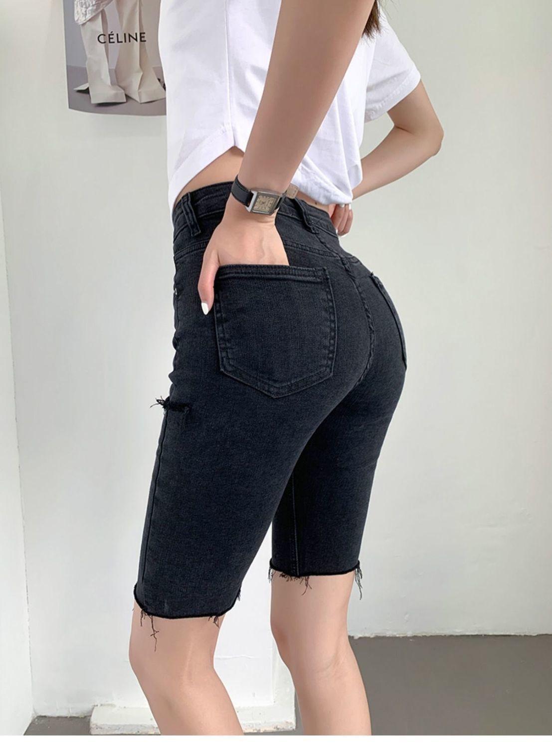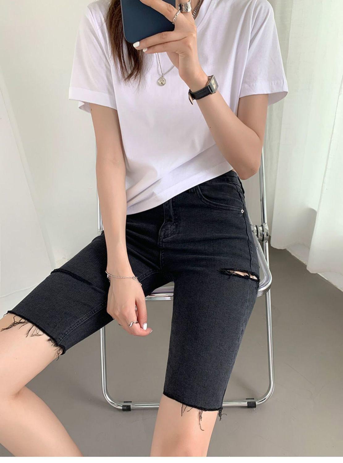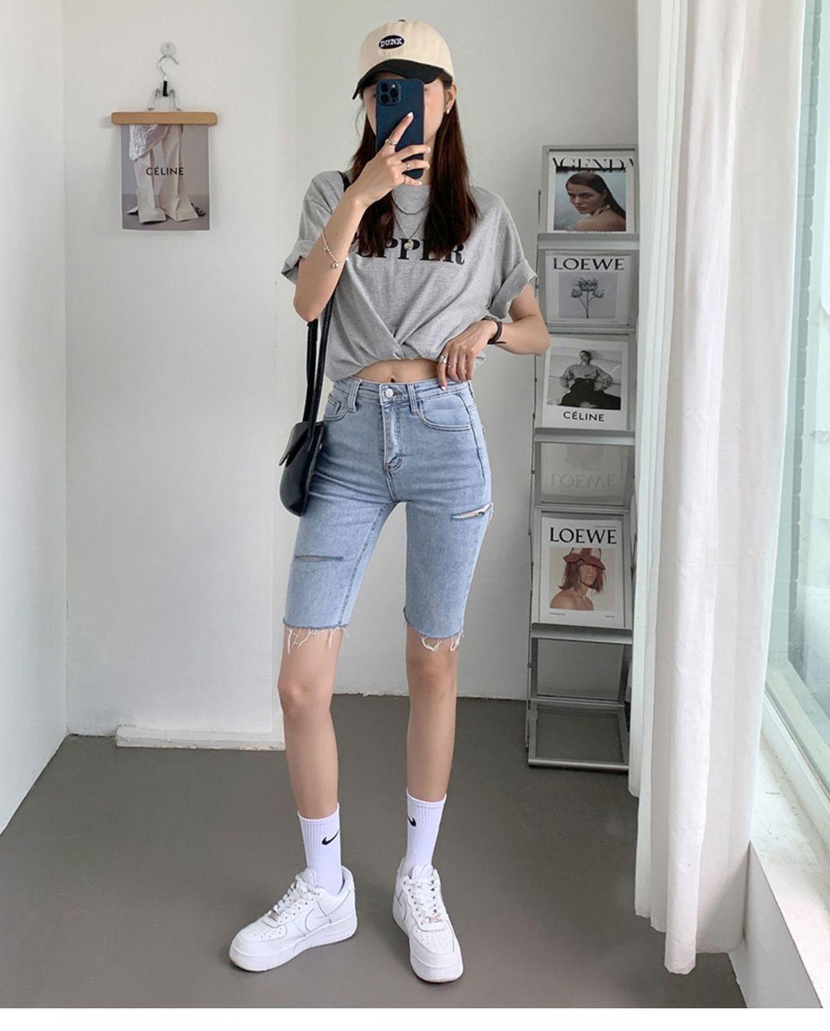 Azul claro Jeans Rotos Verano para Mujer Delgados 2021 Nuevo Elásticos Ajustados Cintura Alta Aspecto Delgado Pantalones Cinco Puntos