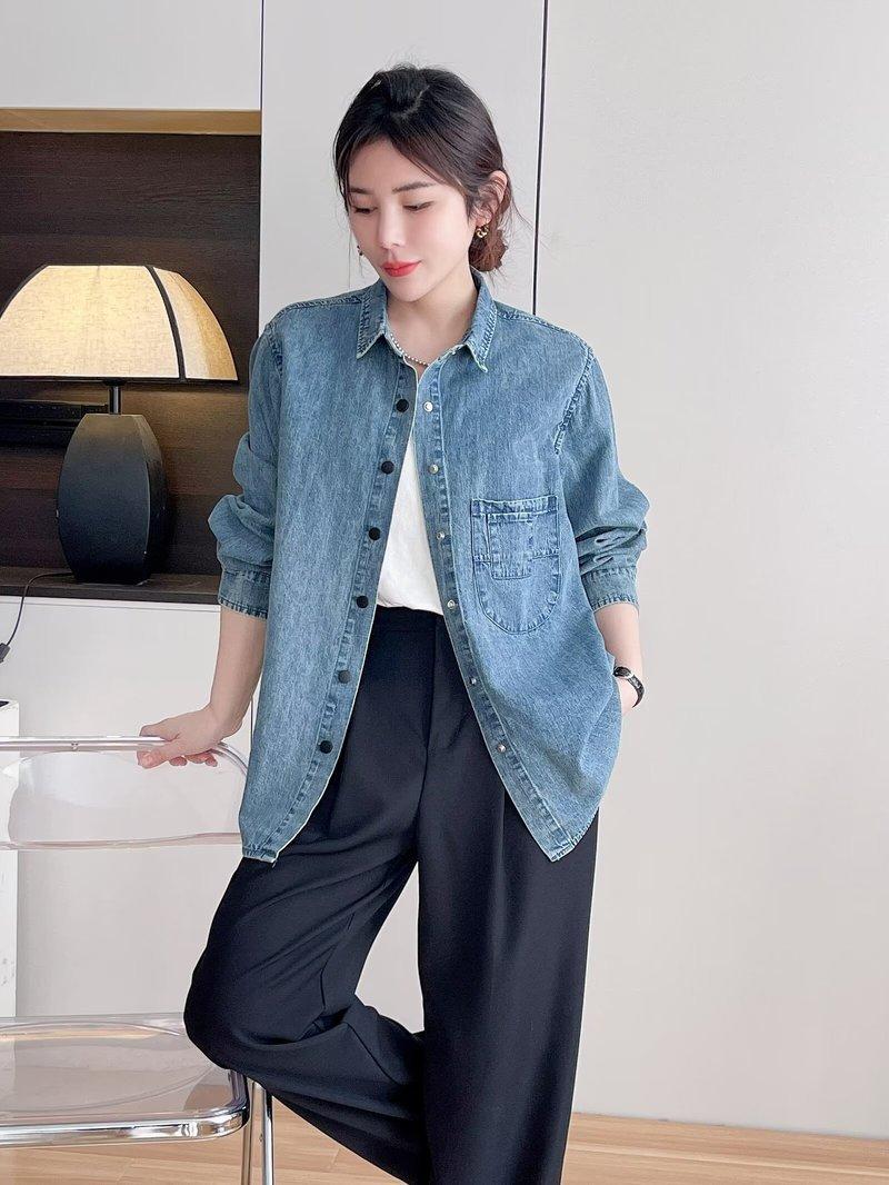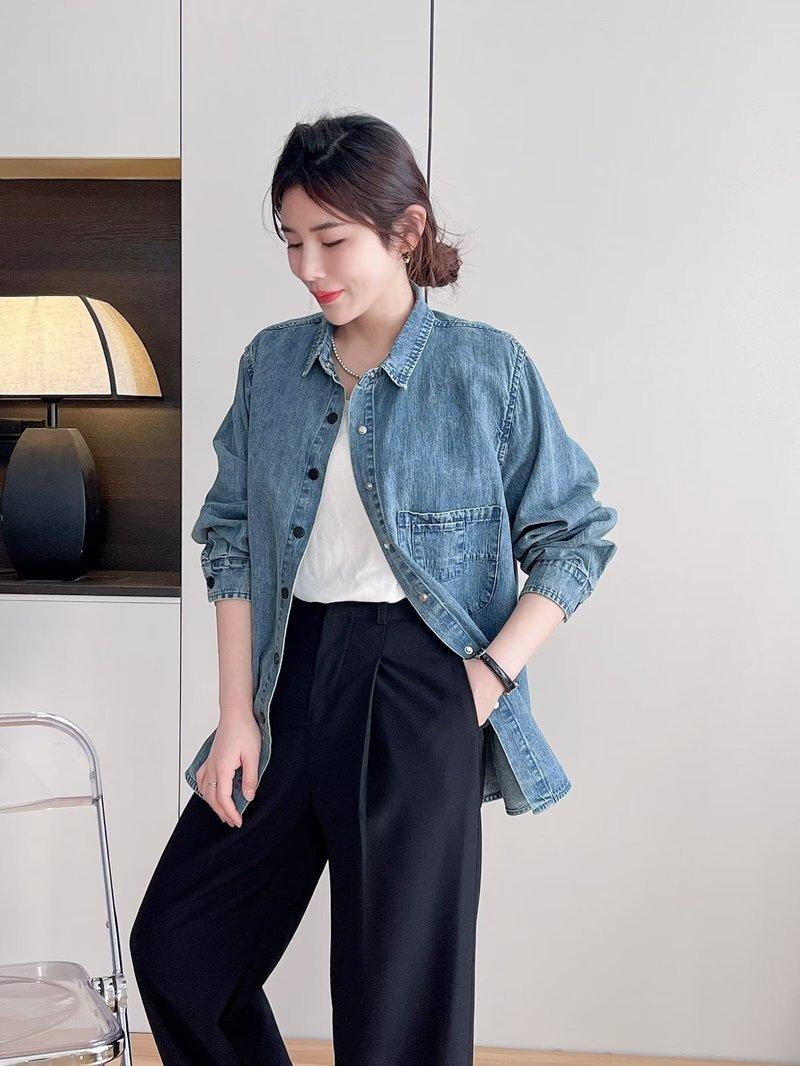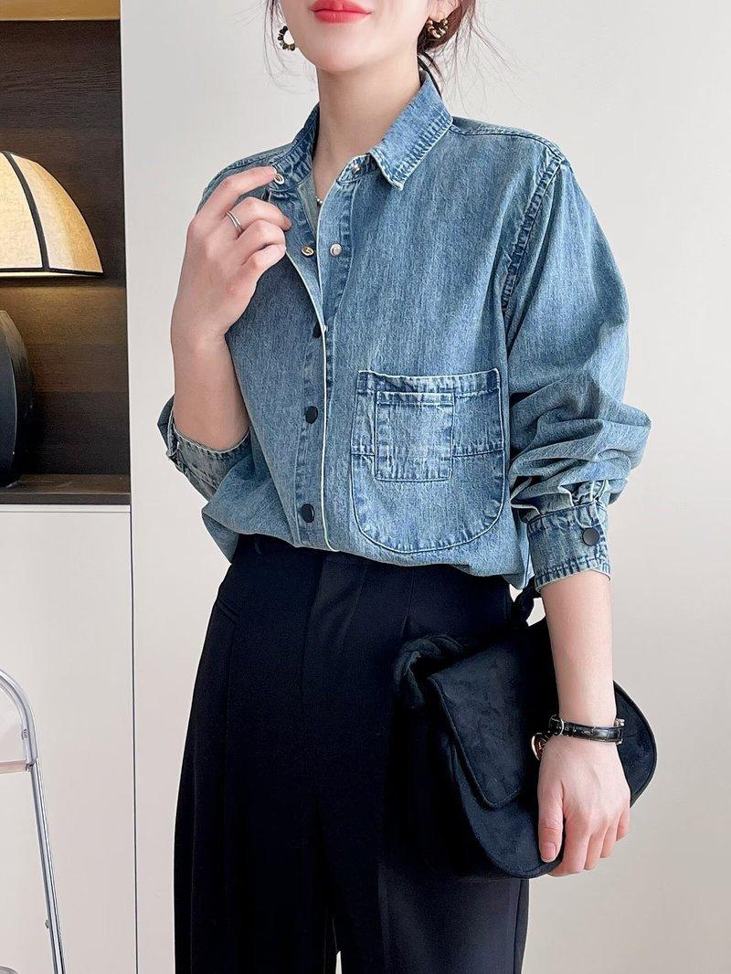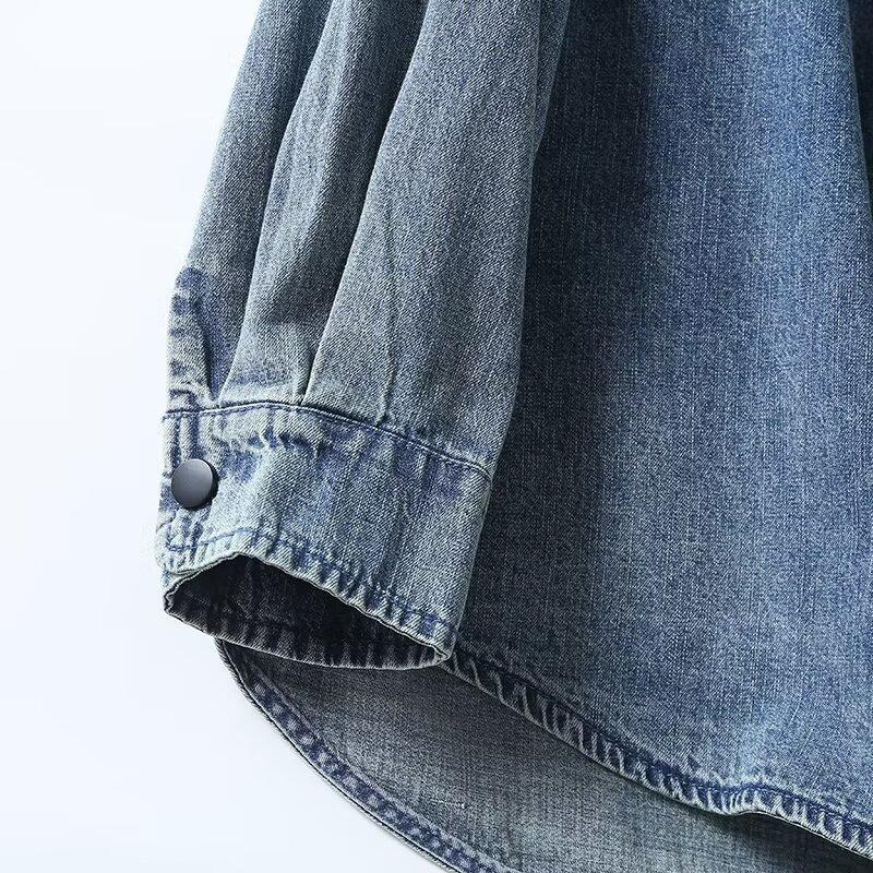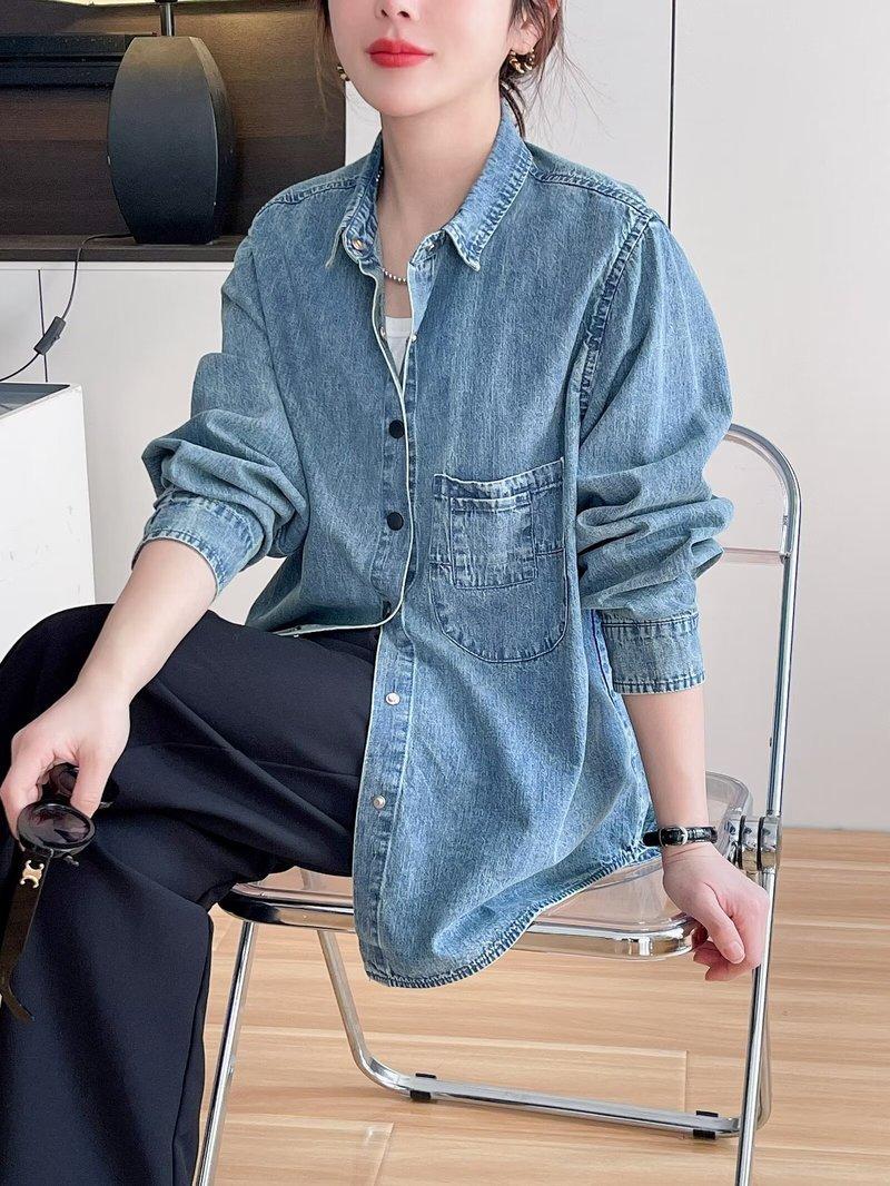 Camisa de mezclilla de algodón lavado suelta de solapa vintage desgastada primavera 2024 cárdigan de solapa abrigo delgado para mujer