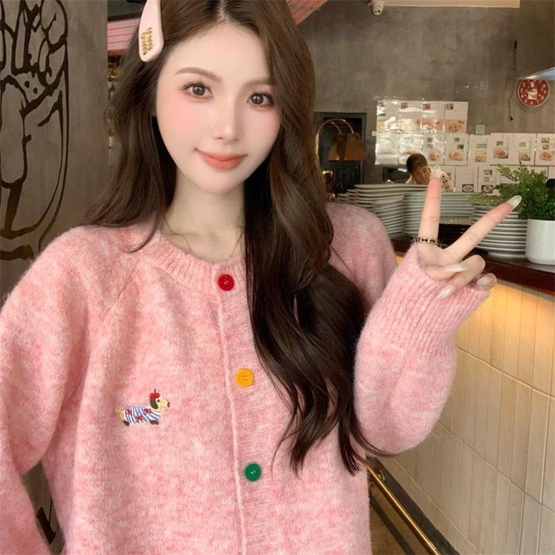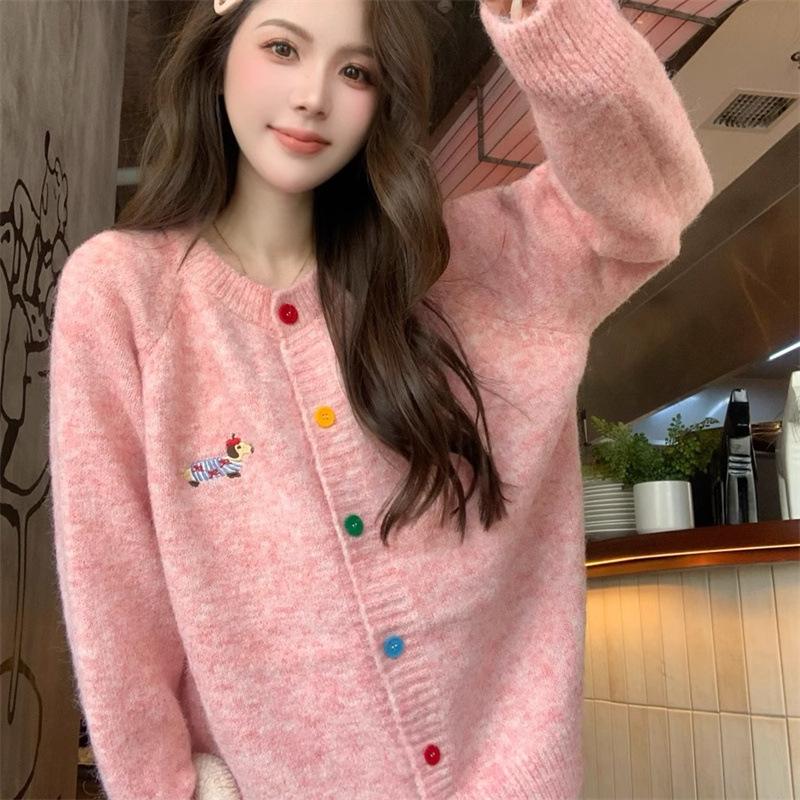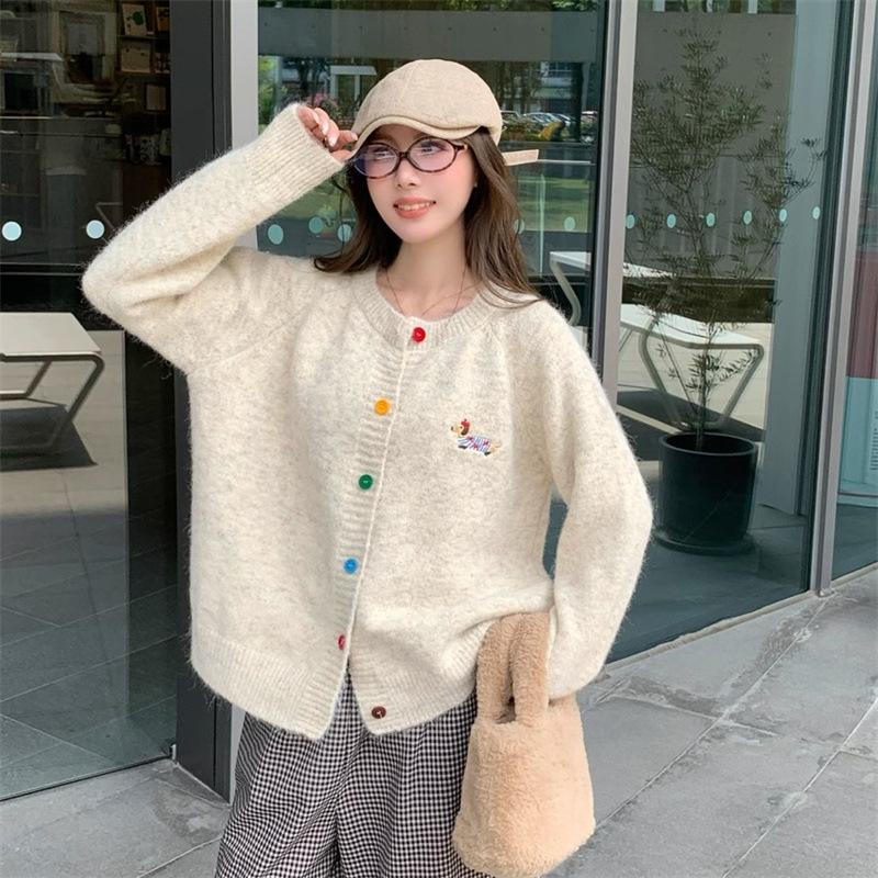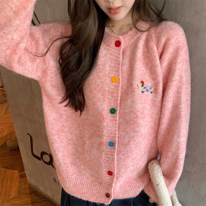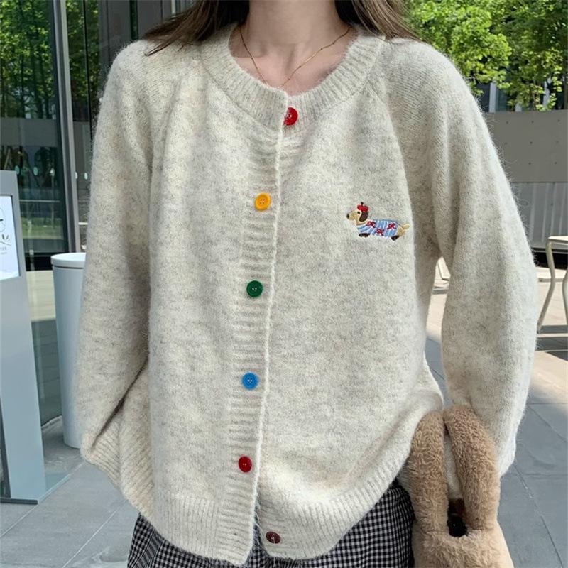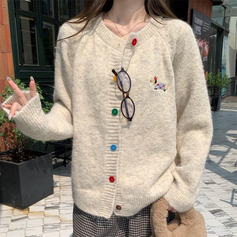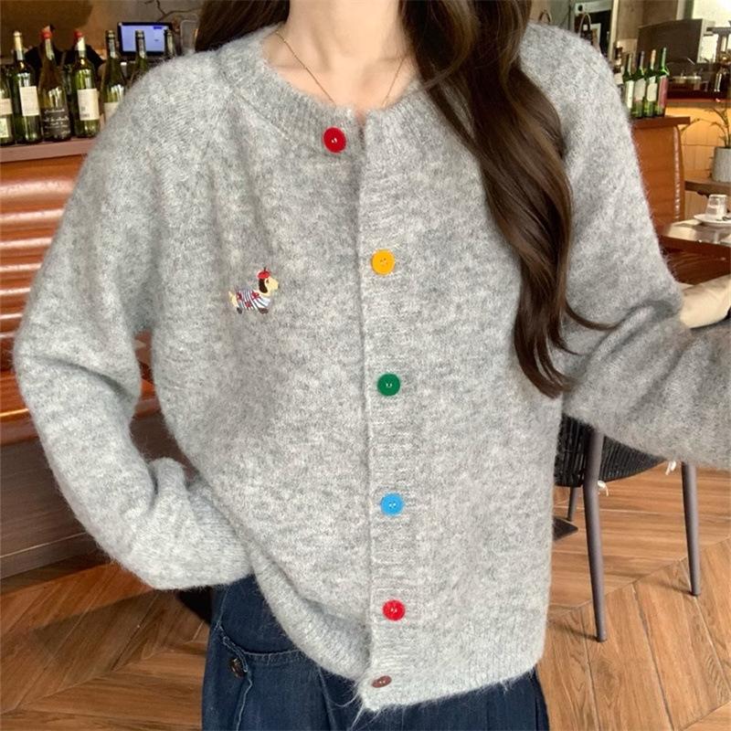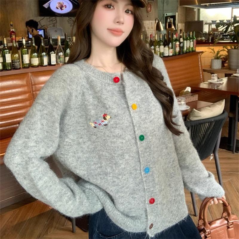 Sudadera de cuello redondo Dopamine con botones de color, bordado de cachorro, manga larga, cárdigan de punto para mujer, otoño 2024, estilo coreano, top combinable