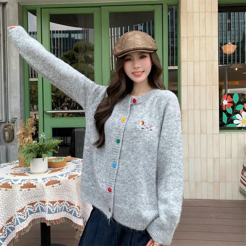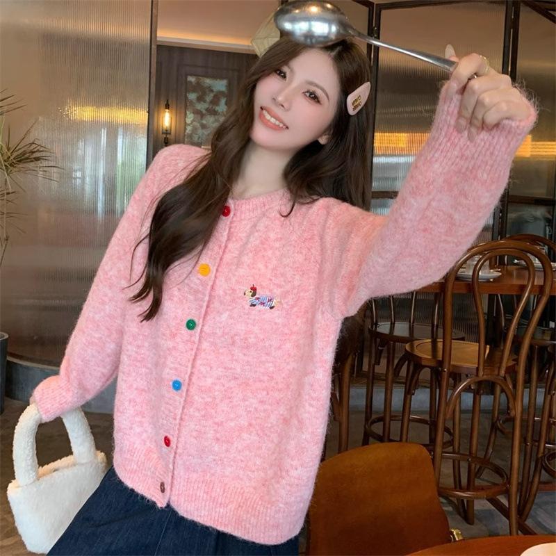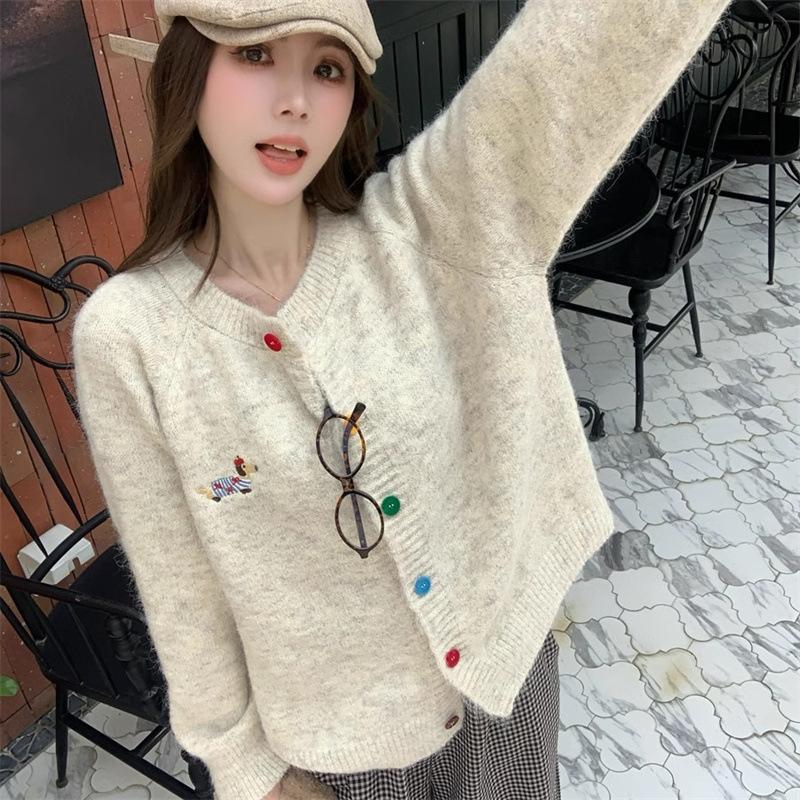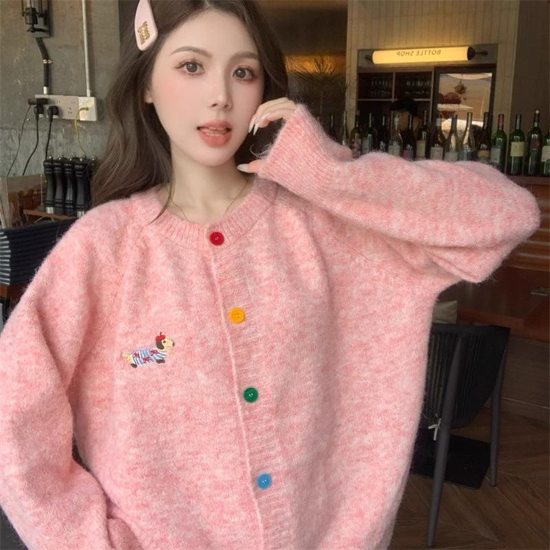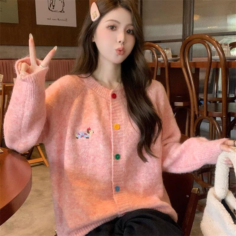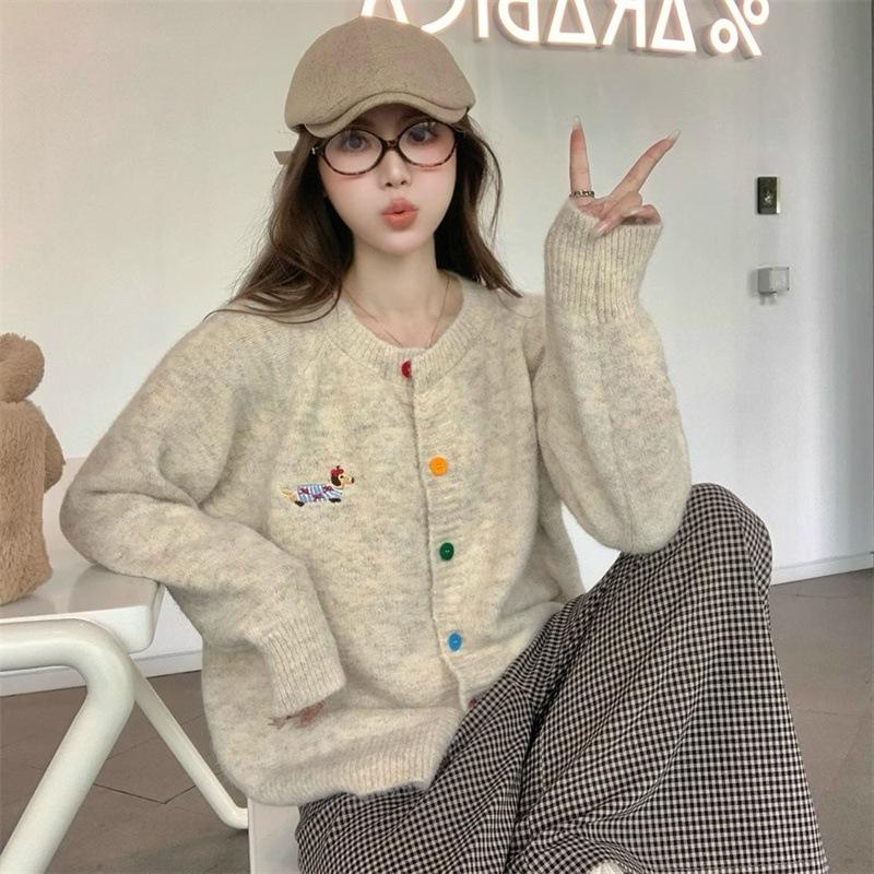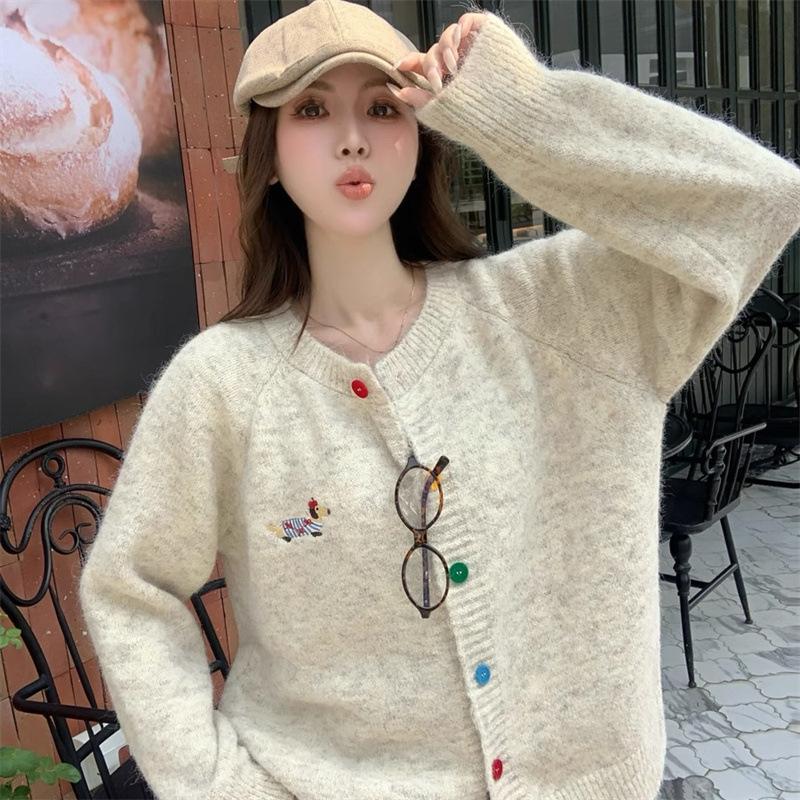Sudadera de cuello redondo Dopamine con botones de color, bordado de cachorro, manga larga, cárdigan de punto para mujer, otoño 2024, estilo coreano, top combinable