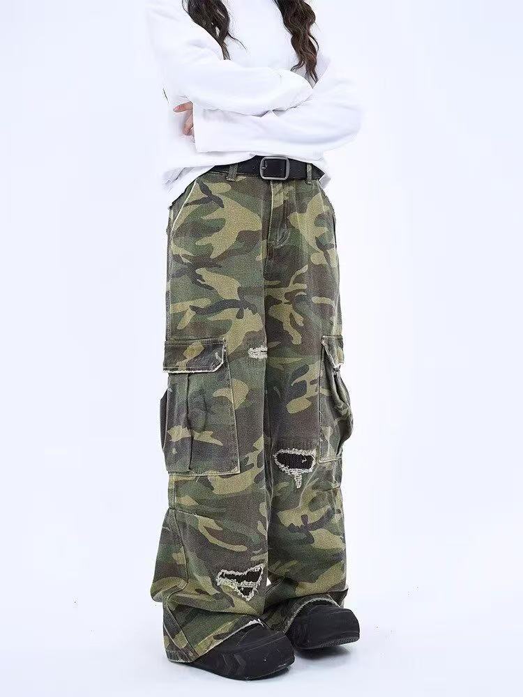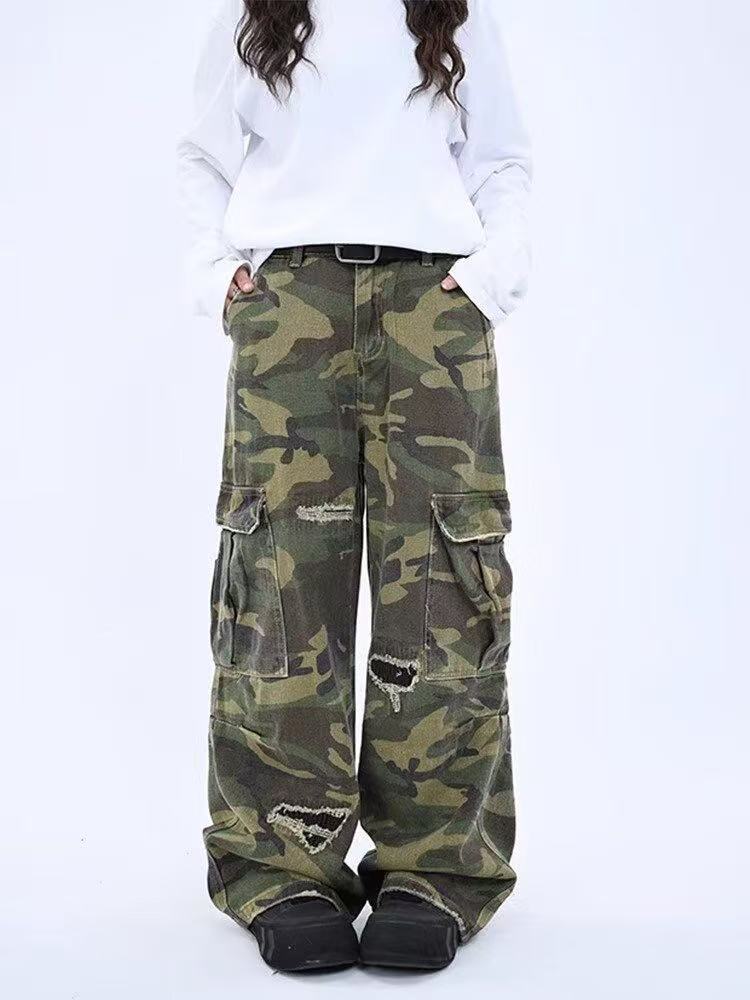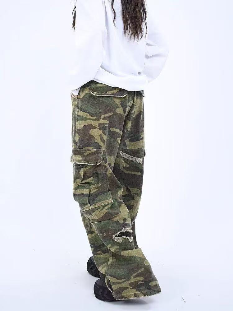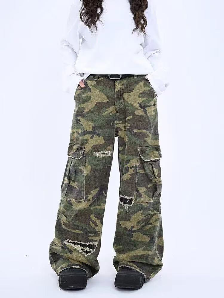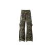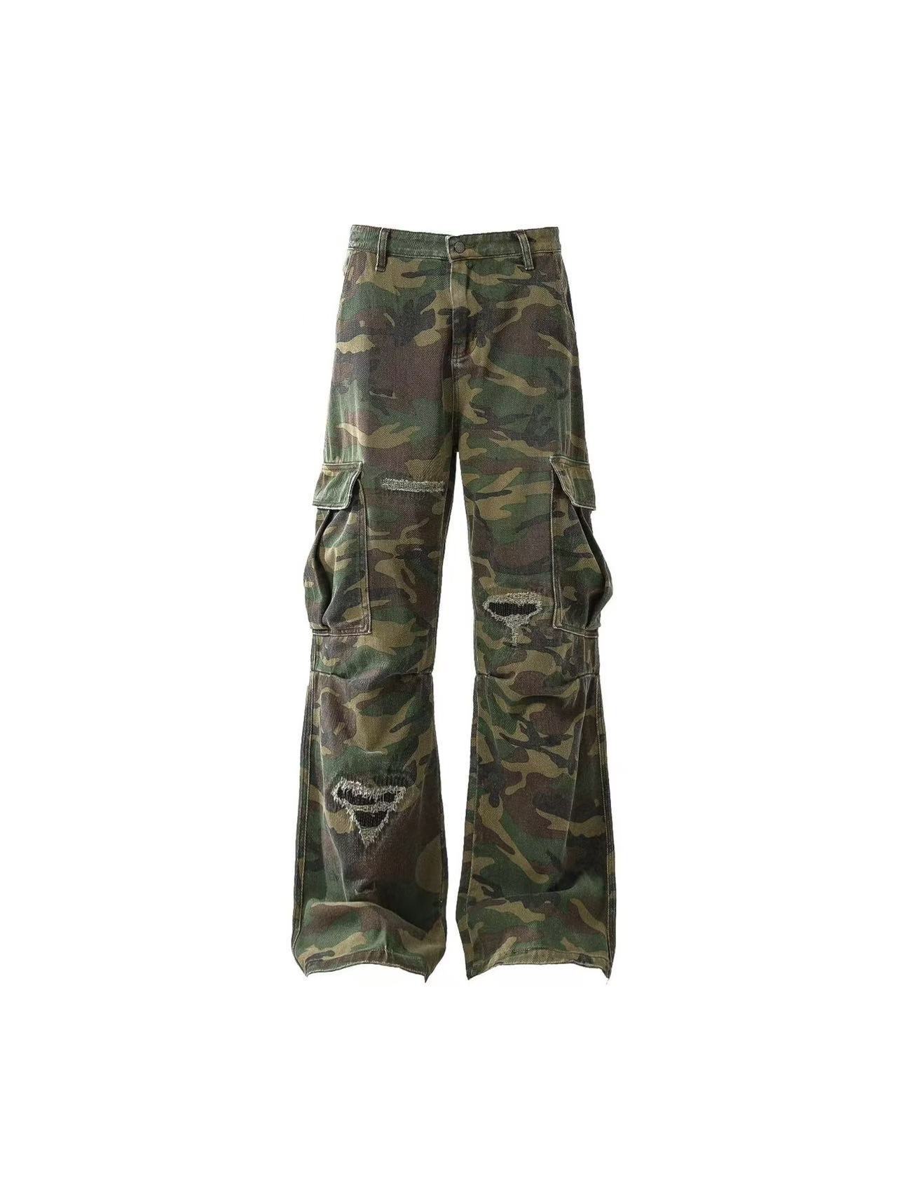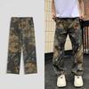 Jeans de Calle con Estampado de Camuflaje para Hombre Pantalones Rectos Holgados hasta el Piso de Pierna Ancha Primavera Ins a la Moda Pantalones Largos de Alta Calle