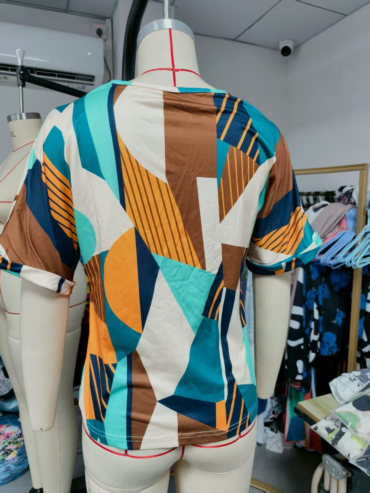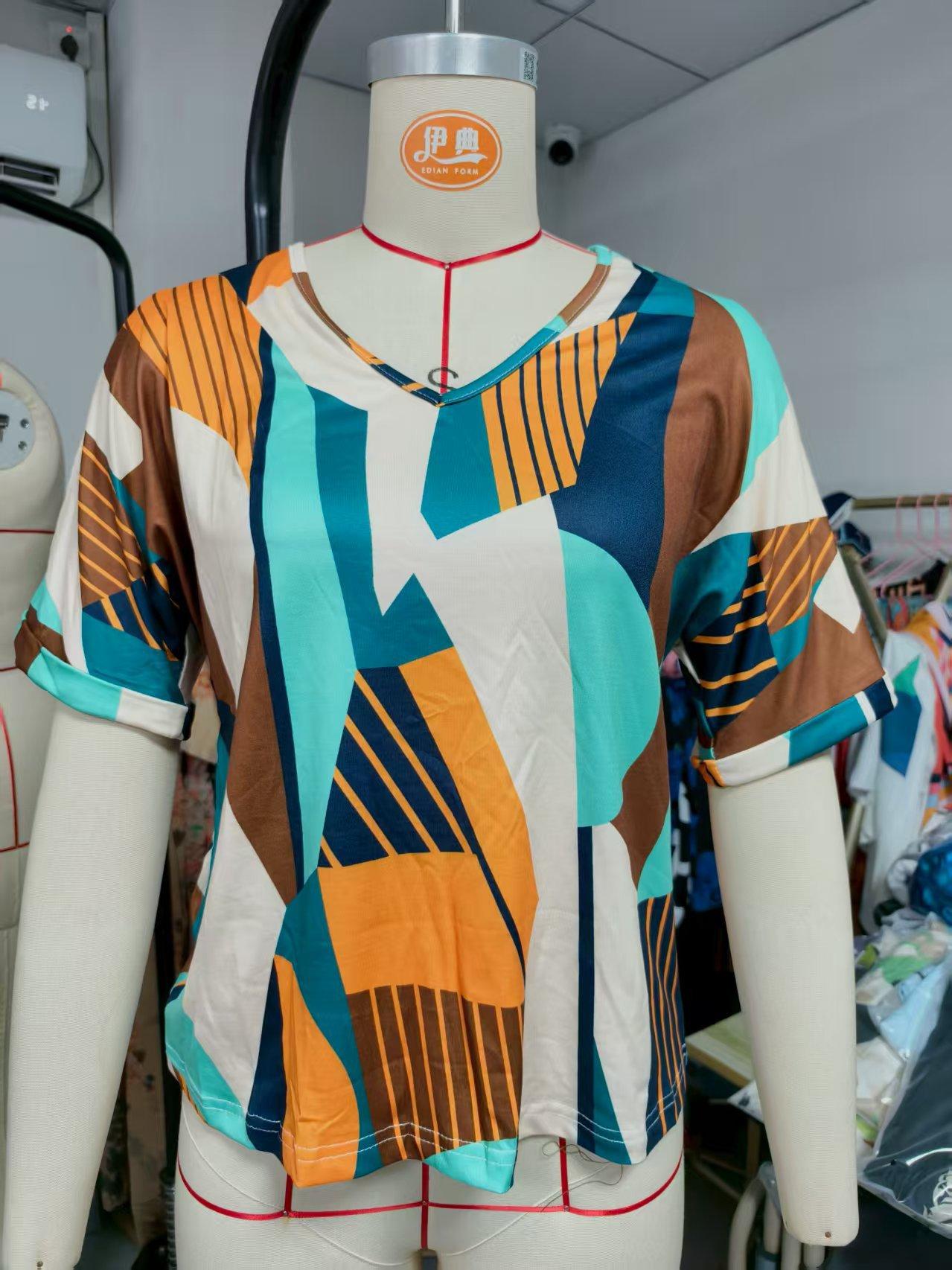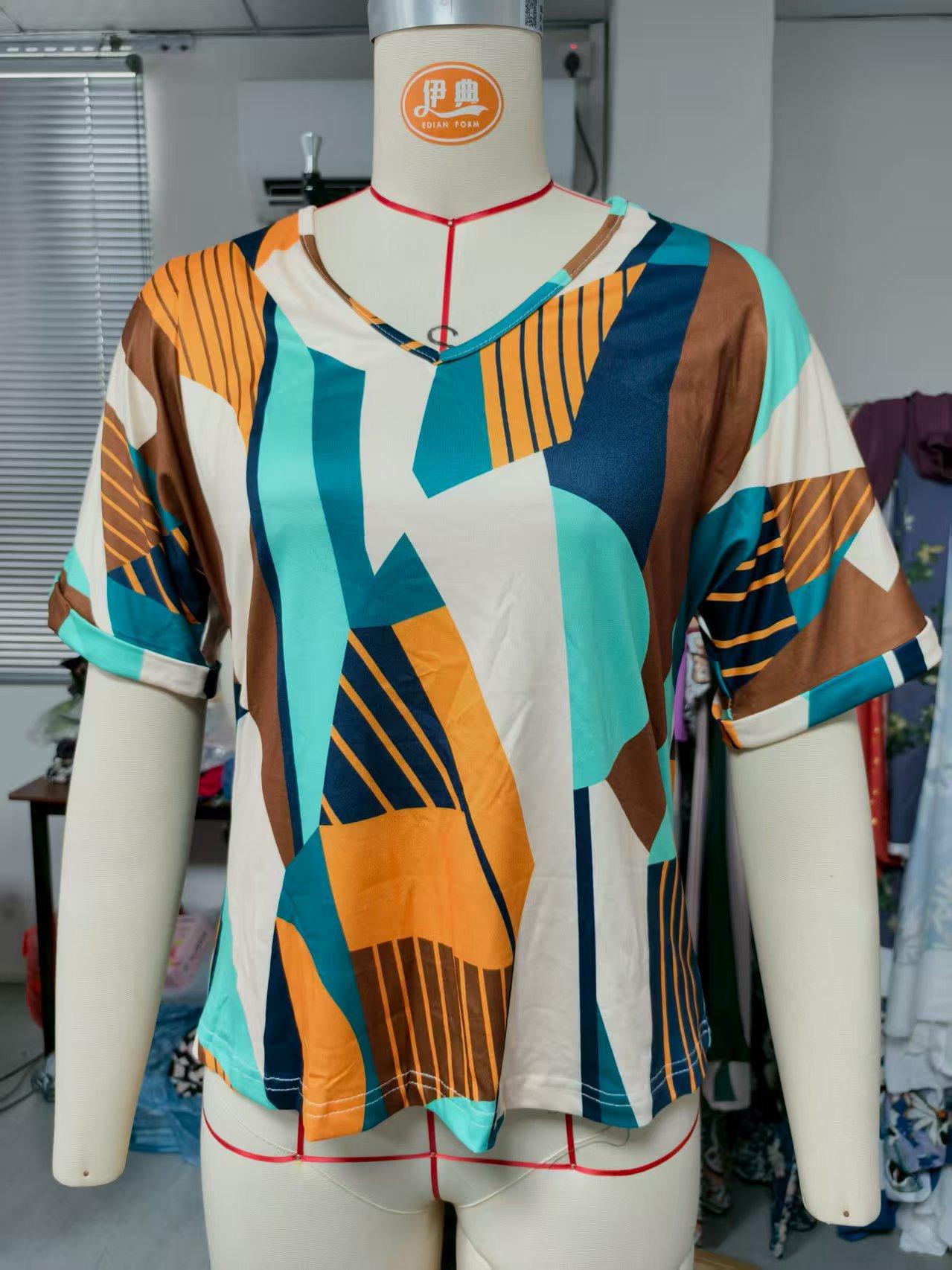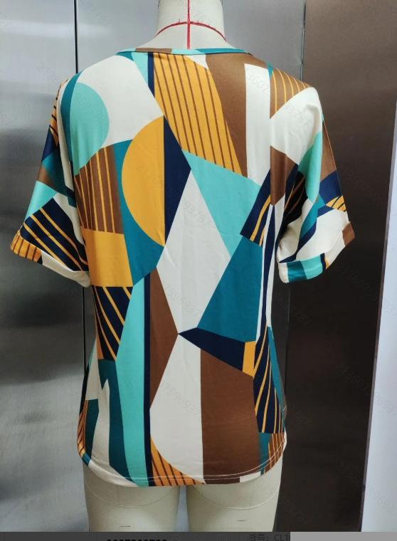 Amazon Export Europeo y Americano 2023 Verano Nuevo Cuello en V Estampado Tops de Manga Corta para Mujer con Camisetas Contrastantes de Patrón Geométrico