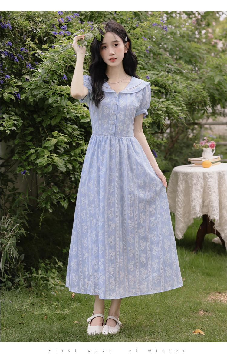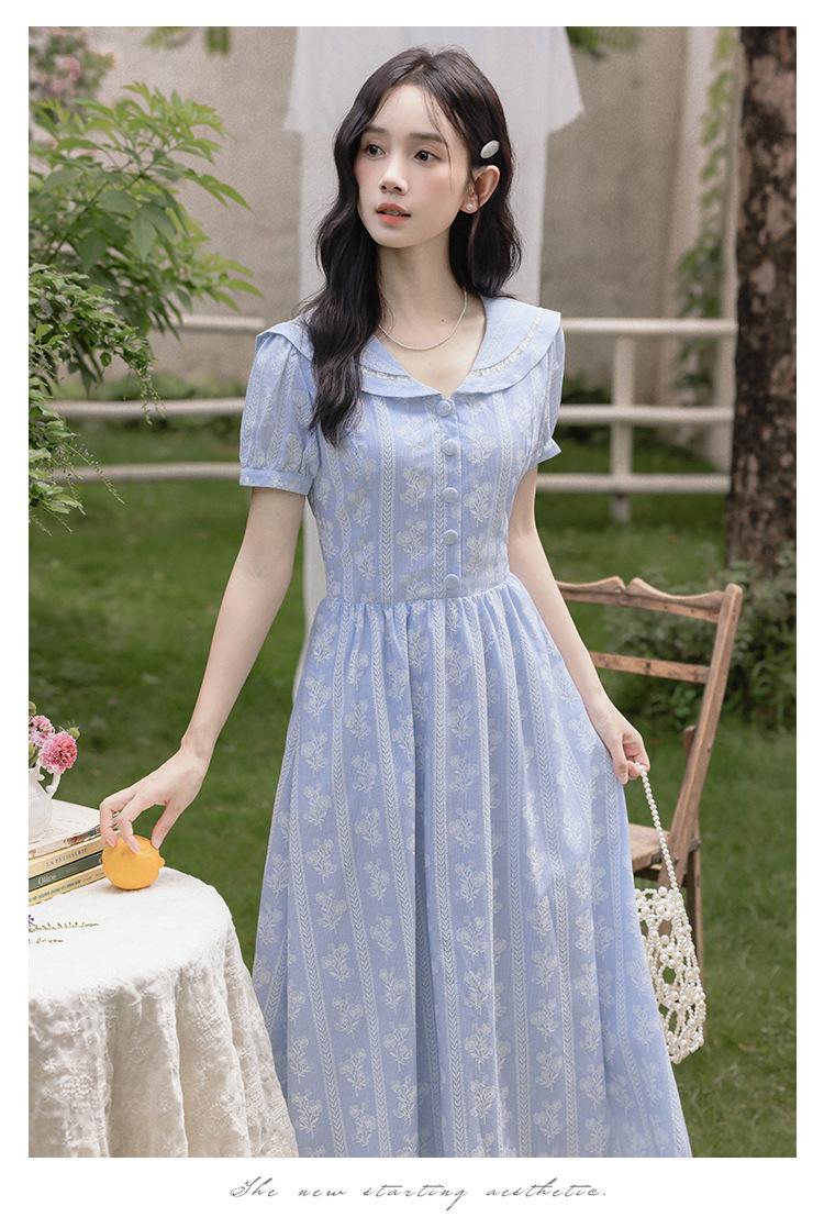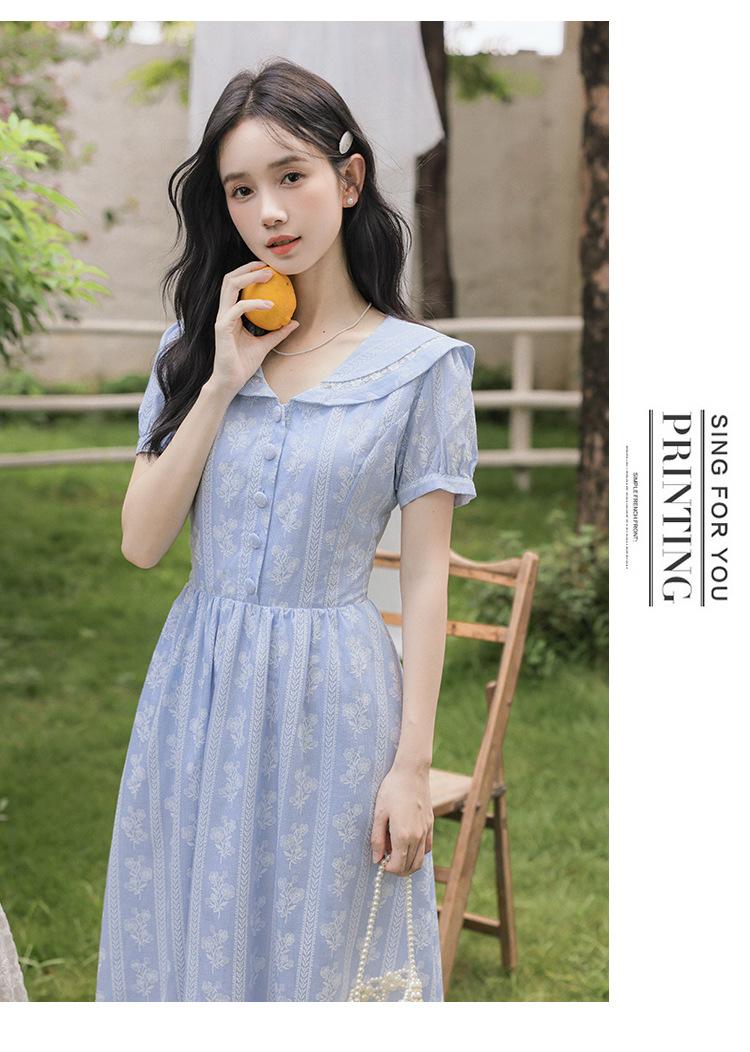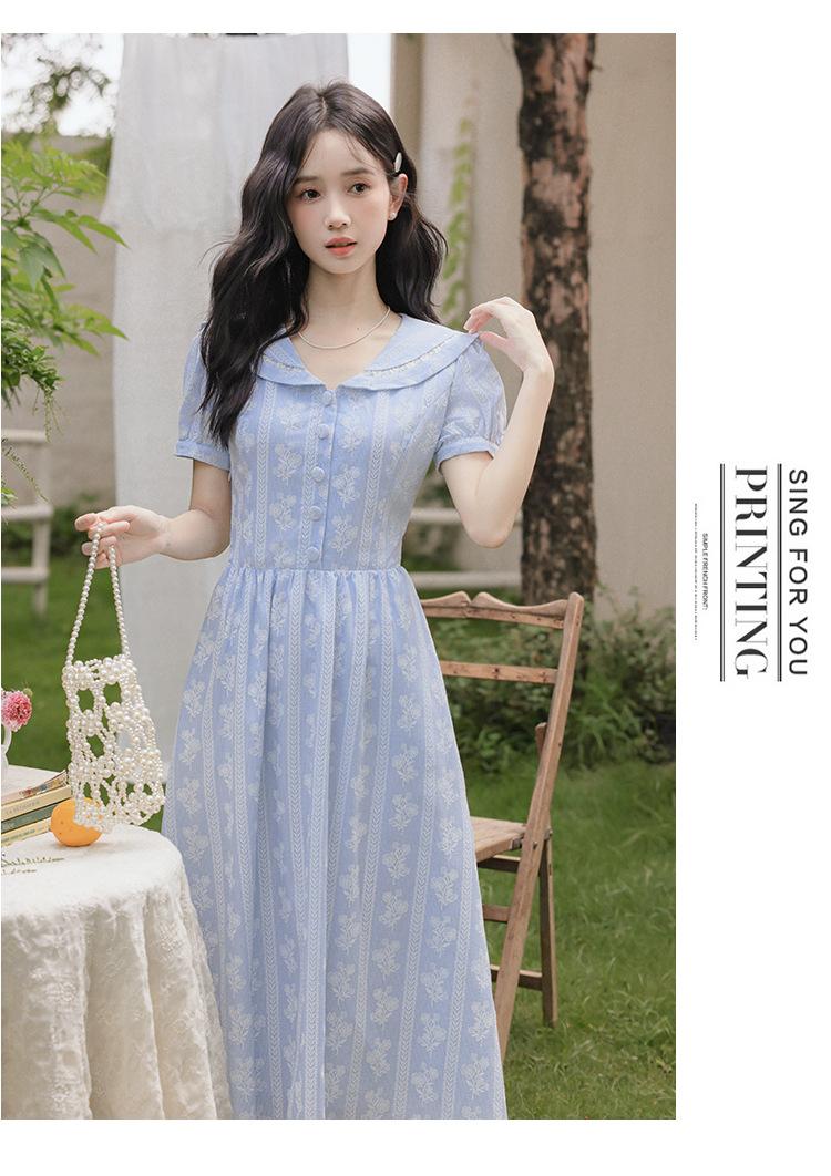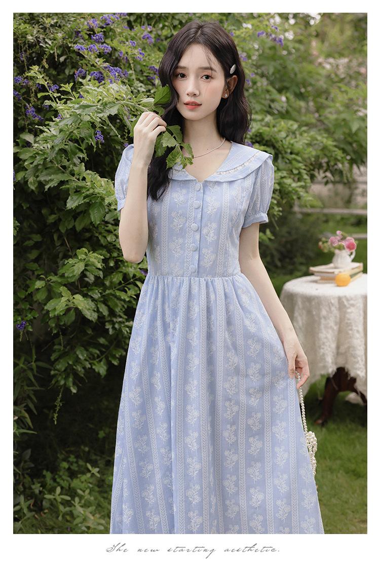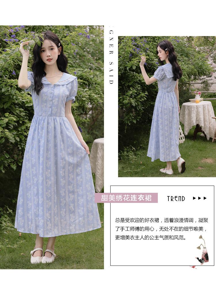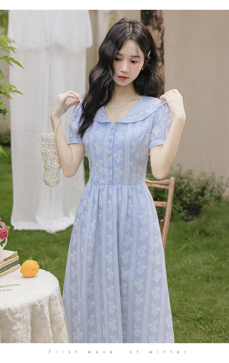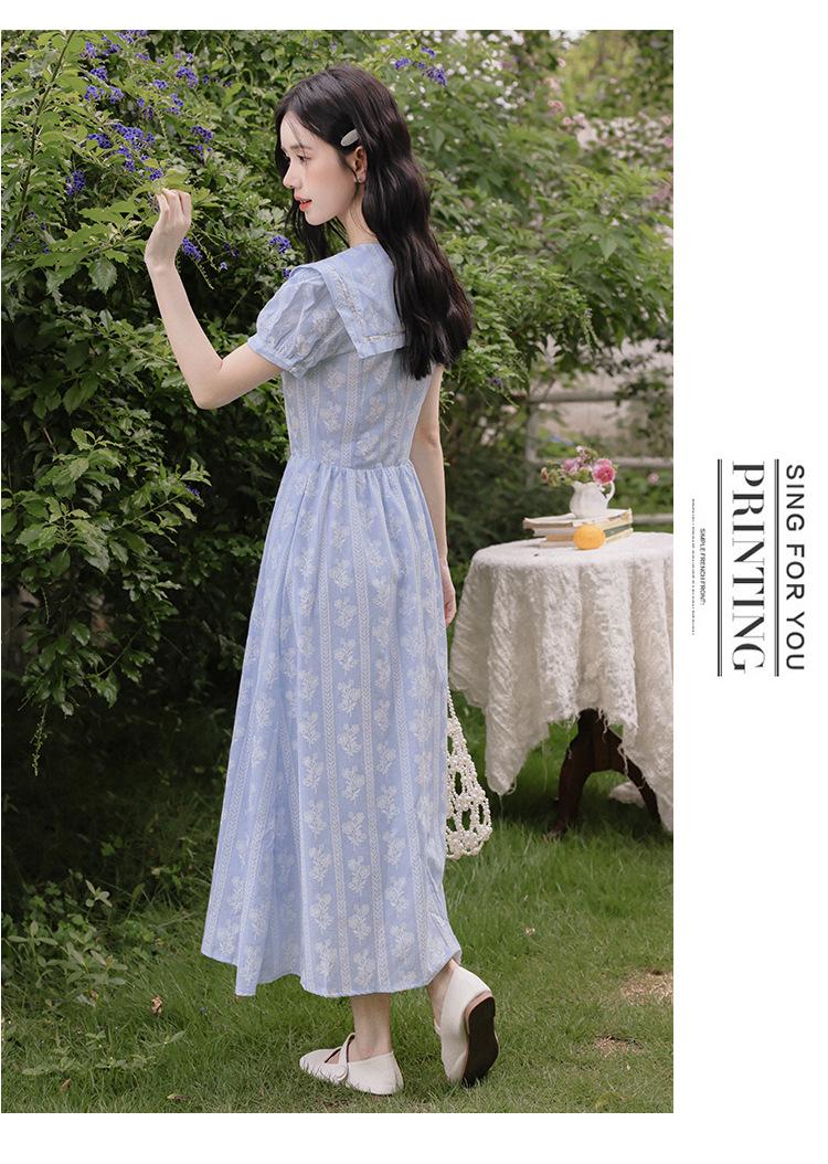 No menos de 149 vestido francés dulce con cuello marinero, manga abullonada, estampado y bordado, estilo fresco y pequeño