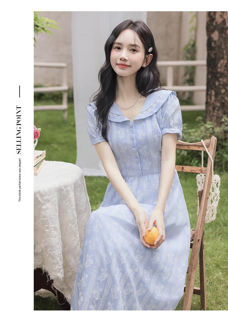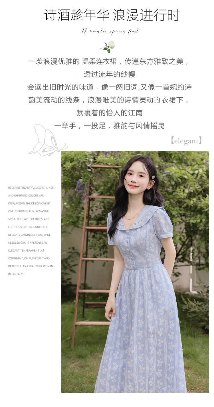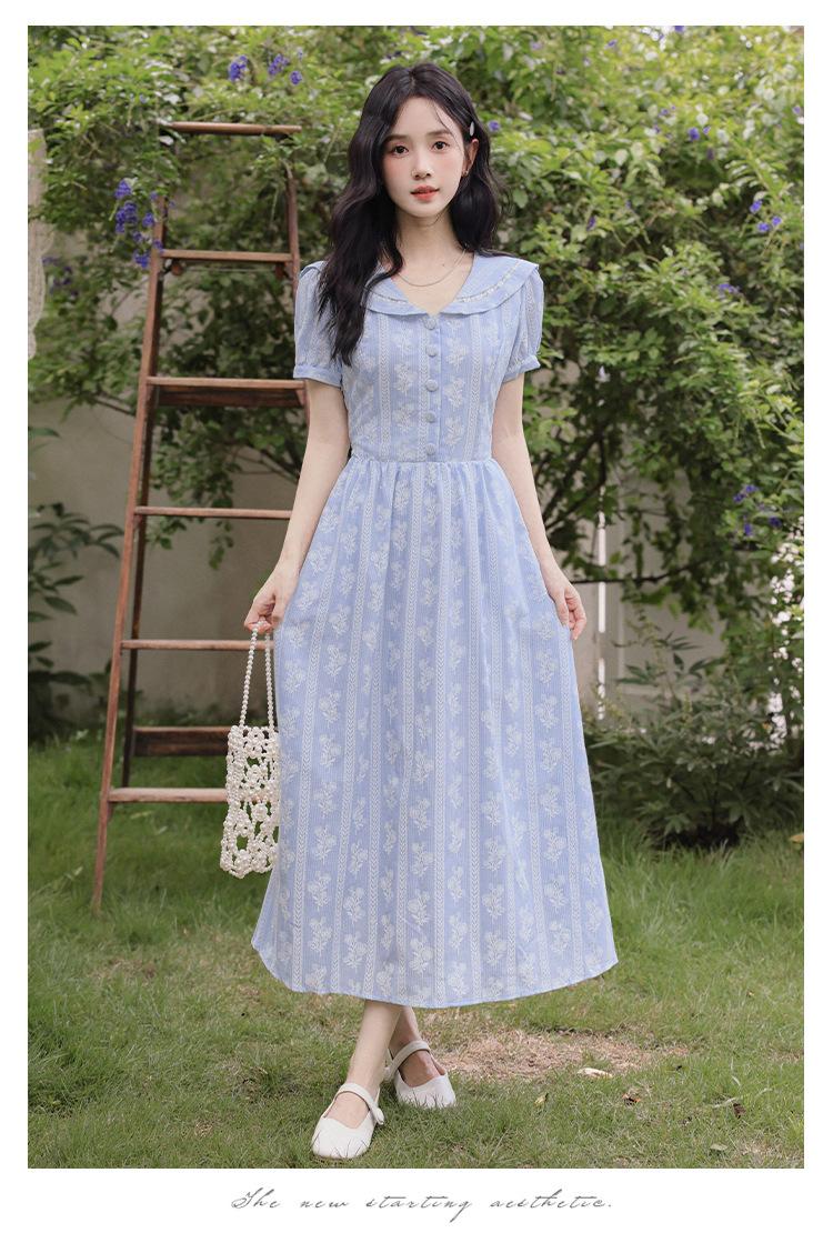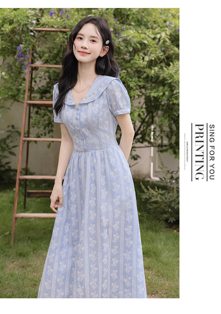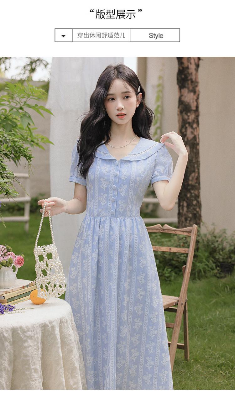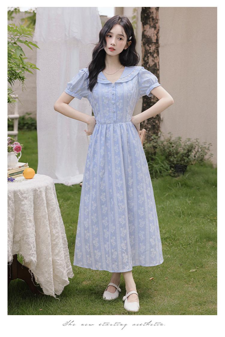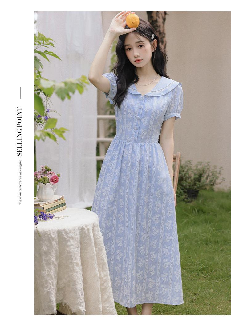 No menos de 149 vestido francés dulce con cuello marinero, manga abullonada, estampado y bordado, estilo fresco y pequeño