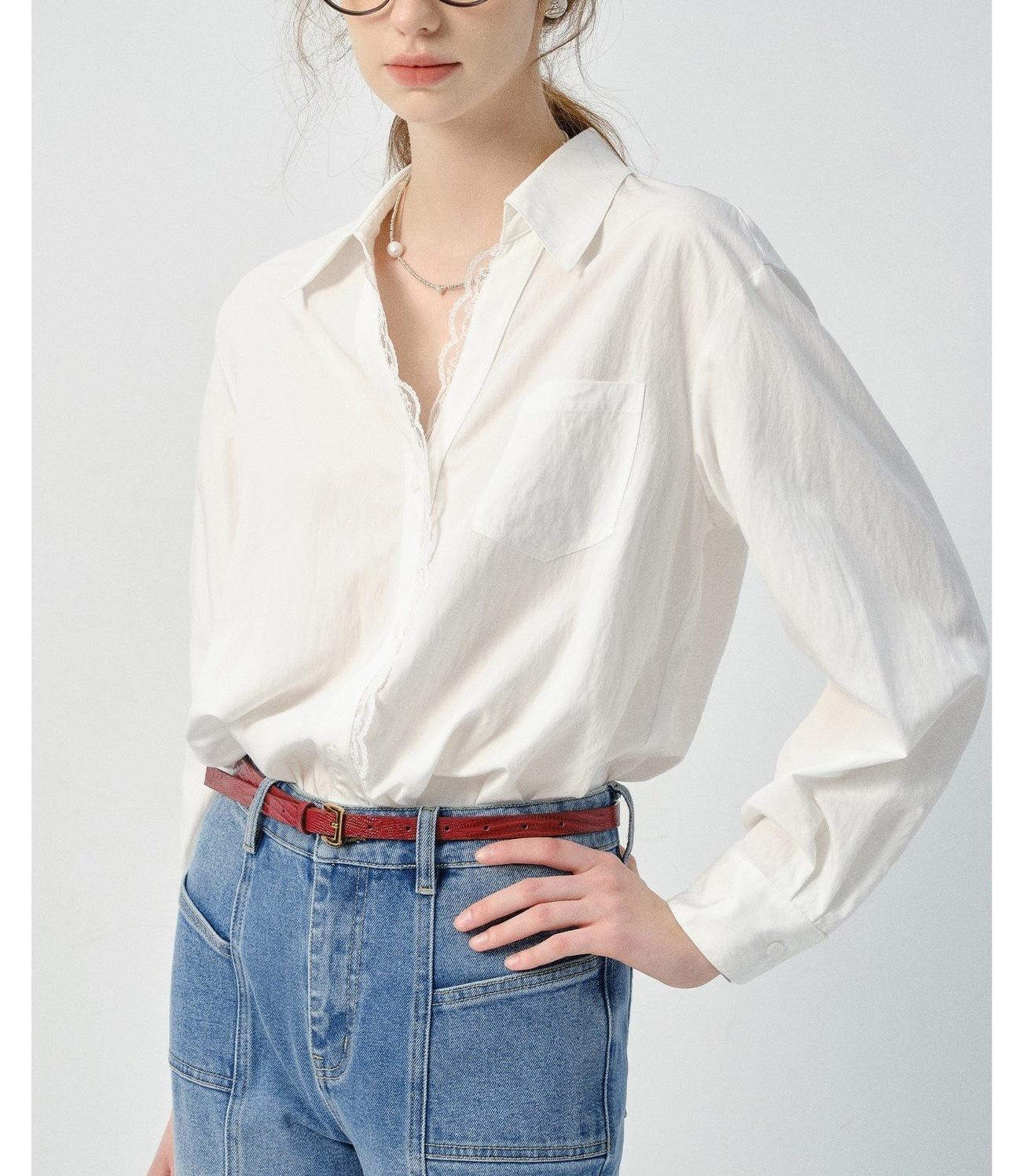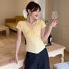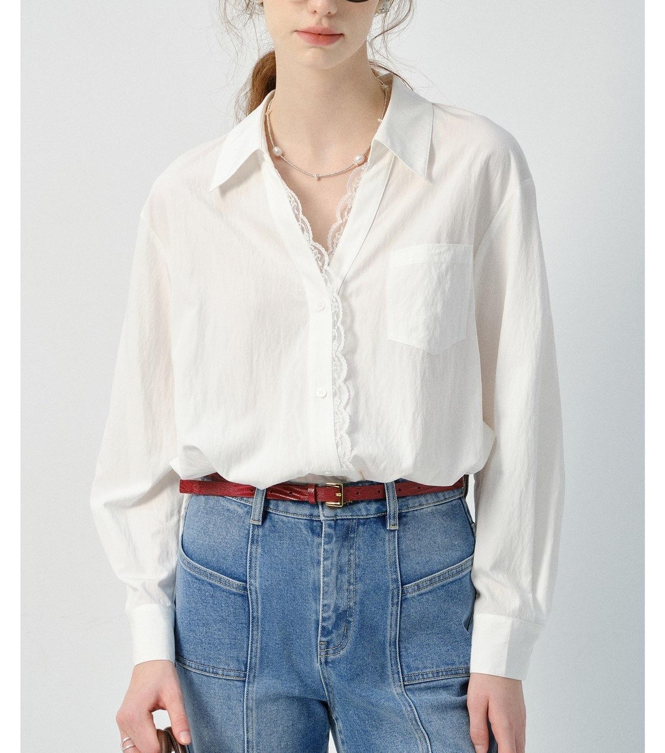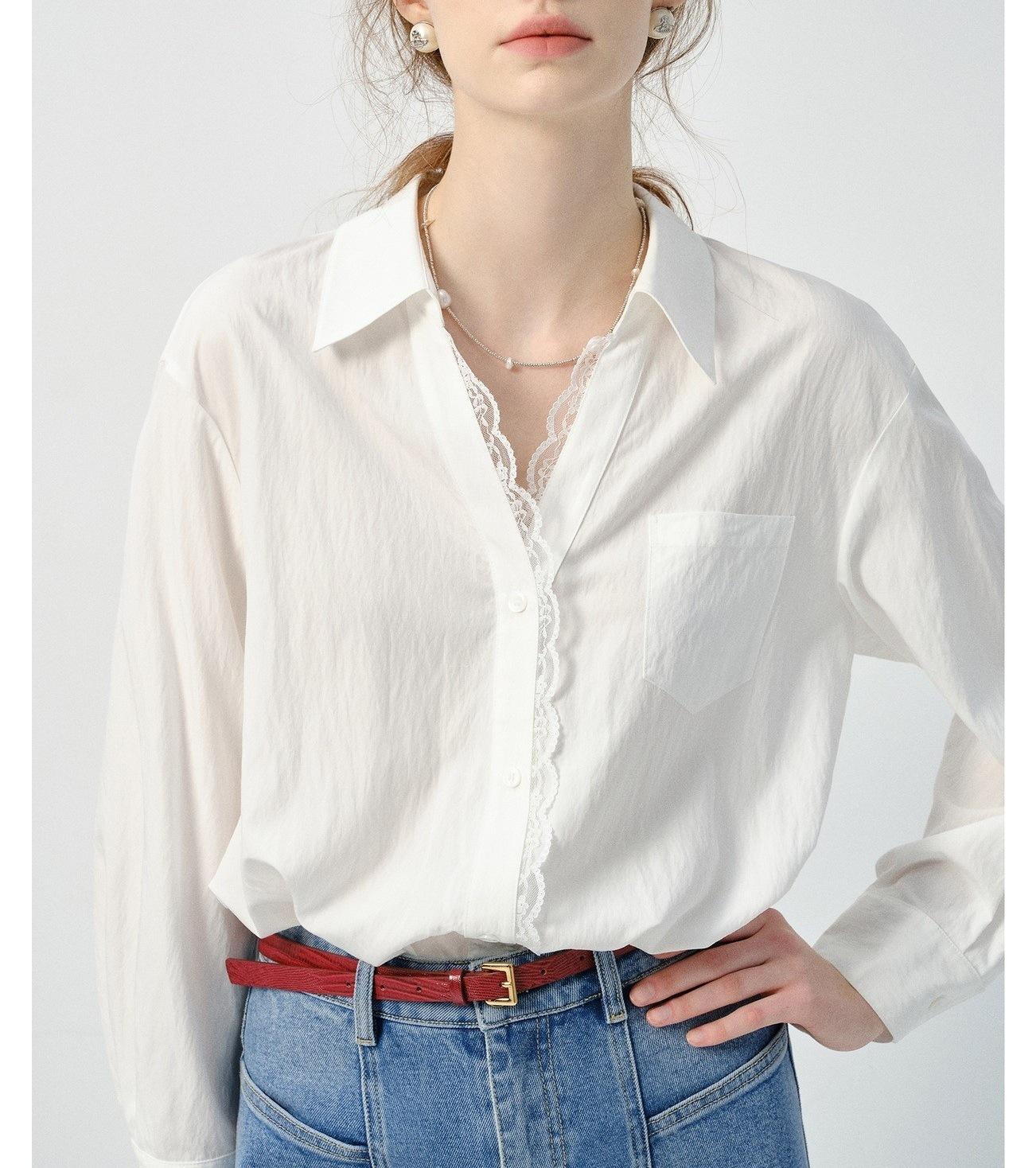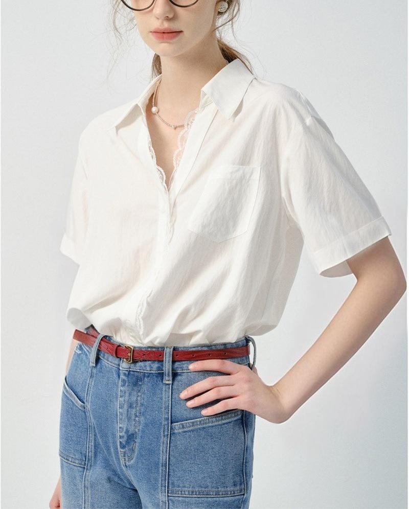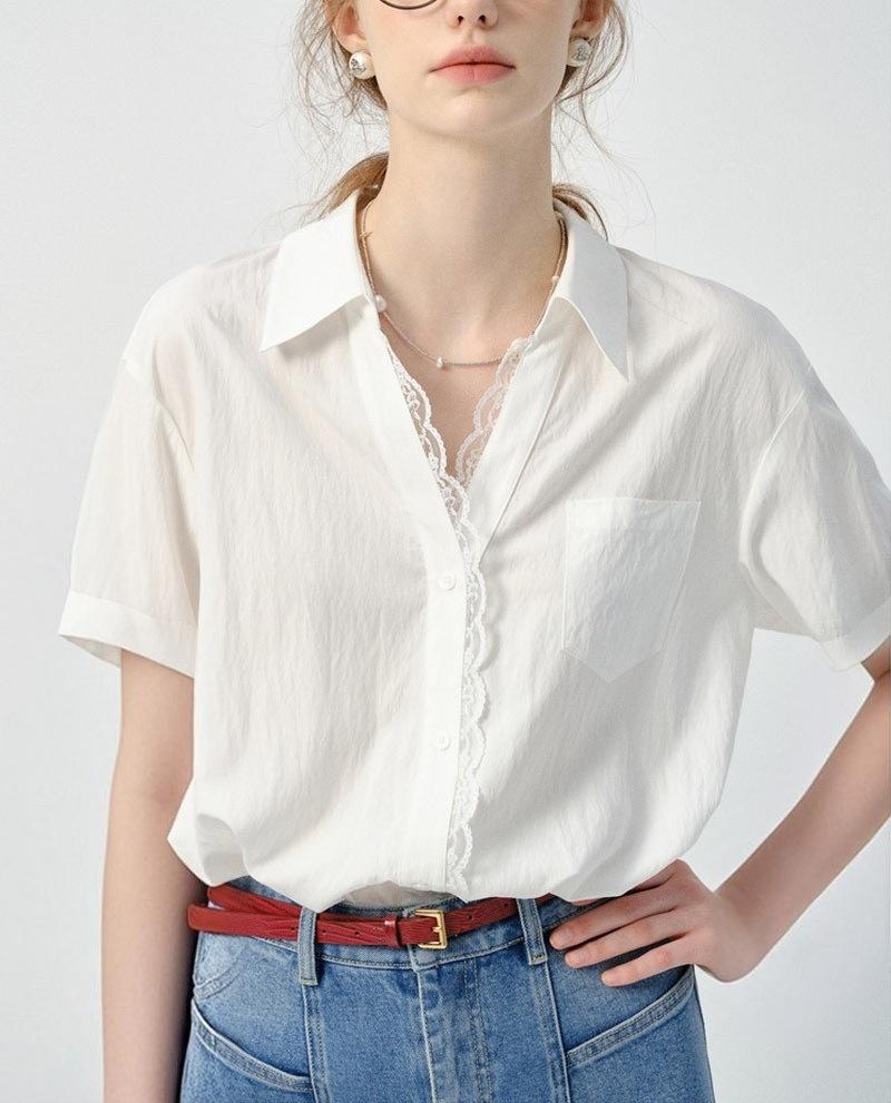 Camisa blanca de manga corta con cuello en V y encaje para mujer, moda de alta gama que rejuvenece, verano 2025