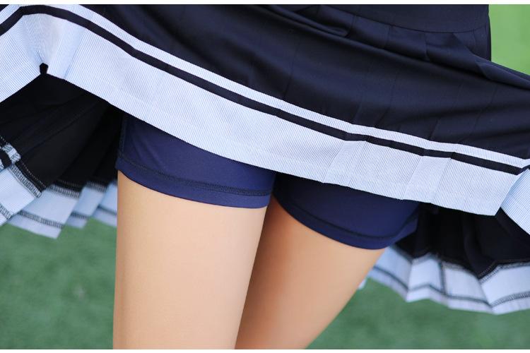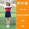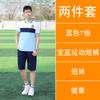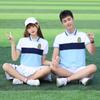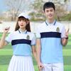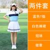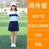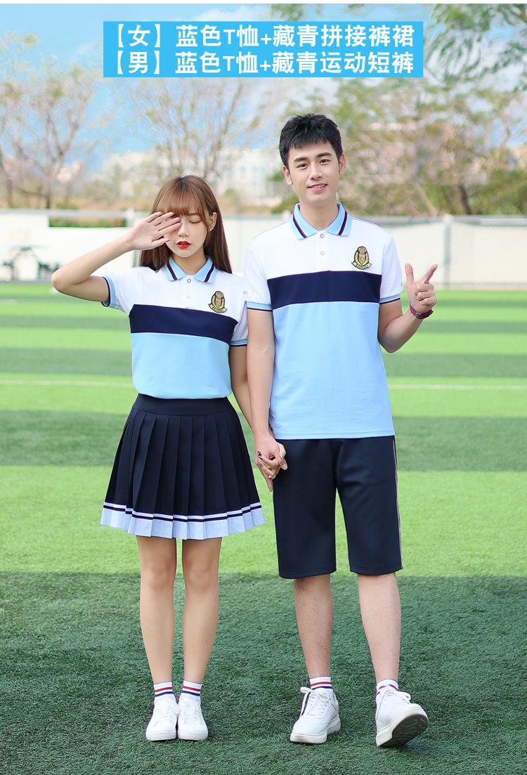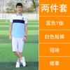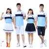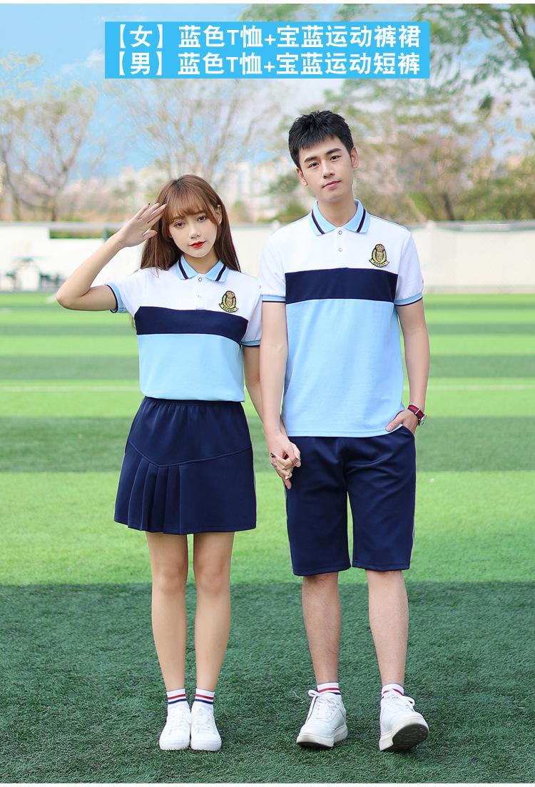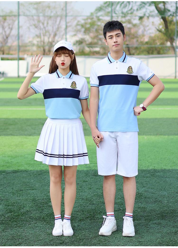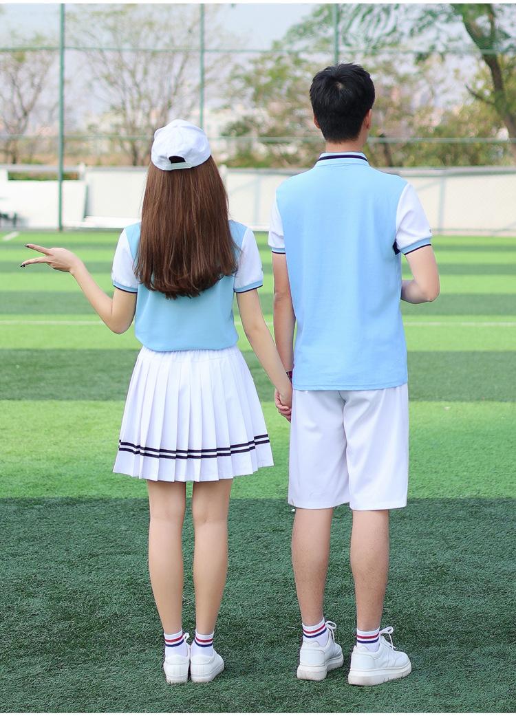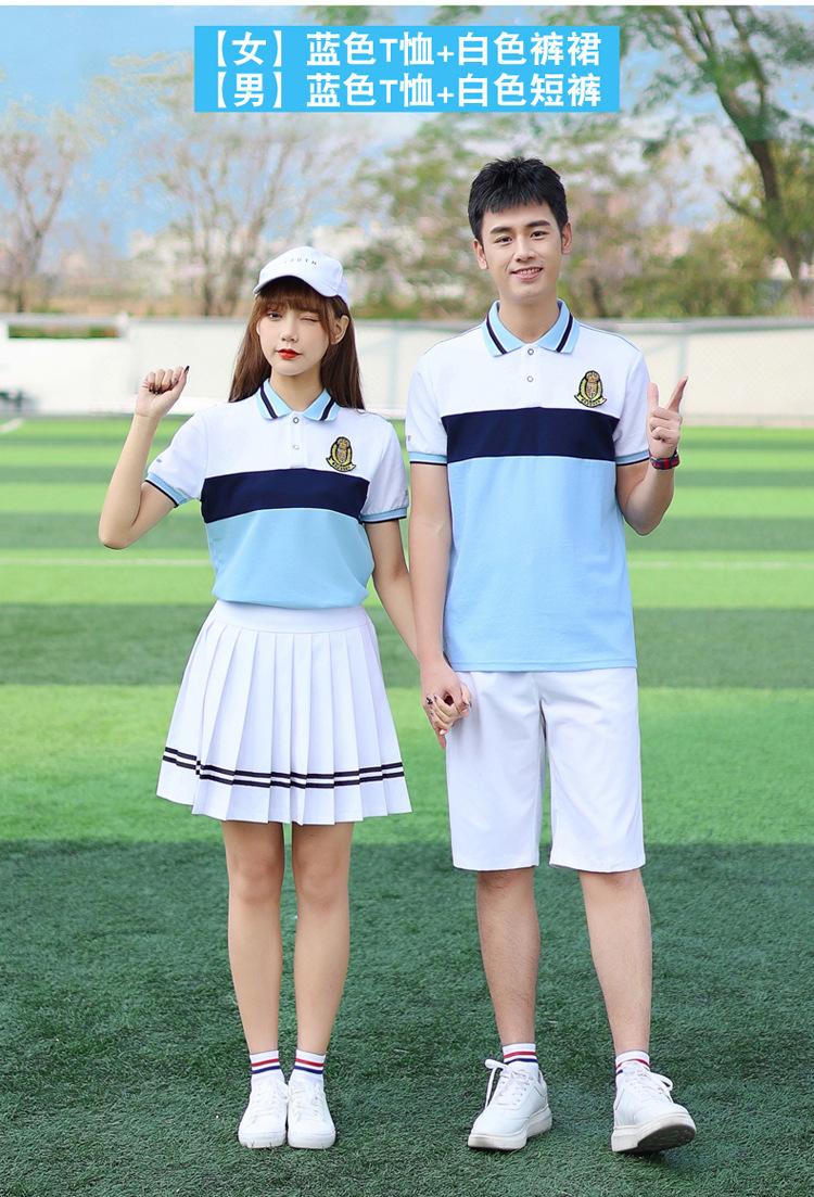 [Male] Blue T-shirt + white shorts, [Female] blue T-shirt + white trouser skirt, [Male] Blue T-shirt + navy sp...