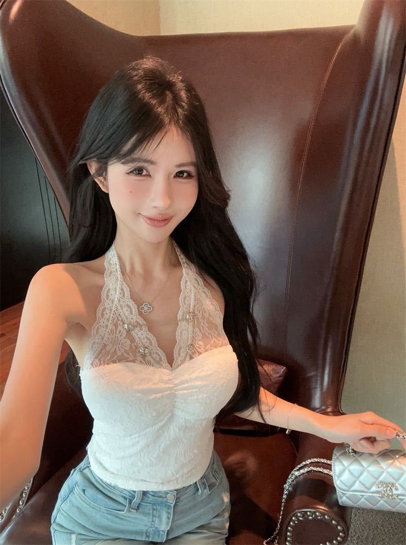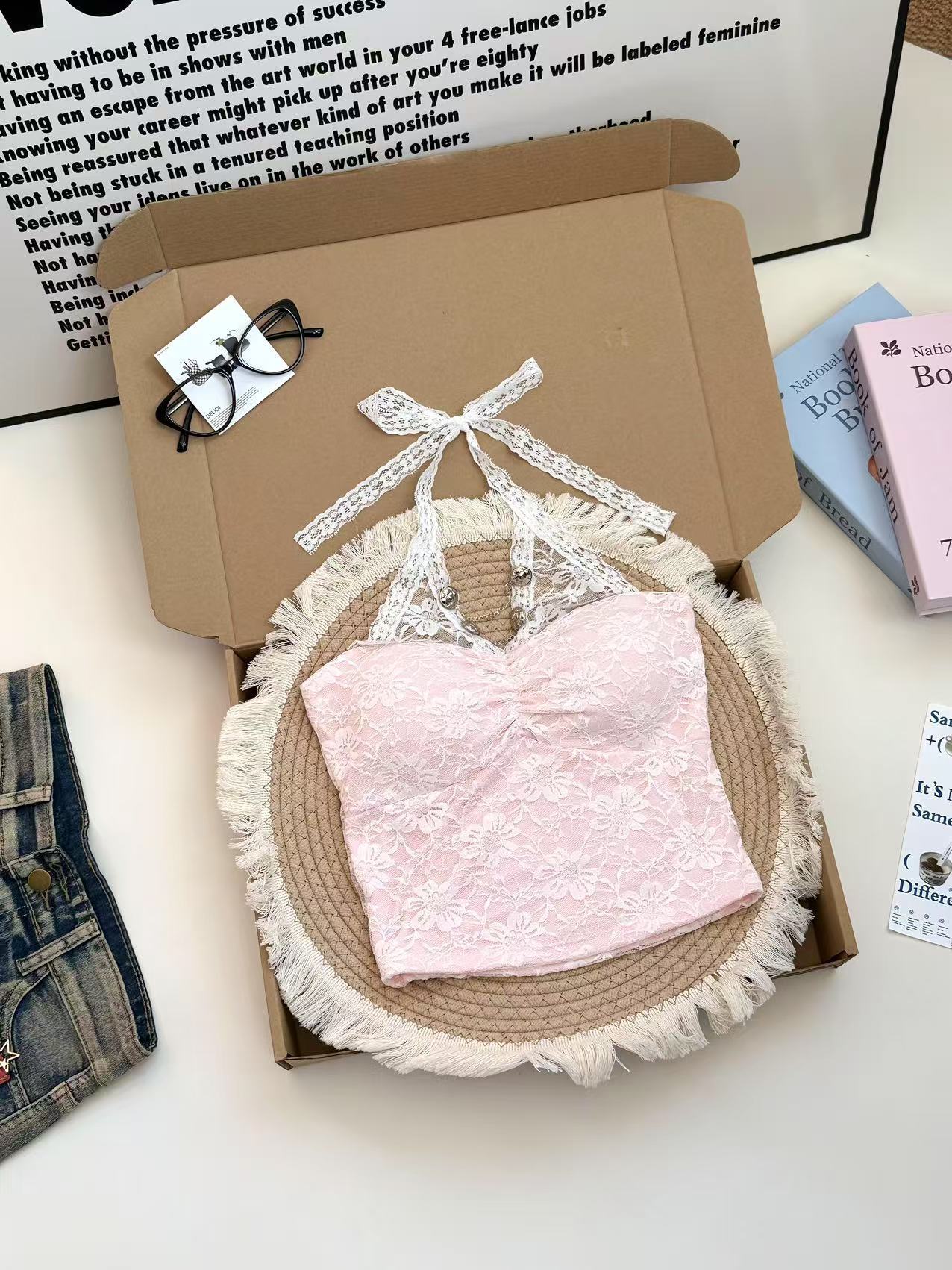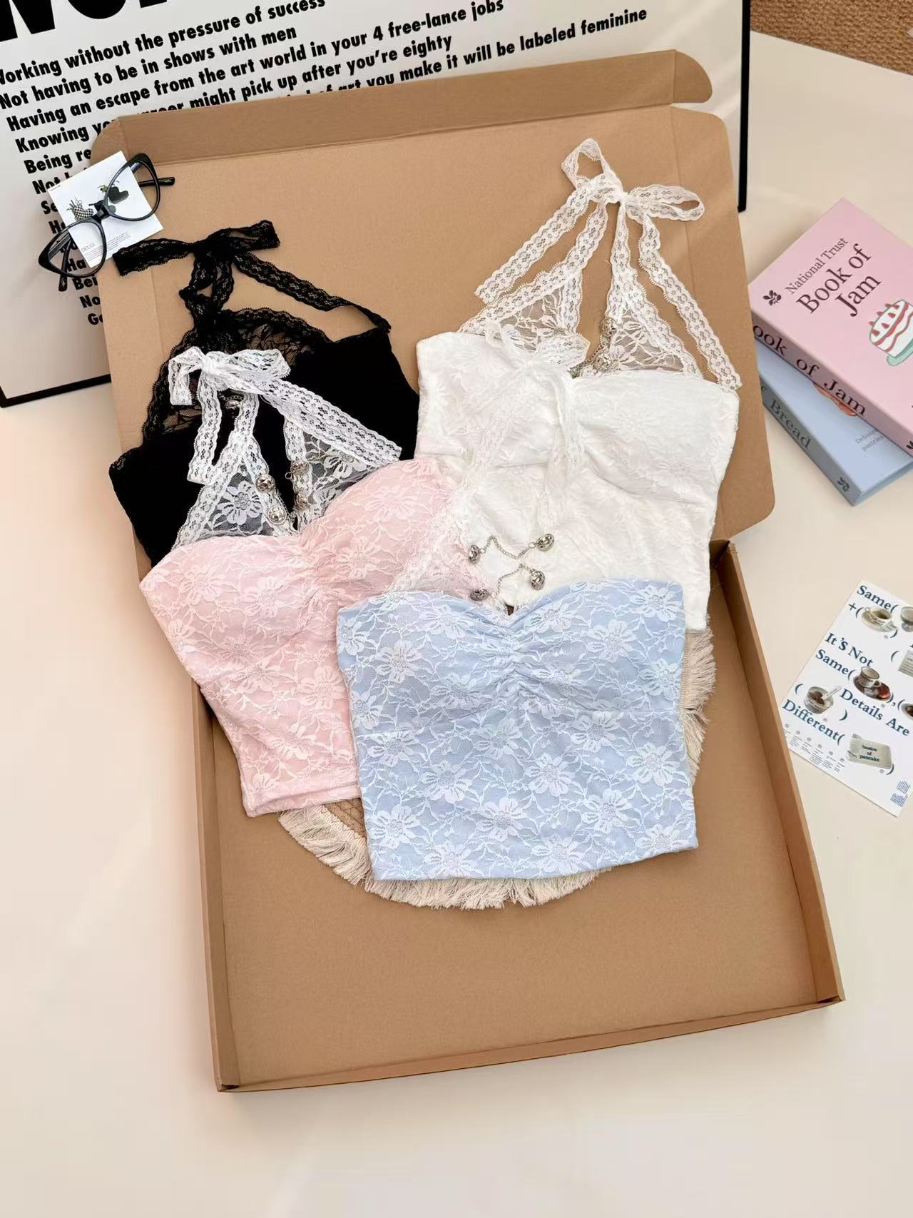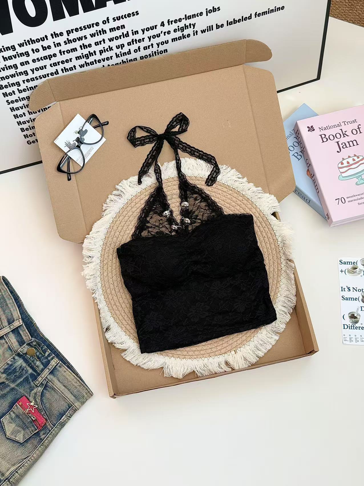 Top Halter de Deseo Puro Cuello en V Corto Sexy Encaje Camisola Tubo para Mujer Dulce Chica Caliente Discoteca