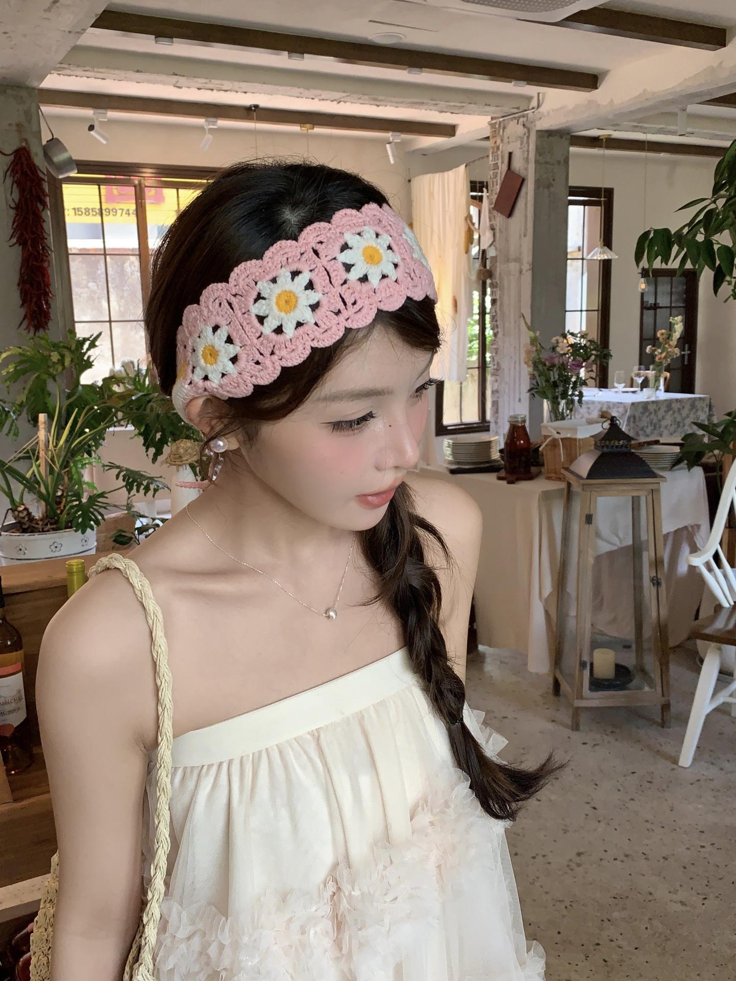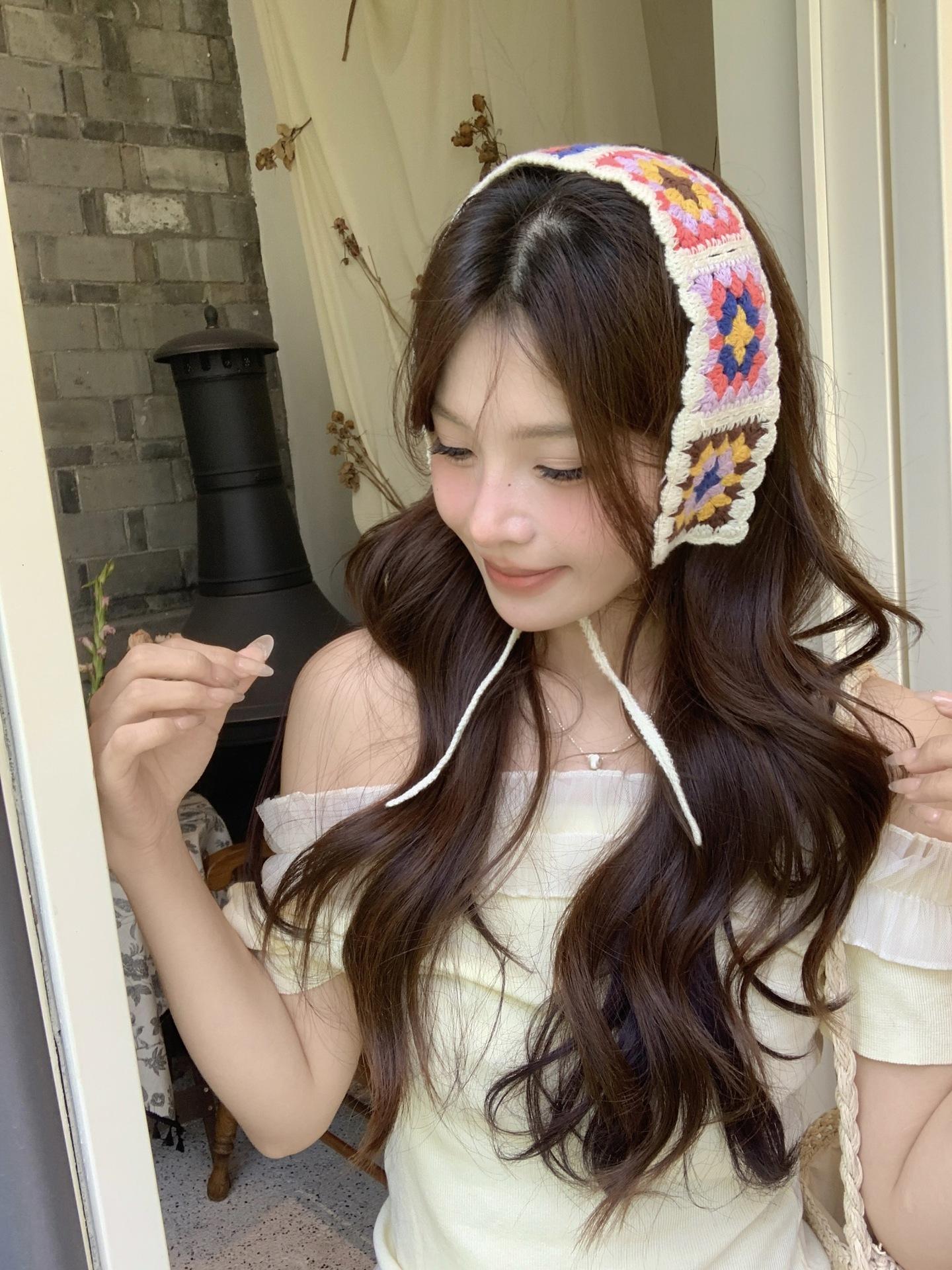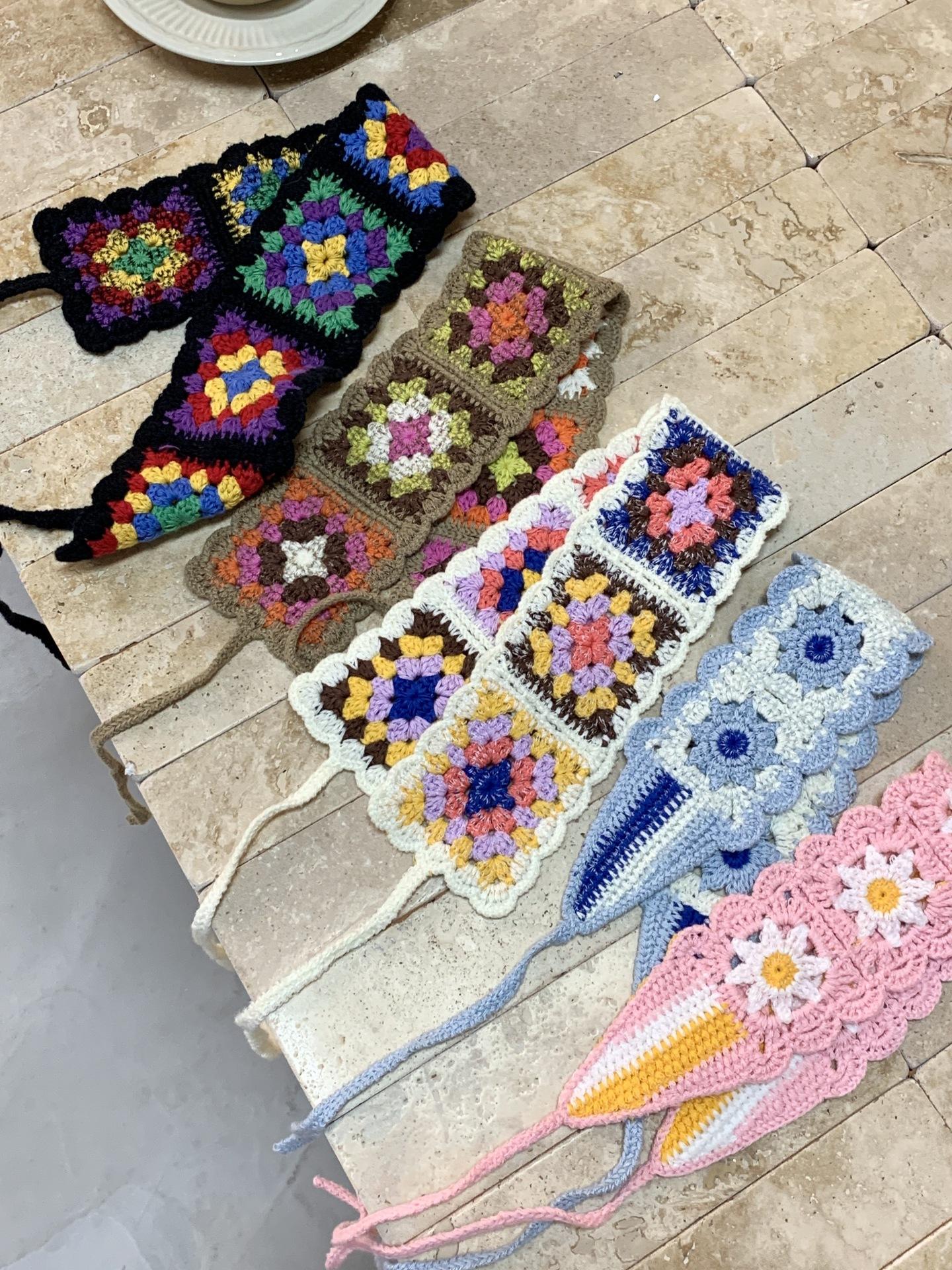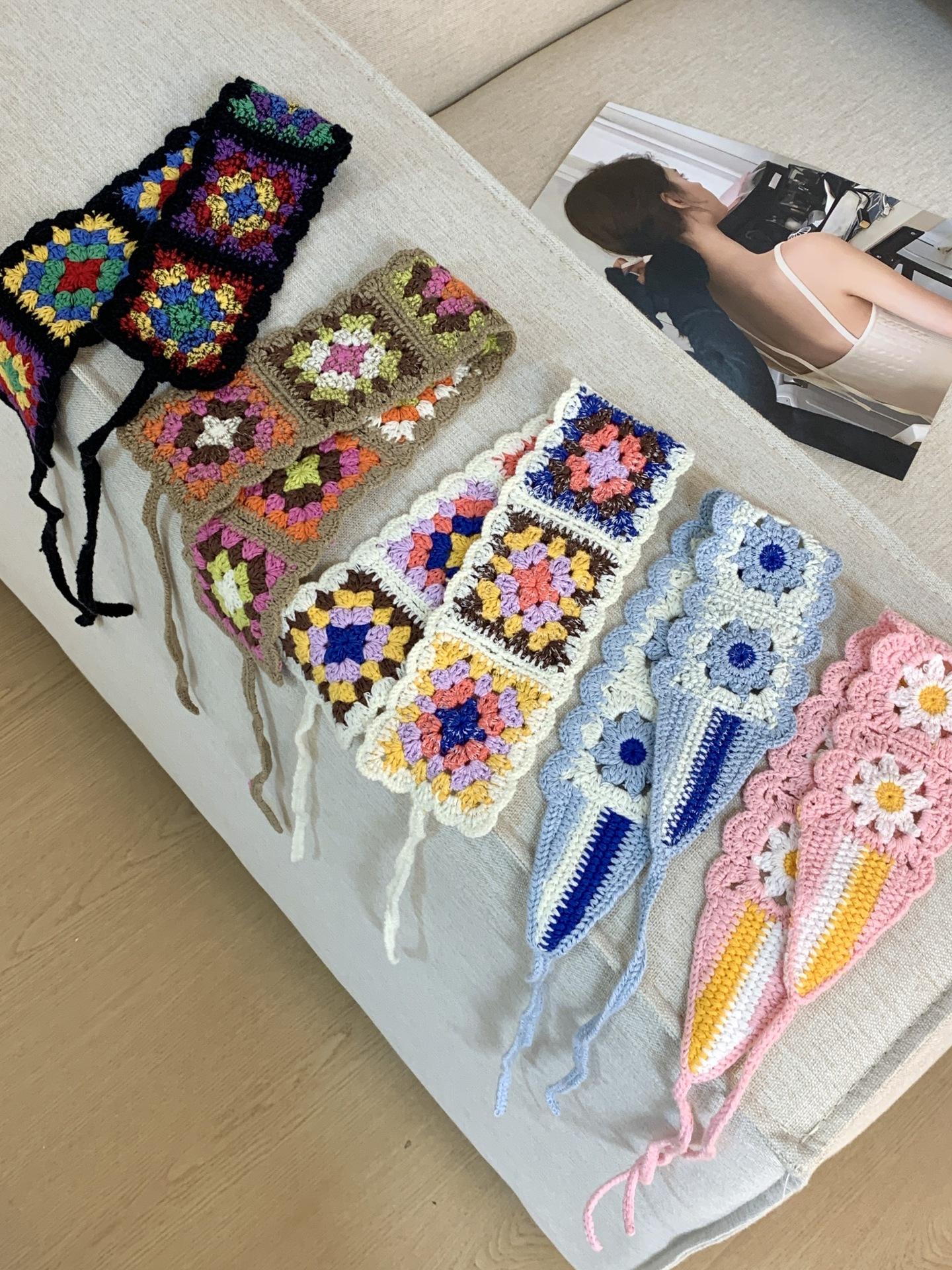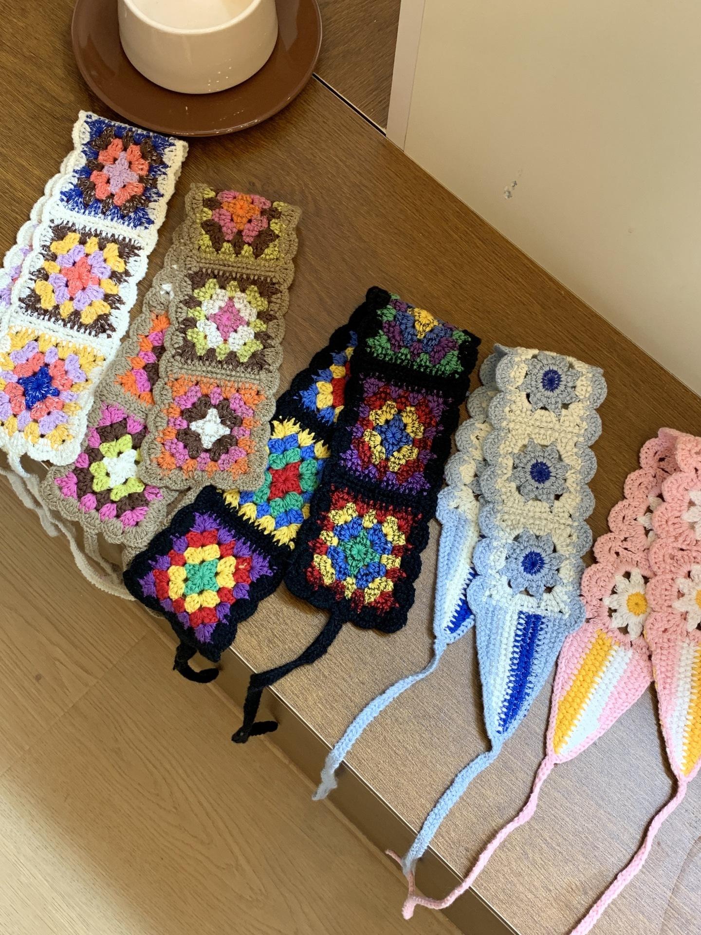 Diadema de Estilo Coreano Retro Hecha a Mano Tejida a Crochet con Flor Calada Estilo Dulce y Lindo Bufanda Triangular Colorida para Mujer Pañuelo para la Cabeza Estilo Literario