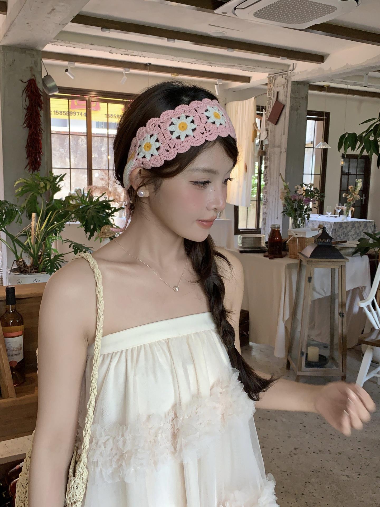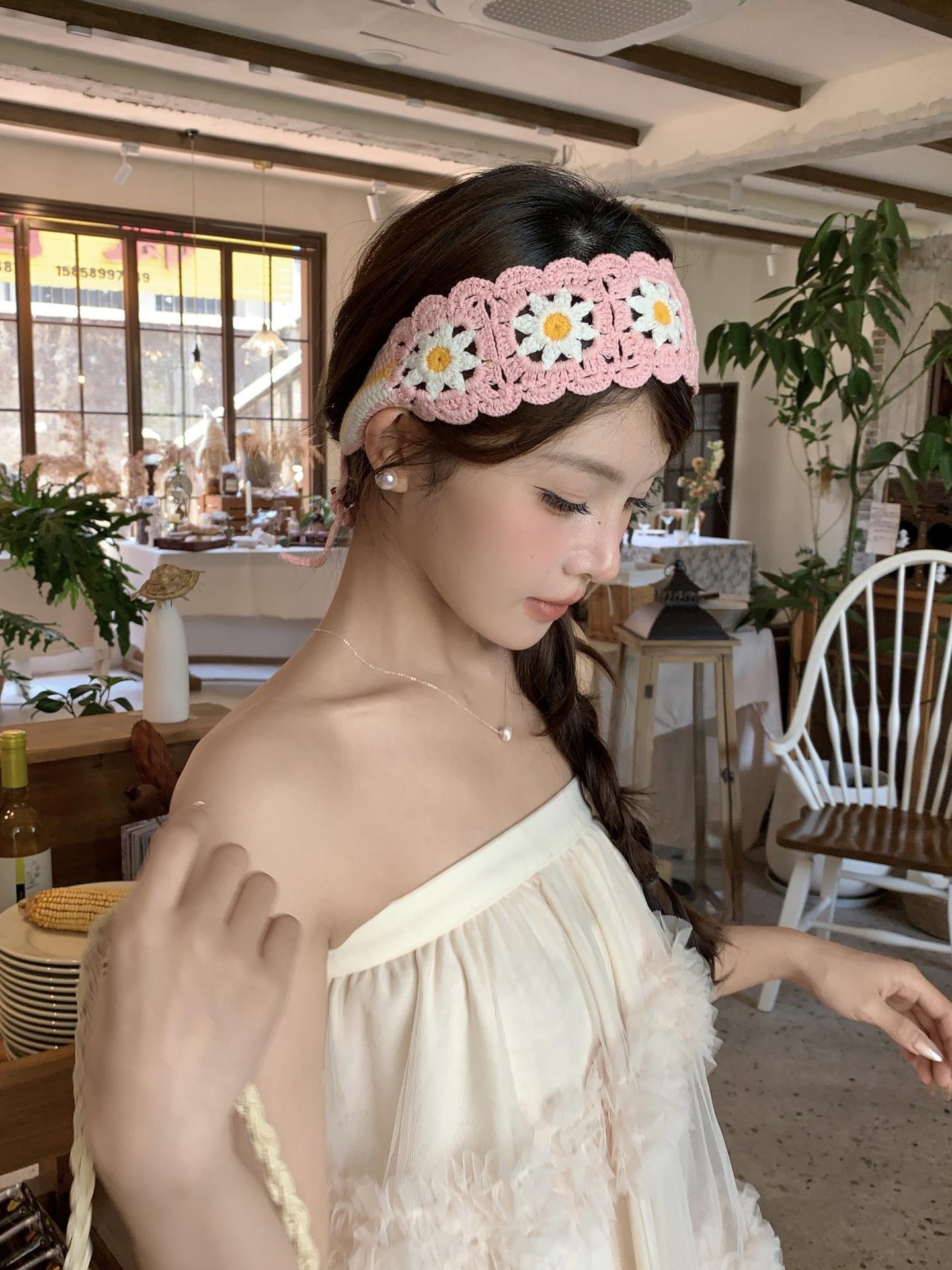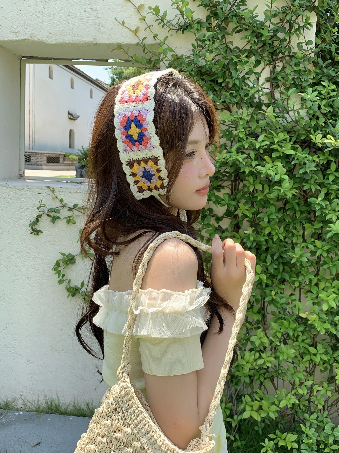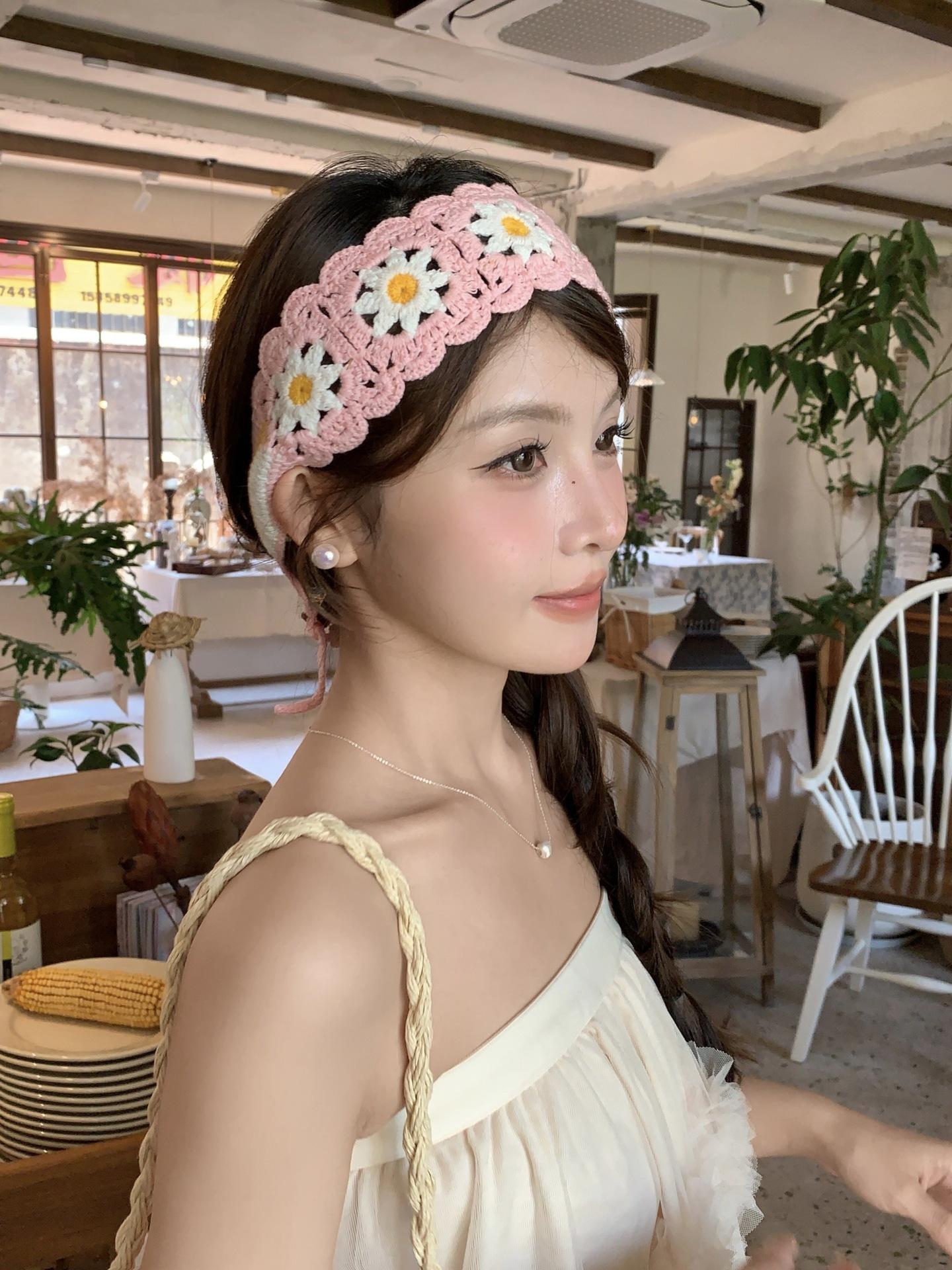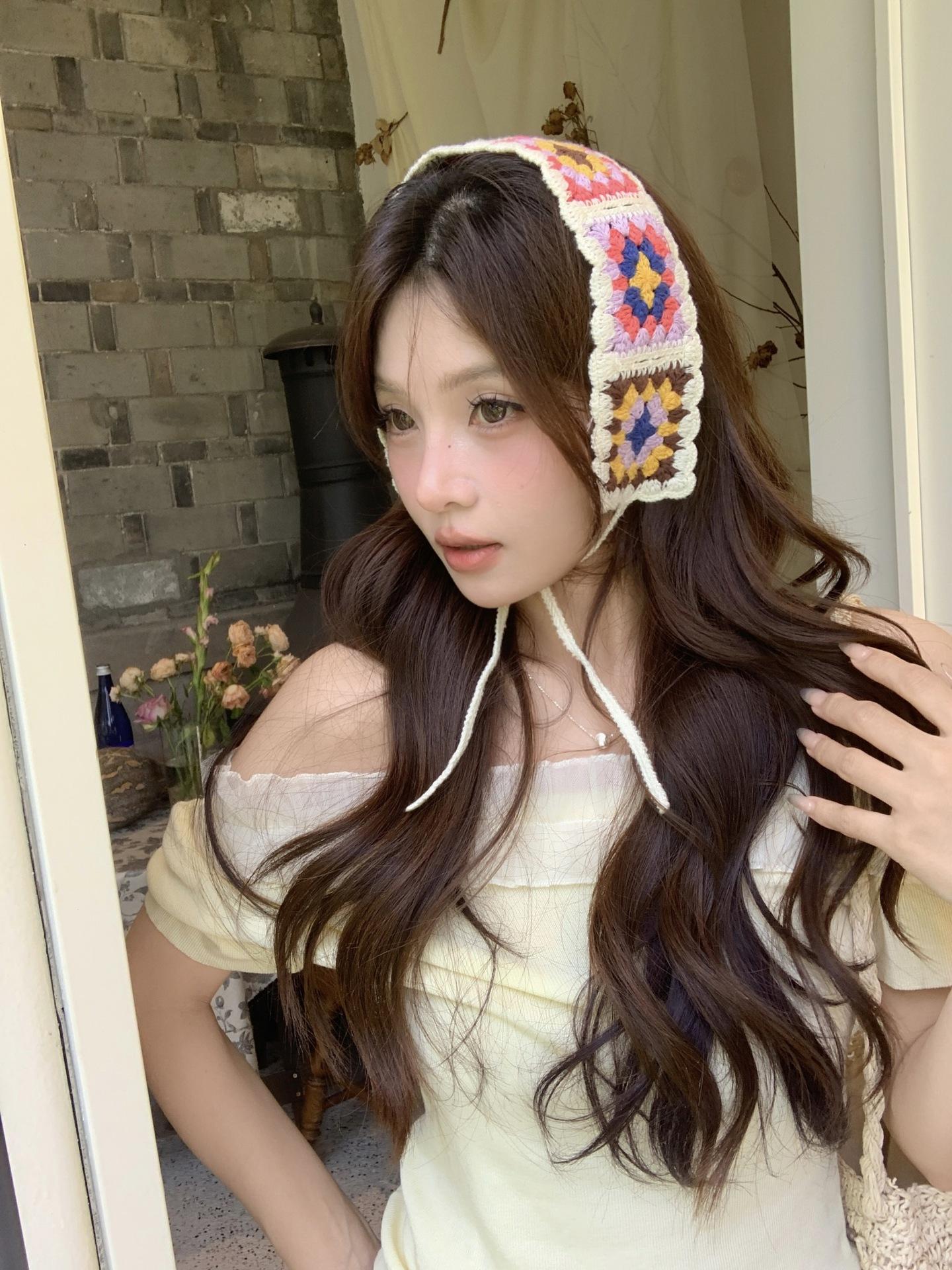 Diadema de Estilo Coreano Retro Hecha a Mano Tejida a Crochet con Flor Calada Estilo Dulce y Lindo Bufanda Triangular Colorida para Mujer Pañuelo para la Cabeza Estilo Literario