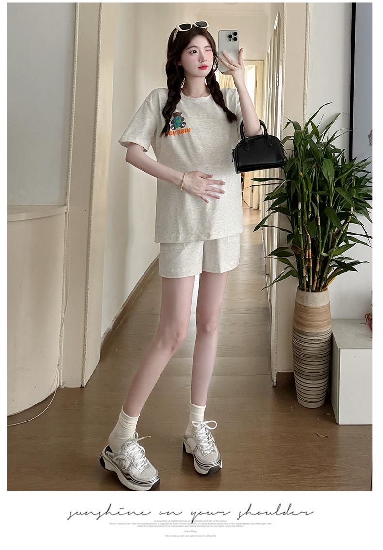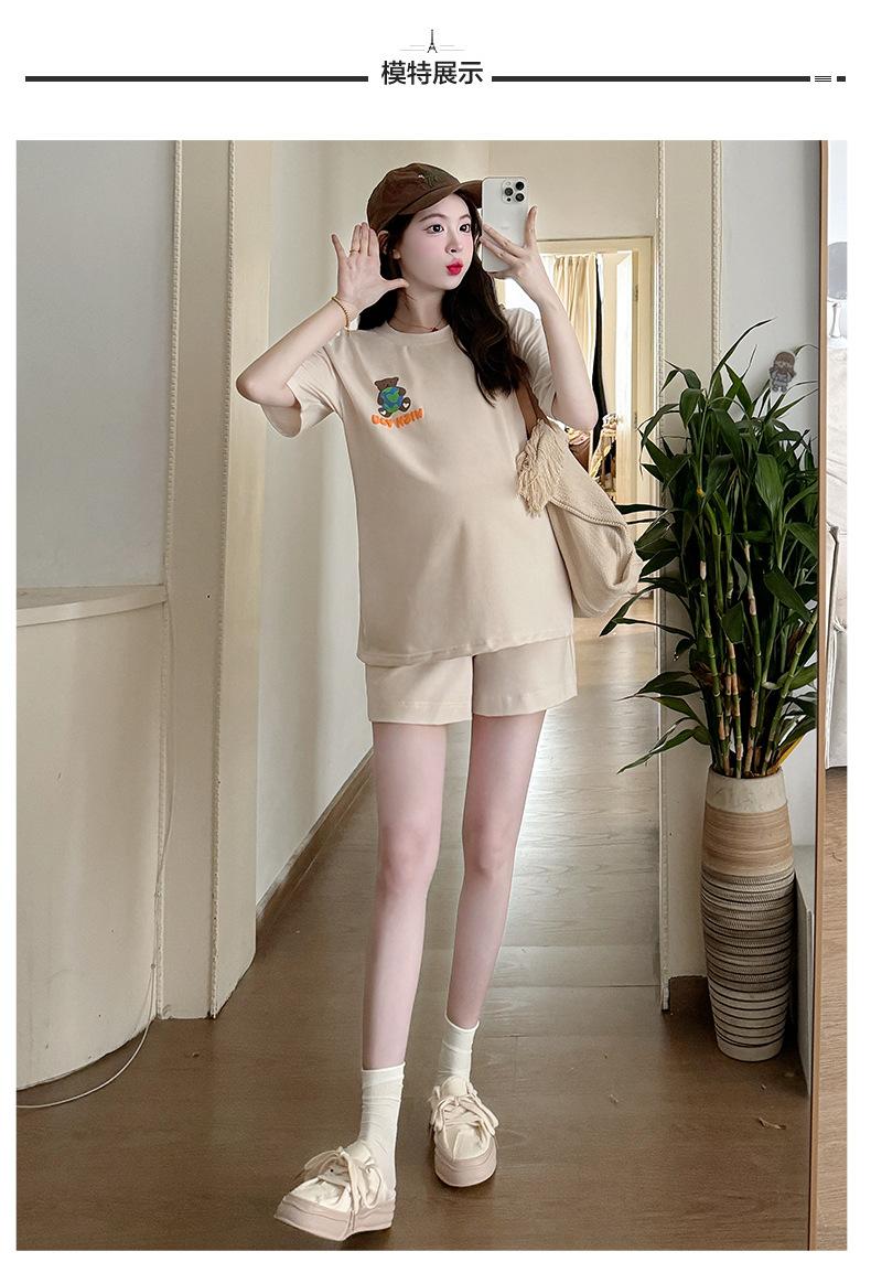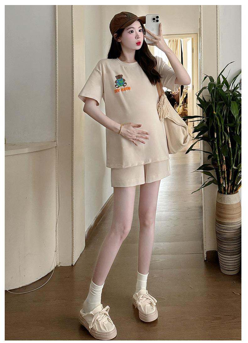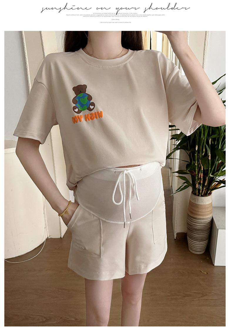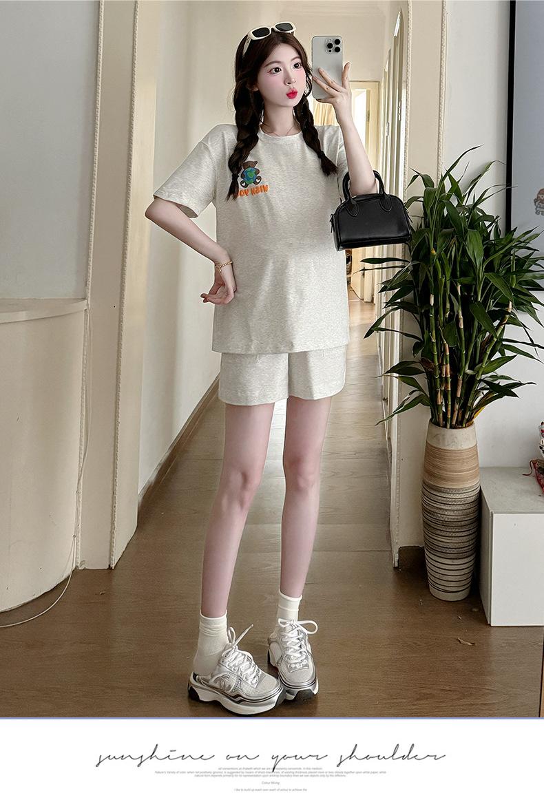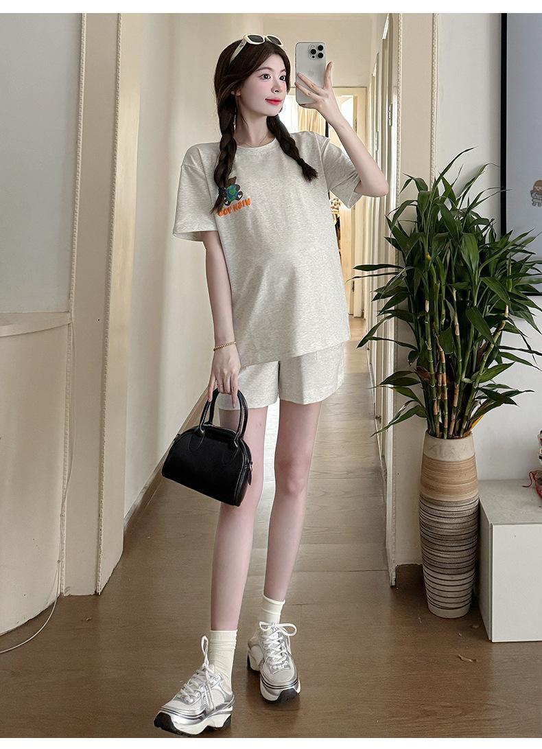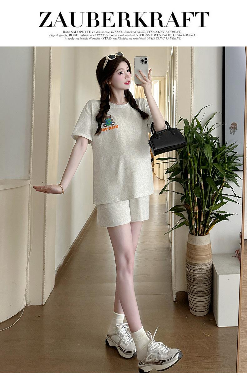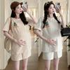 Traje de Mujer Embarazada 2025 Verano Nuevo Camiseta Suelta con Estampado de Letras Pantalones Cortos con Cordón Ajustable en el Vientre Conjunto de Dos Piezas