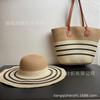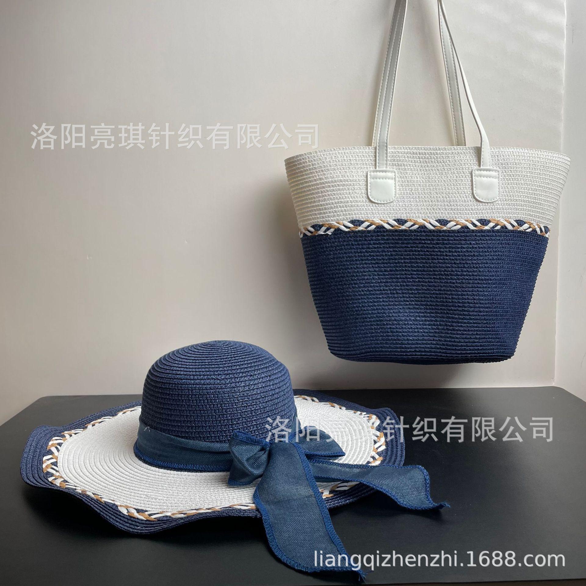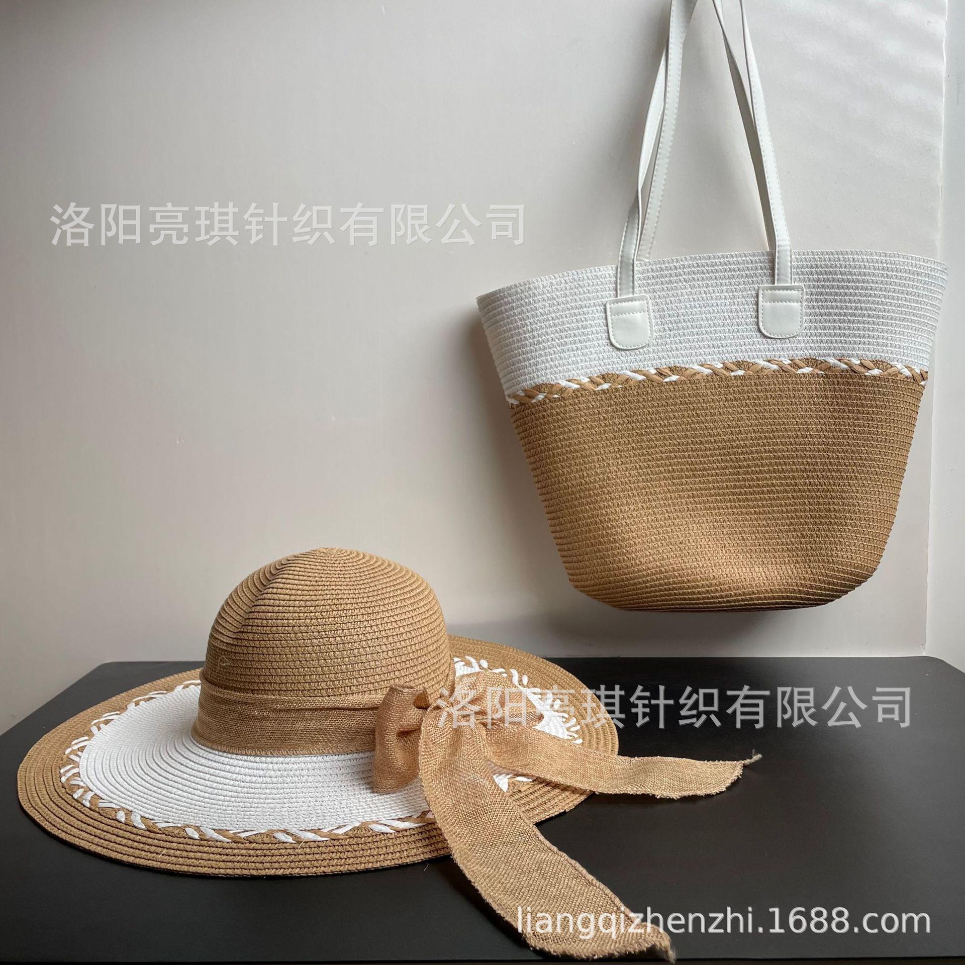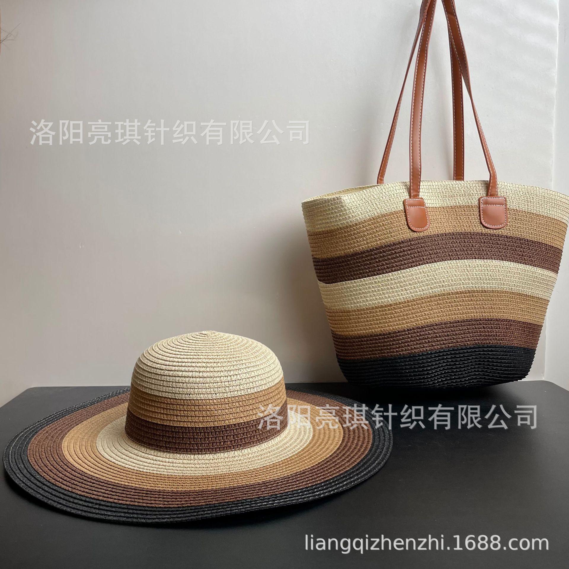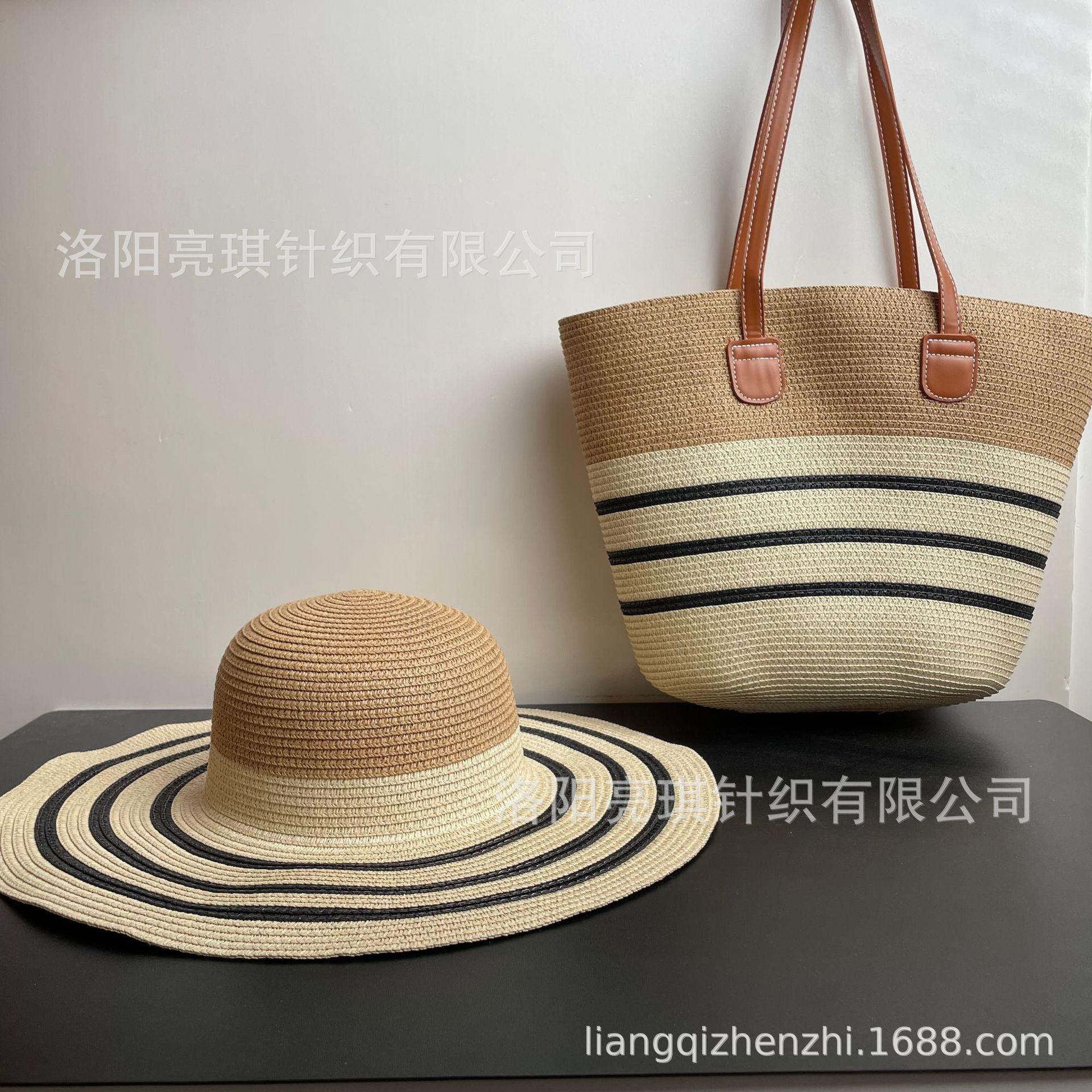 Sombrero de Paja de Ala Ancha para Mujer Viaje Verano Tejido Cúpula Bolso Tipo Cubo Versátil Viaje Playa Mar Conjunto de Sombrero
