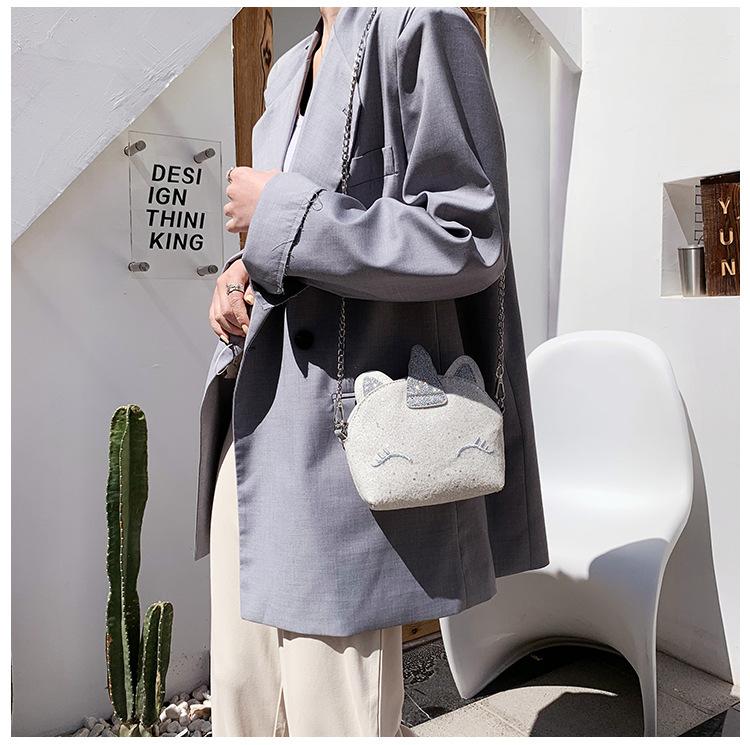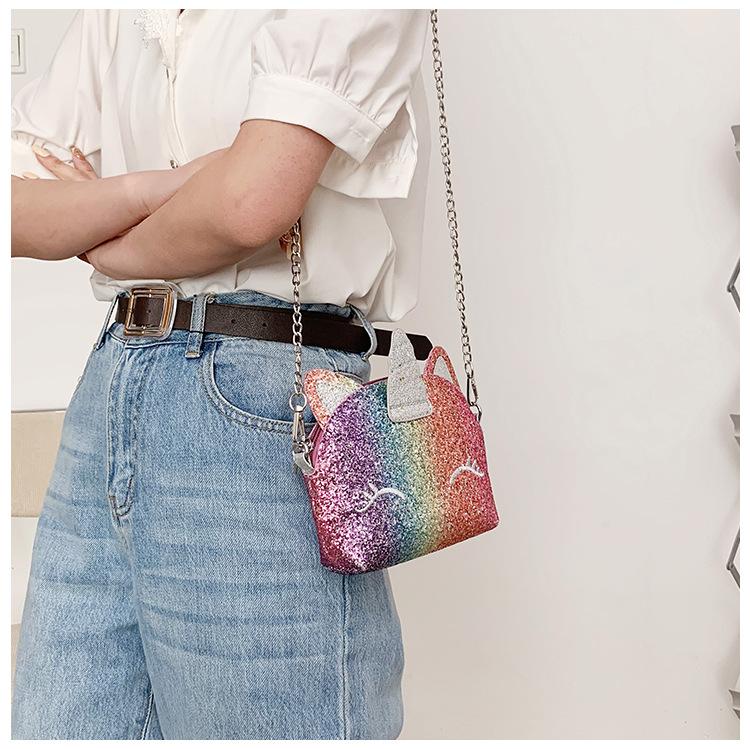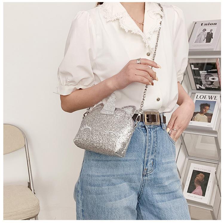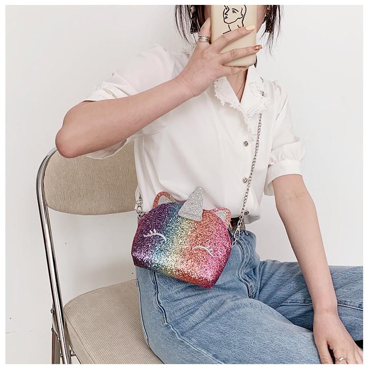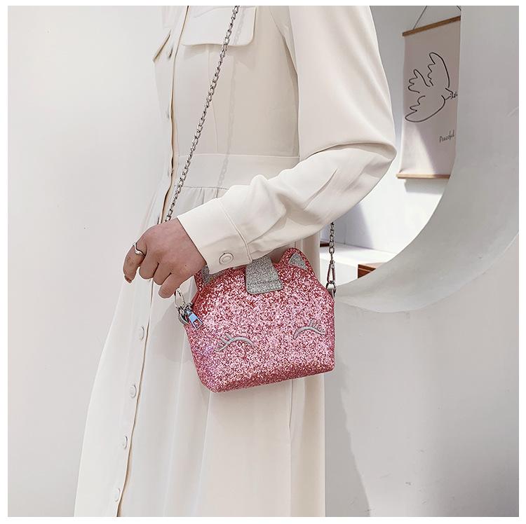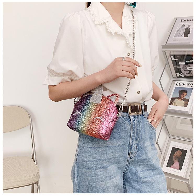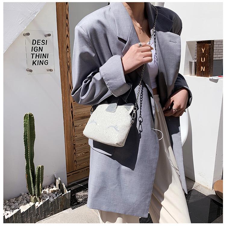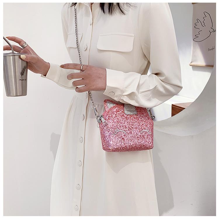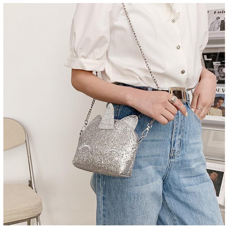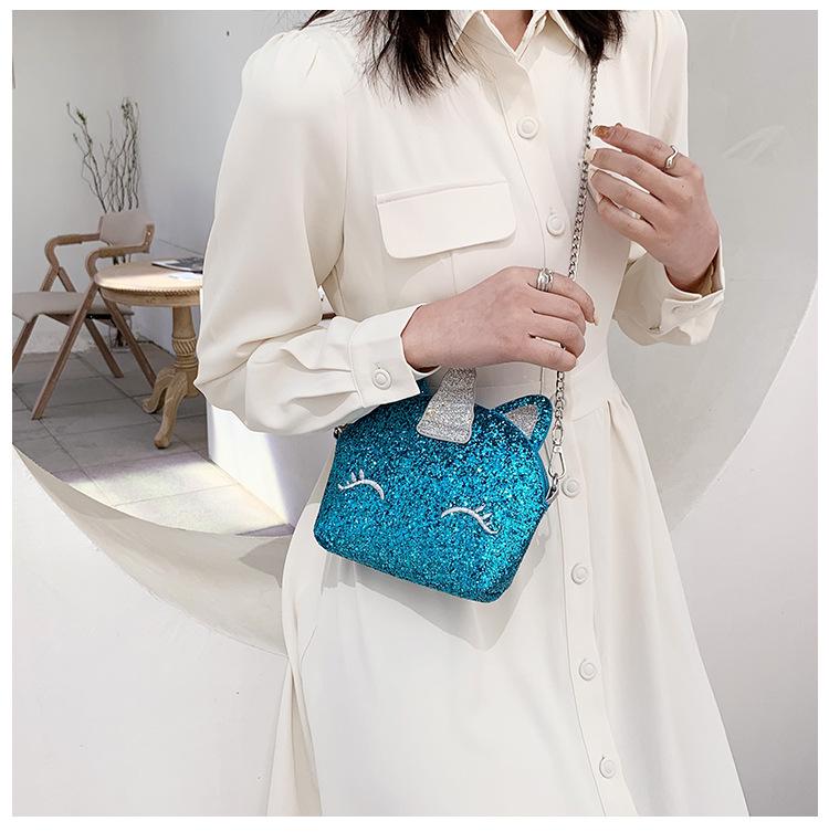 Bolso bandolera de cadena de PU de moda europea y americana personalizado, lindo, divertido, con personalidad, lentejuelas láser, gato bordado, bolso de mujer