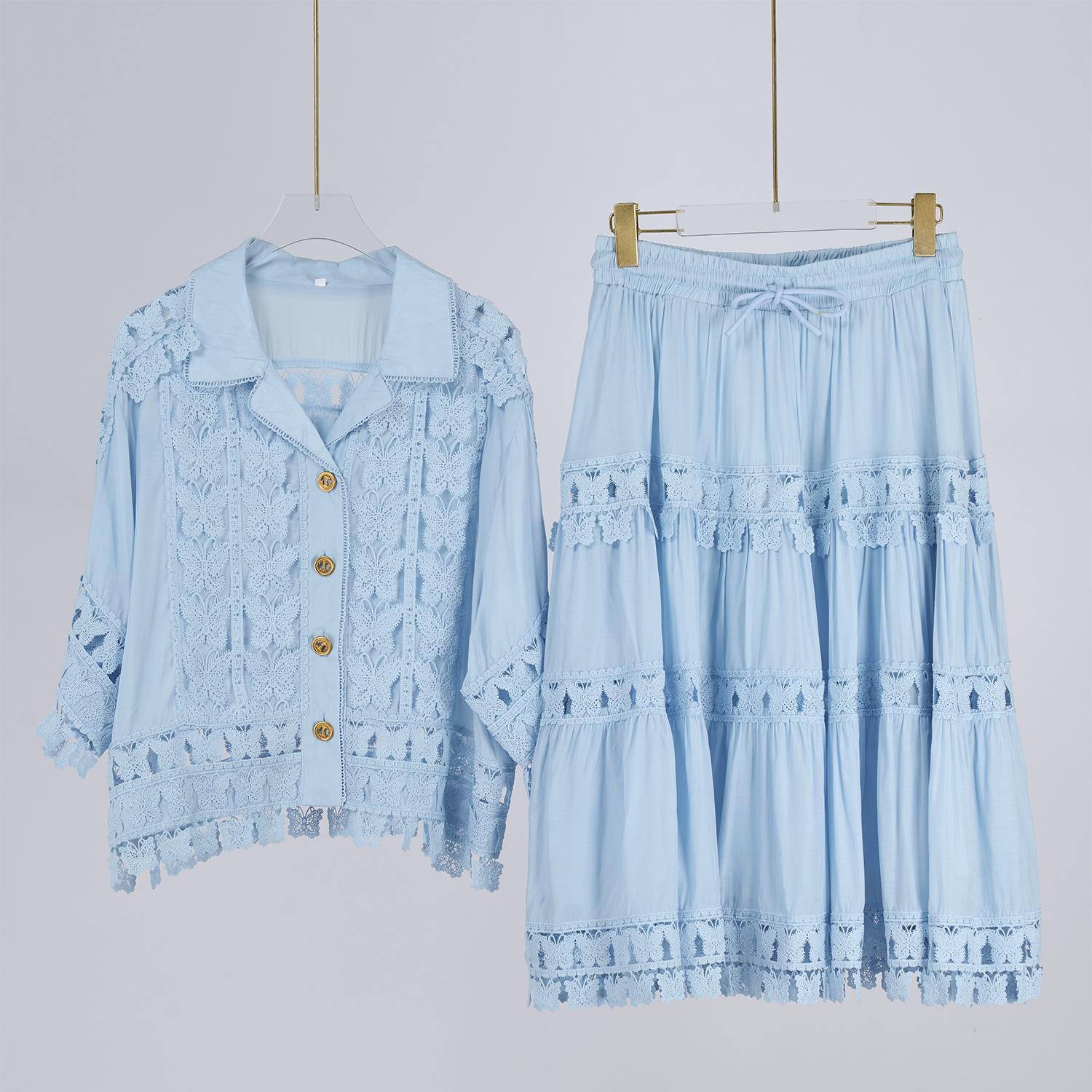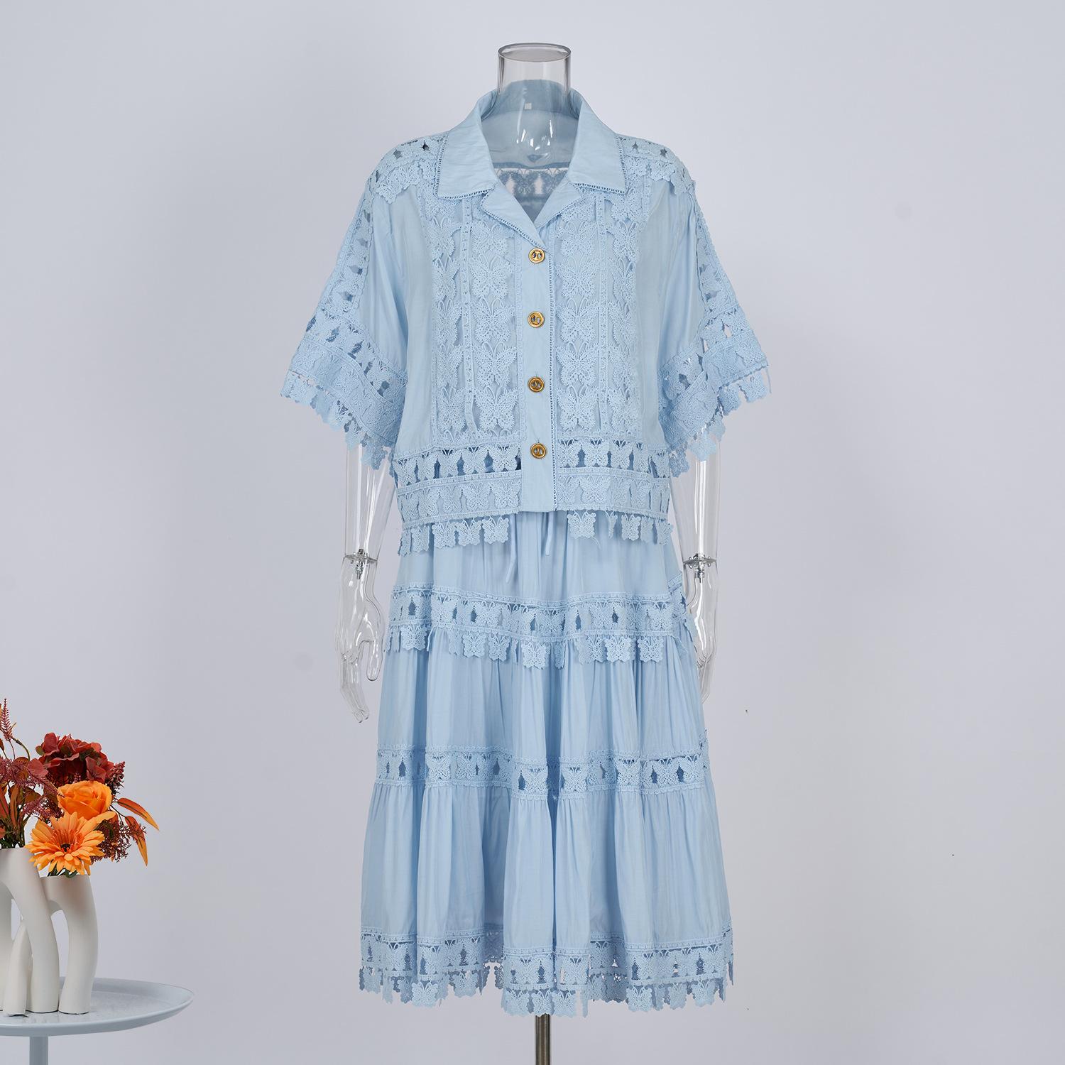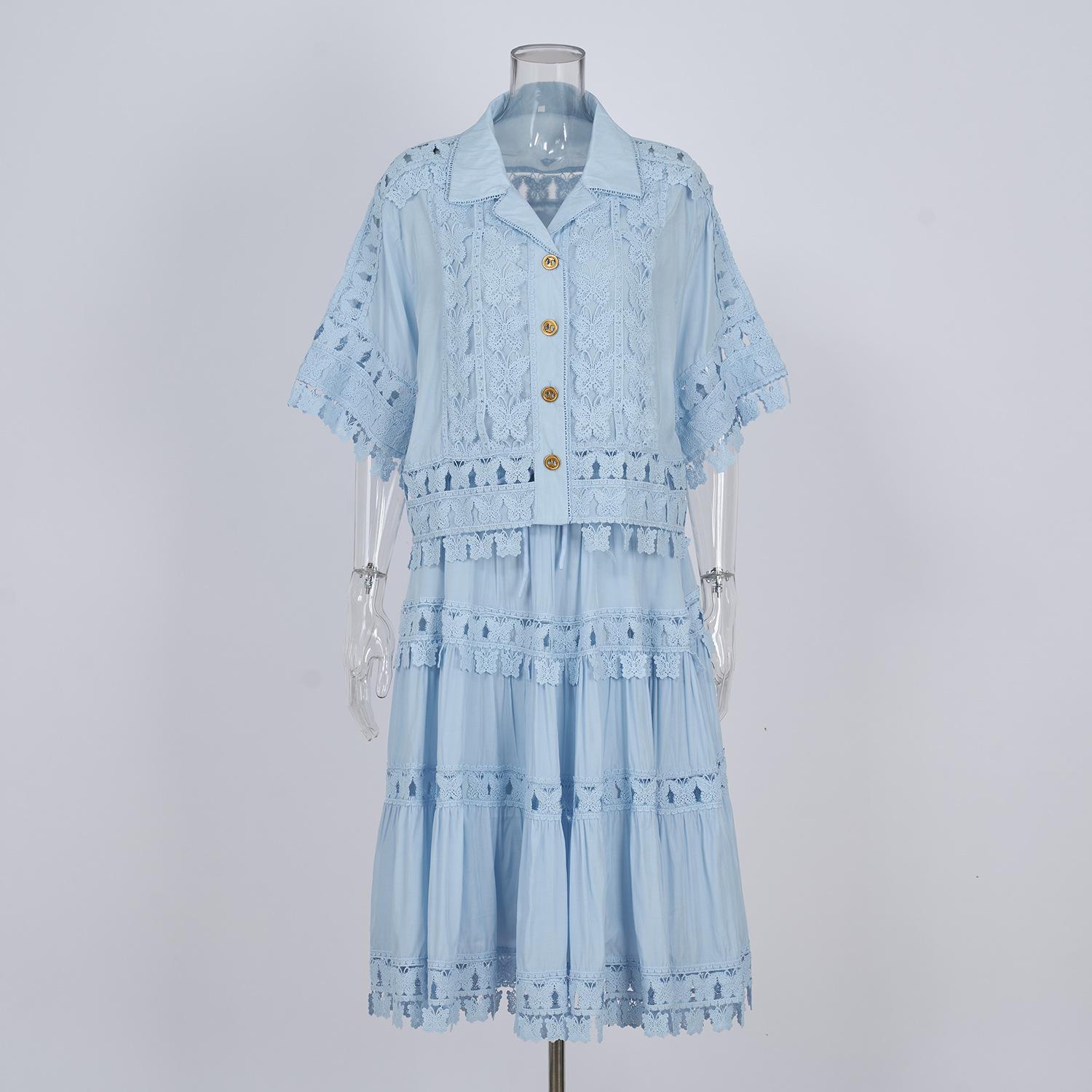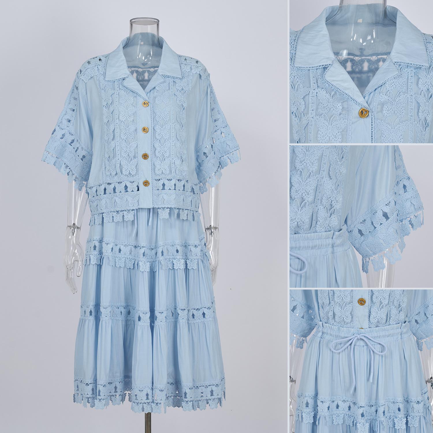 Nuevo Set de Estilo Retro de Corte Transfronterizo para Comercio Exterior Solapa Bordado Encaje Camisa Corta + Set Falda Midi Vestido zimmermann