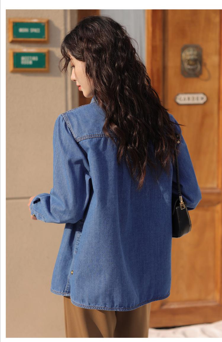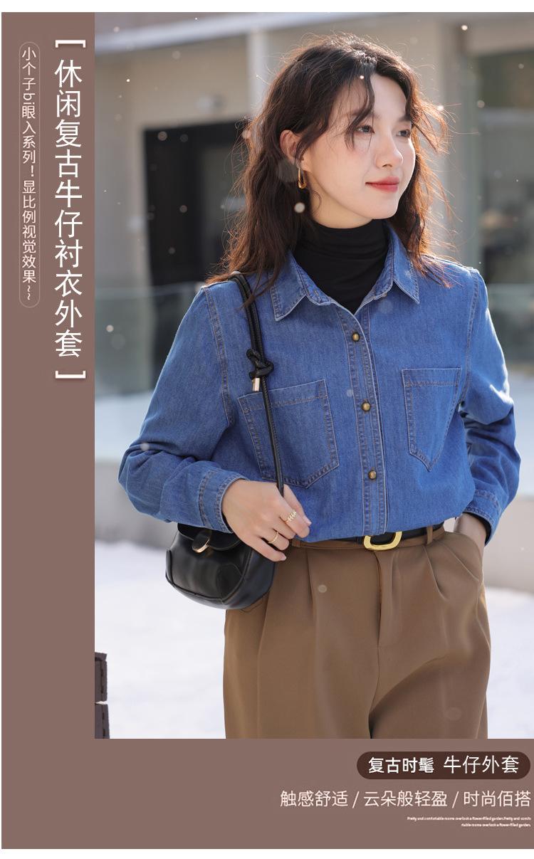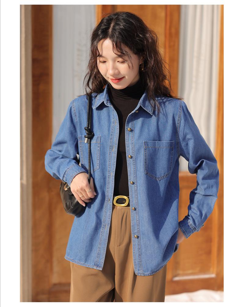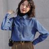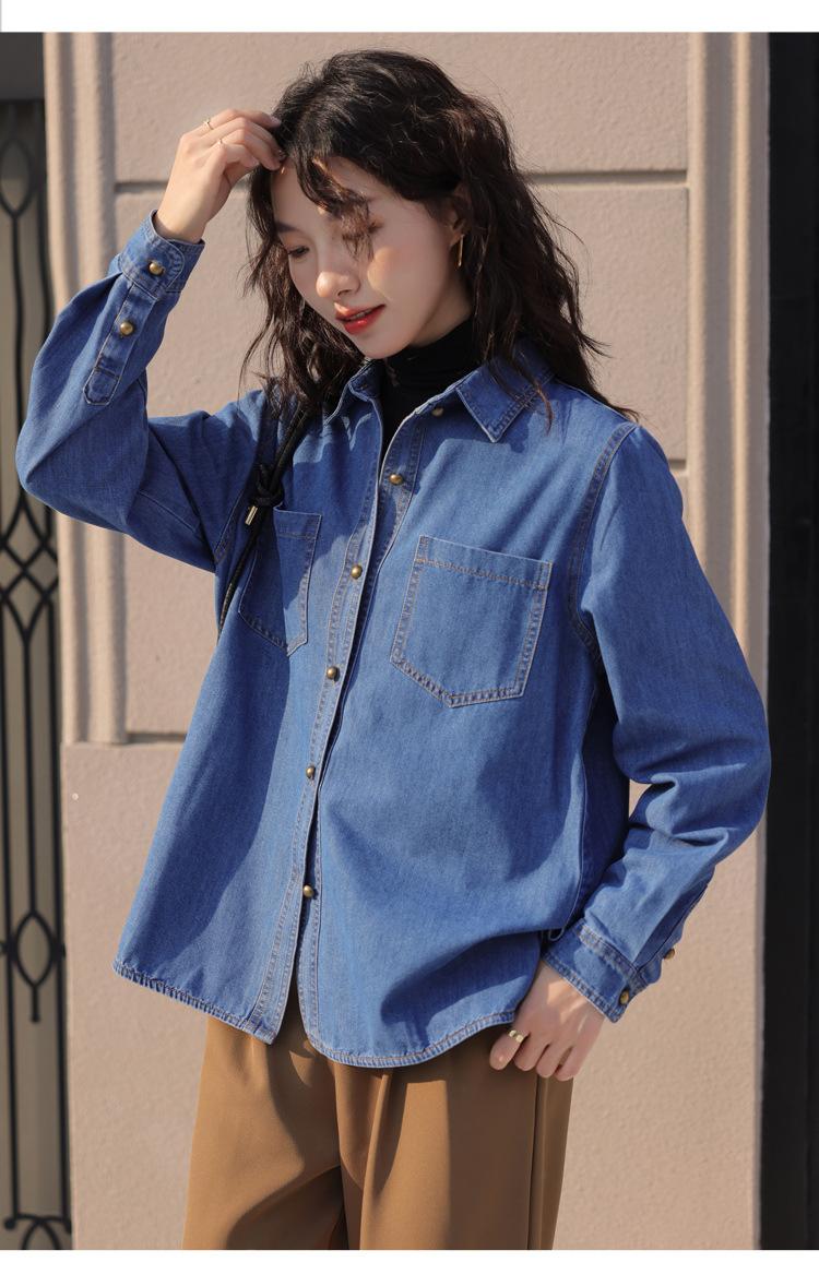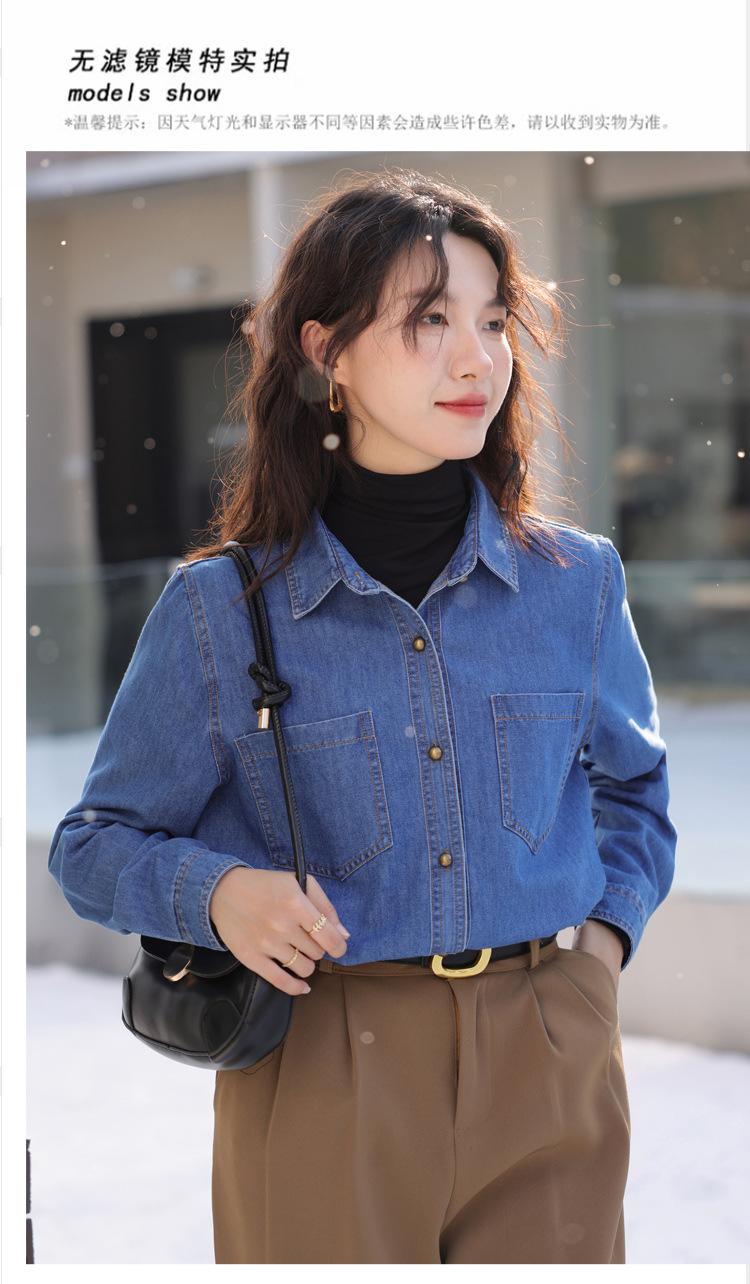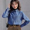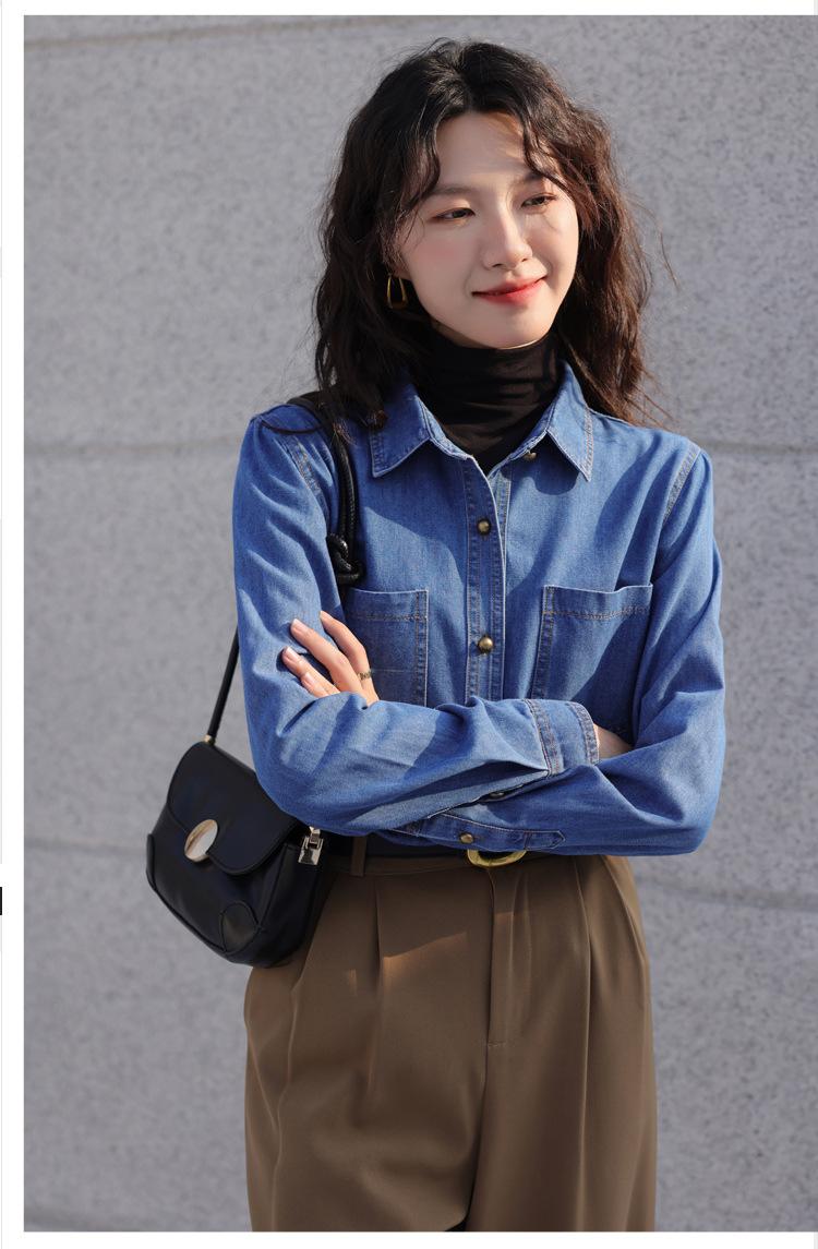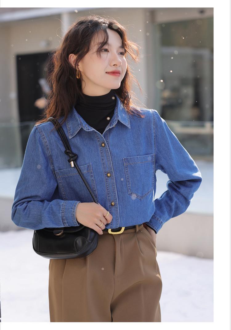Foto Real de Camisa de Mezclilla Azul Retro Estilo Hong Kong de Hombro Derecho para Mujer para Usar en Capas 2025 Nuevo Top Suave para Personas Pequeñas