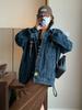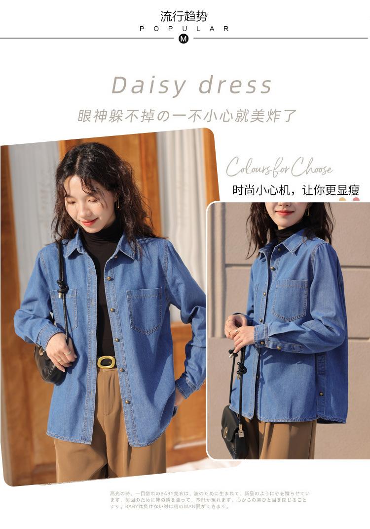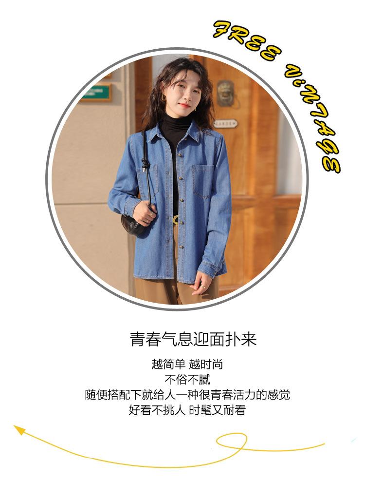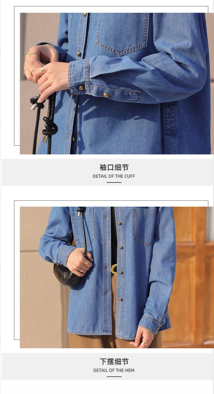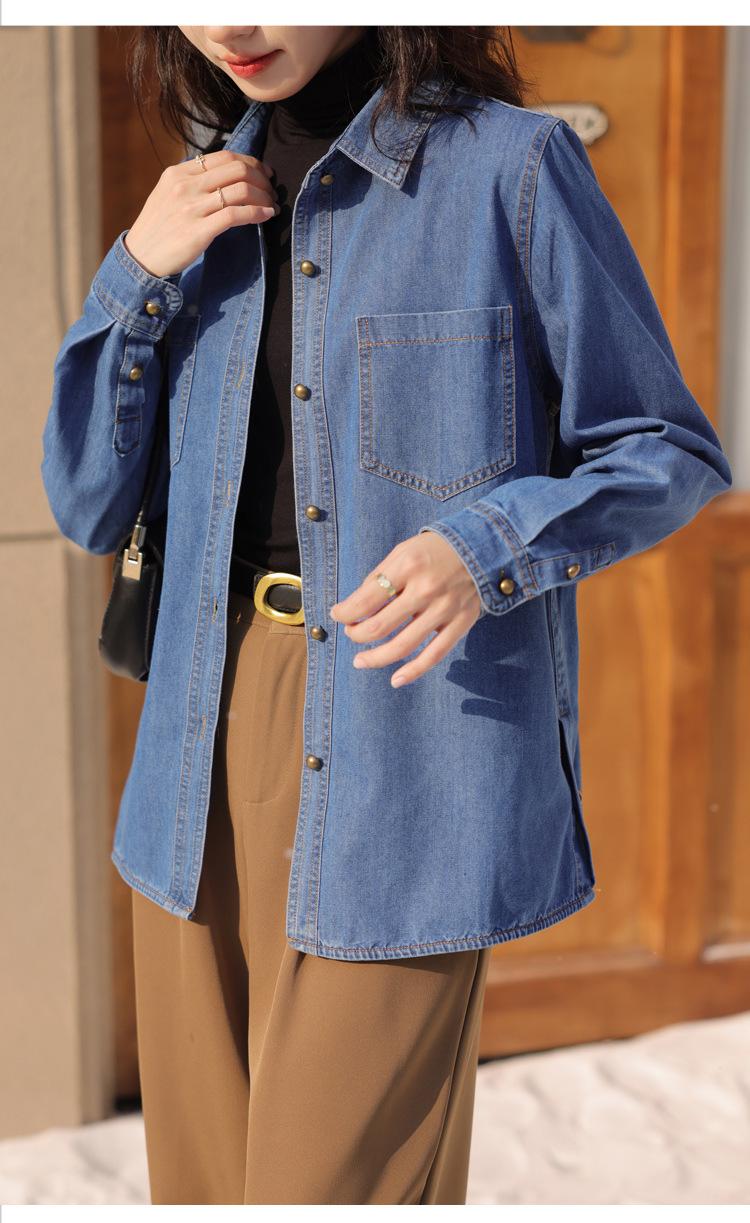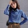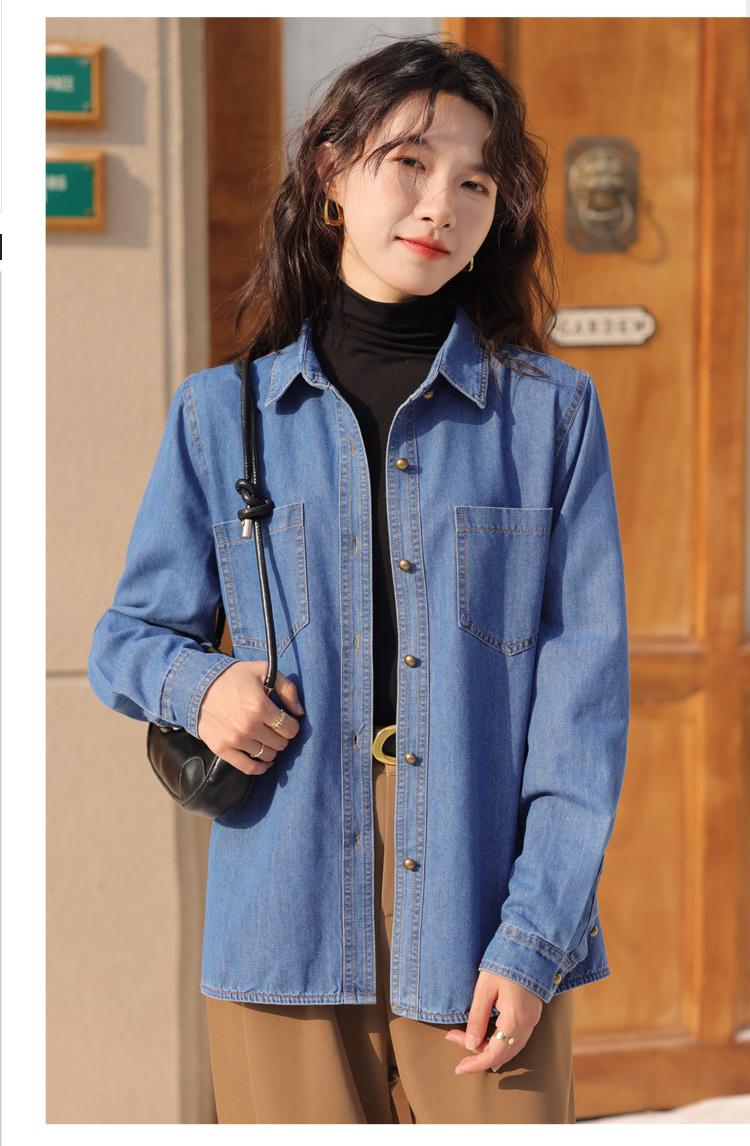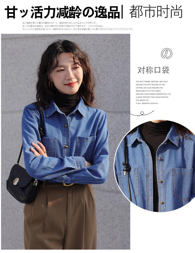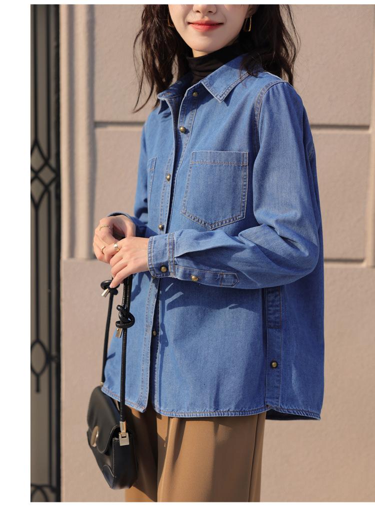 Foto Real de Camisa de Mezclilla Azul Retro Estilo Hong Kong de Hombro Derecho para Mujer para Usar en Capas 2025 Nuevo Top Suave para Personas Pequeñas