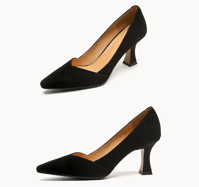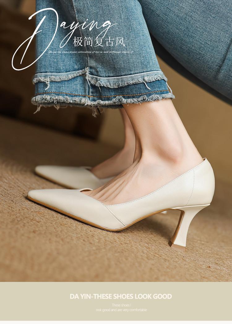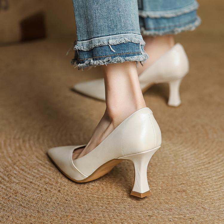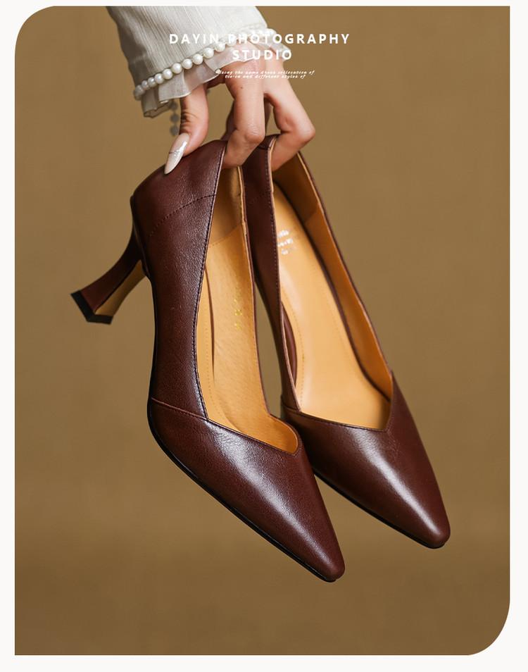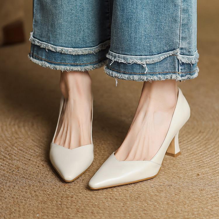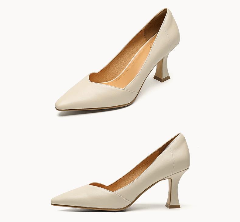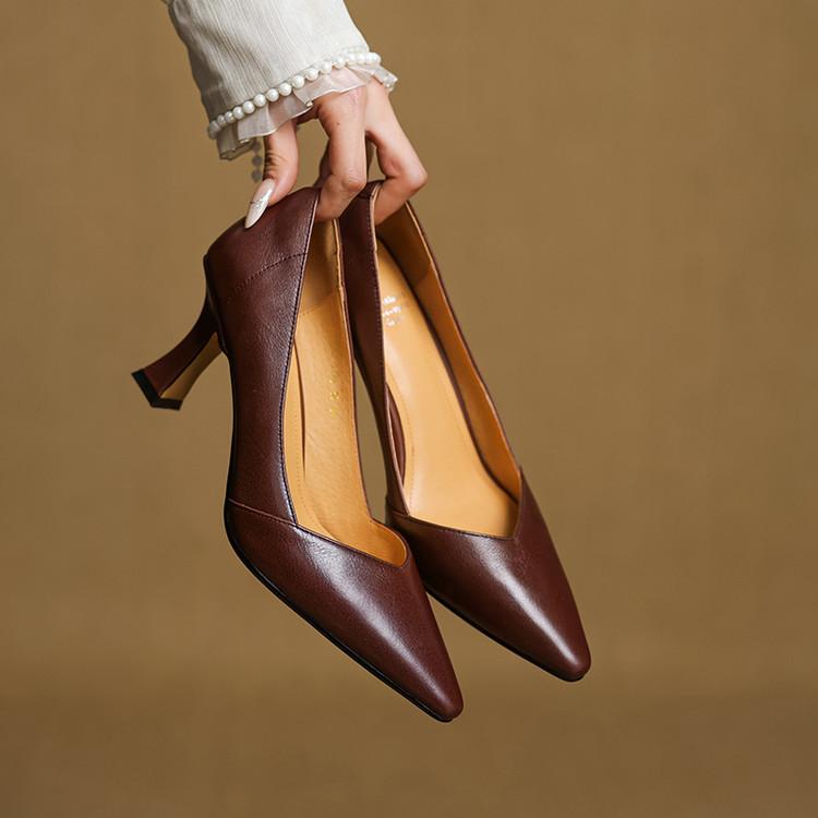 Zapatos de Cuero Pequeños de Tacón Grueso Cómodo de Punta para Mujer, Moda Nueva, Talla Grande, Escote Bajo, Tacones Altos Poco Profundos