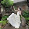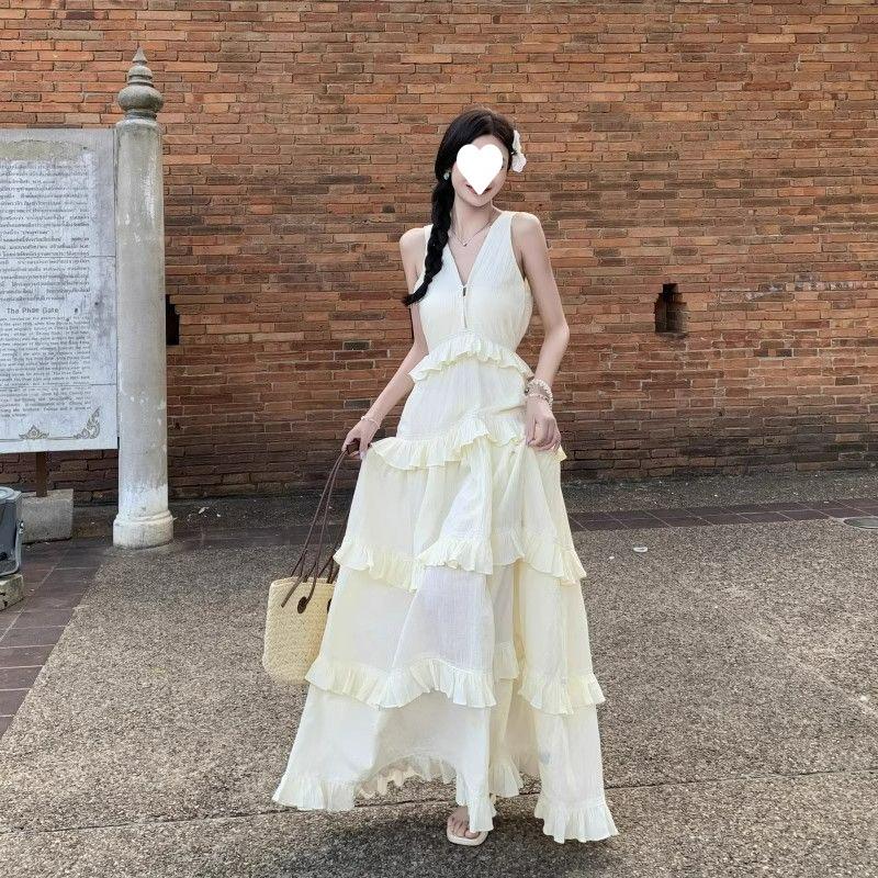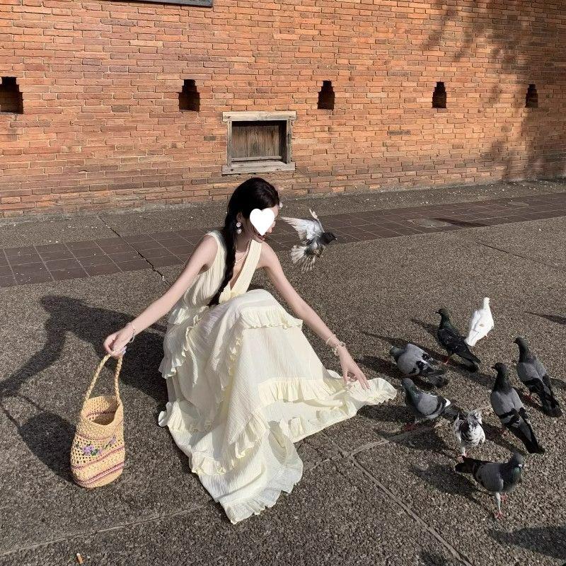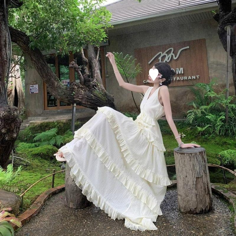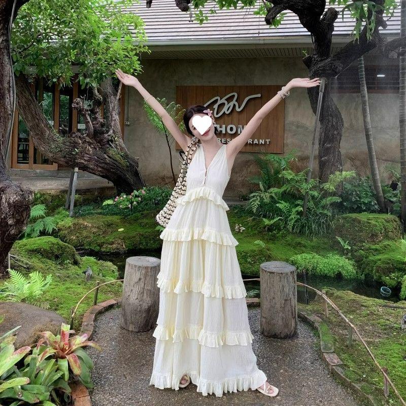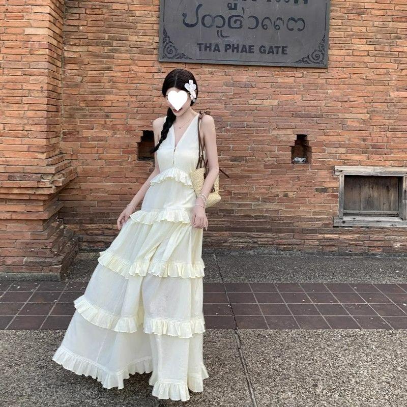 Vestido de Pastel Vacacional Suave de Estilo Francés para Mujer, Estilo Deseo Puro de Verano con Bordes con Volantes, Elegante Vestido Largo sin Espalda